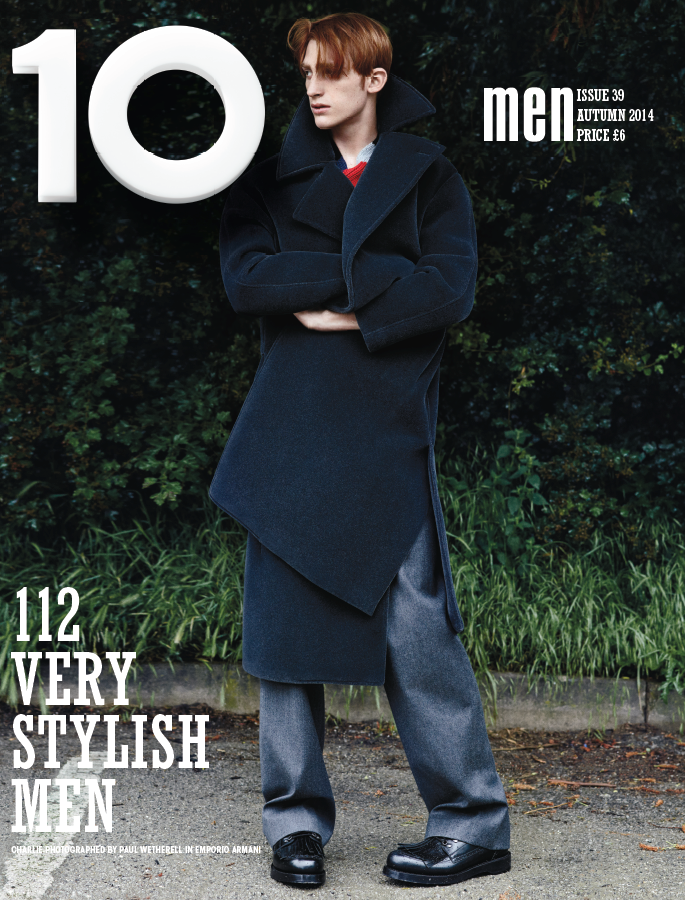 Oversized Fall-British fashion magazine 10 Men looks to the fall/winter 2014 collection of Emporio Armani to provide the look for its latest cover. Model up and comer Charlie Ayres-Taylor wears an oversized coat with a stunning collar for the cover shot by photographer Paul Wetherell. The gorgeous coat finds an equal match in a pair of relaxed trousers that feature a baggy fit. / Styling by Mattias Karlsson. Grooming by Matt Mulhall.