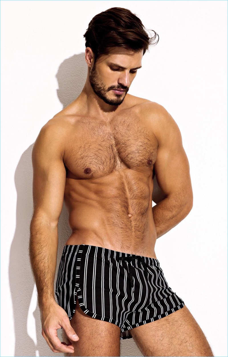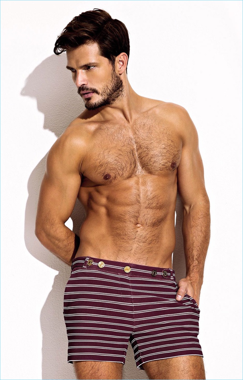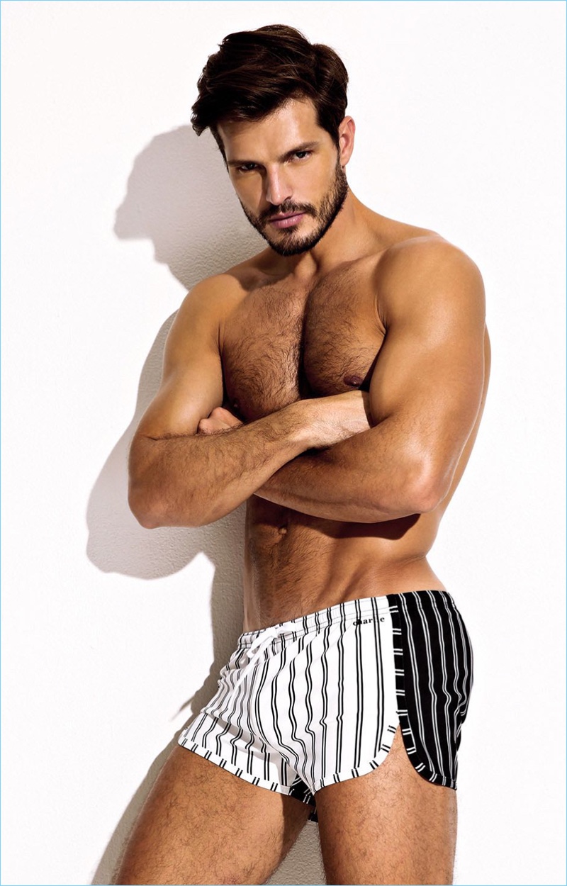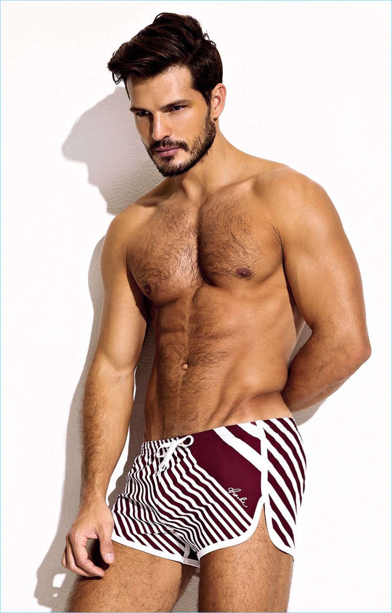 Front and center, Diego shows off the label’s mix of swimsuits, classic board shorts, and runner-inspired swim shorts. In addition to solid styles, Charlie offers a play on pajama stripes. The brand also introduces texture with its mesh and foil gold accented swimwear.