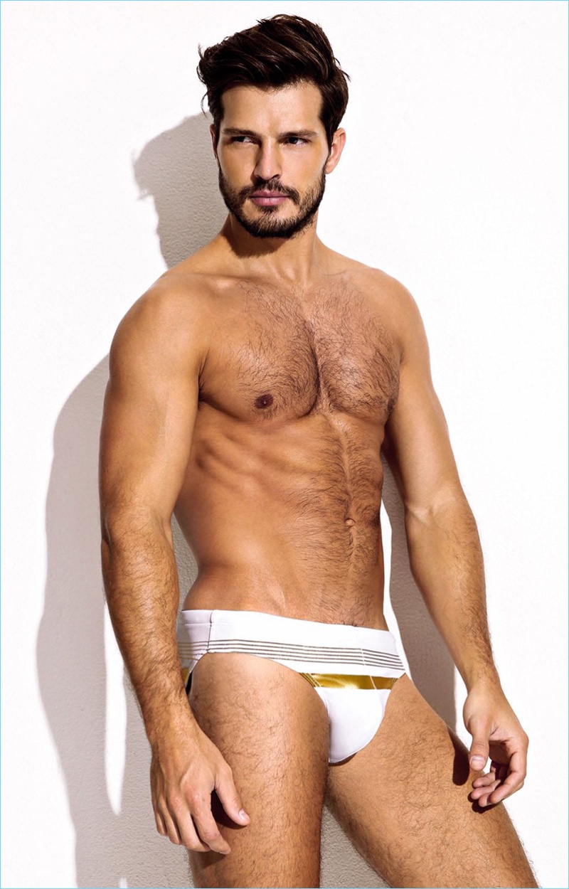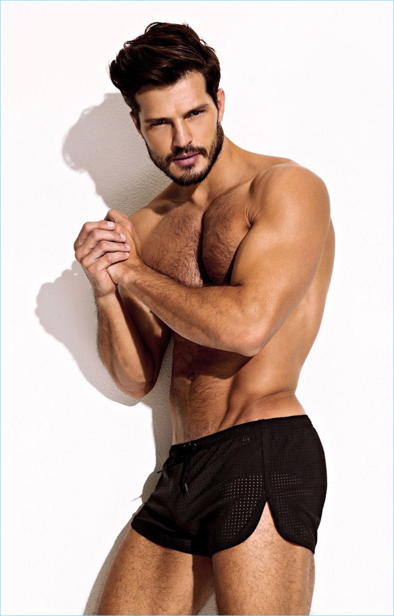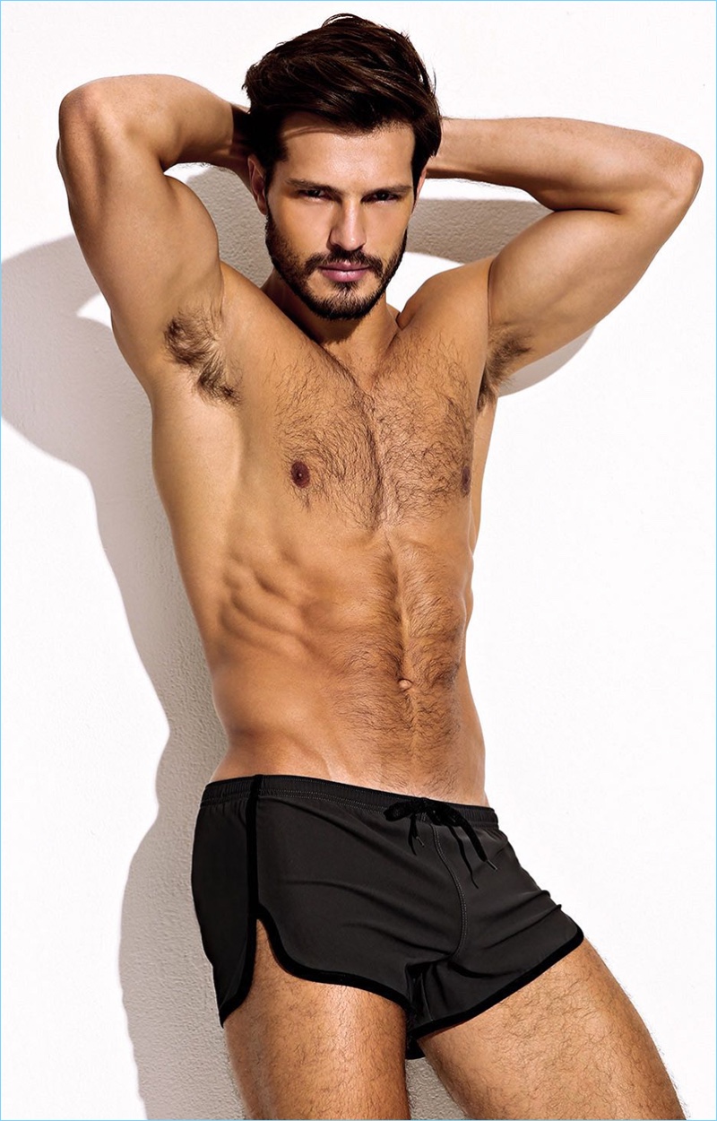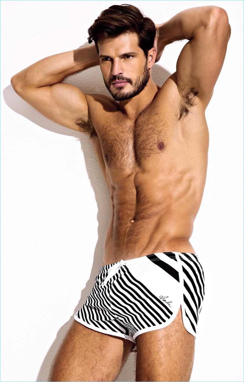 Front and center, Diego shows off the label’s mix of swimsuits, classic board shorts, and runner-inspired swim shorts. In addition to solid styles, Charlie offers a play on pajama stripes. The brand also introduces texture with its mesh and foil gold accented swimwear.