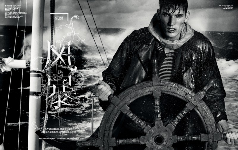 Setting a Course–One of spring’s biggest trends is surely the nautical world, incorporated and revisited by many designers for their spring collections. To capture this seasonal trend, the spring/summer 2013 issue of GQ Style China features a striking story, lensed by Giampaolo Sgura (Close Up), starring 2Morrow models Chris Bunn and Dominik Bauer. Fashion editor Grant Pearce dresses the pair in nautical inspired designs, where classic sailor stripes and waterproof garments, are combined with vibrant color, metallic reflections and techno fabrics. Facing a violent storm on the high seas, the boys get on the ball, wearing pieces from the likes of Dior Homme, Emporio Armani and others. / Hair by Andrew Guida (Close Up). Makeup by Jessica Nedza (Close Up).