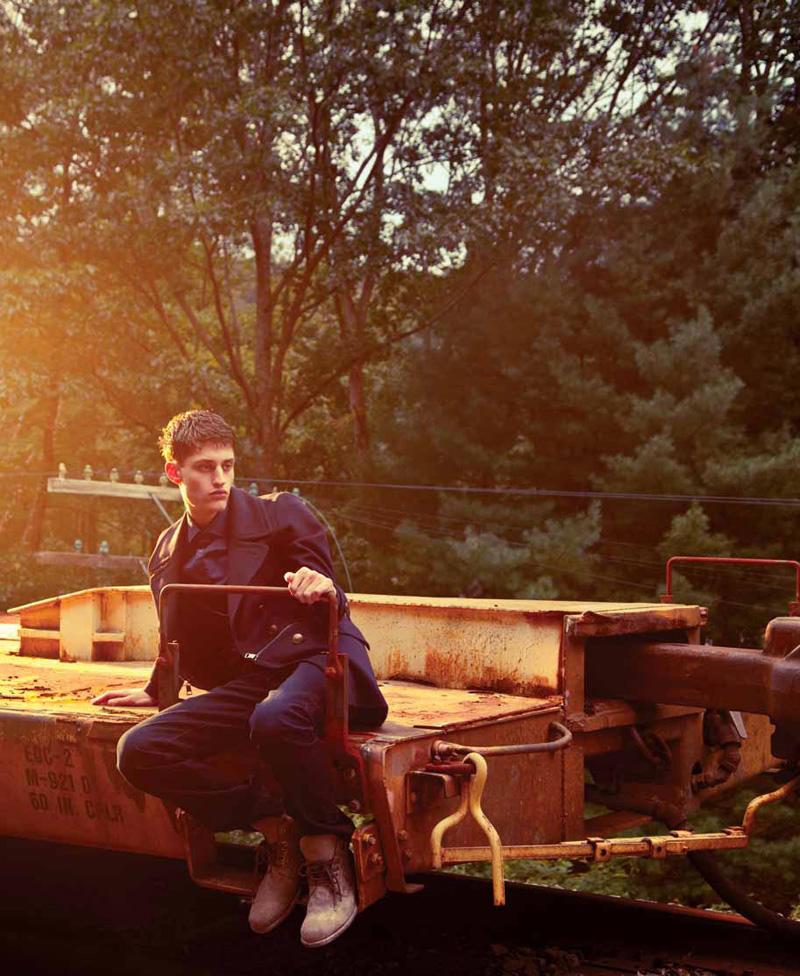 Chris Winters steals a moment by the tracks for a story in Florida International’s recent issue, lensed by Danny Miller. Donning a military-inspired wardrobe styled by Sandra Benbaruk, the Red model wears editorial staples from labels including Burberry Prorsum and Louis Vuitton.