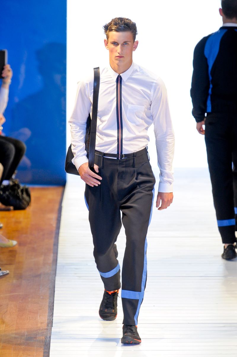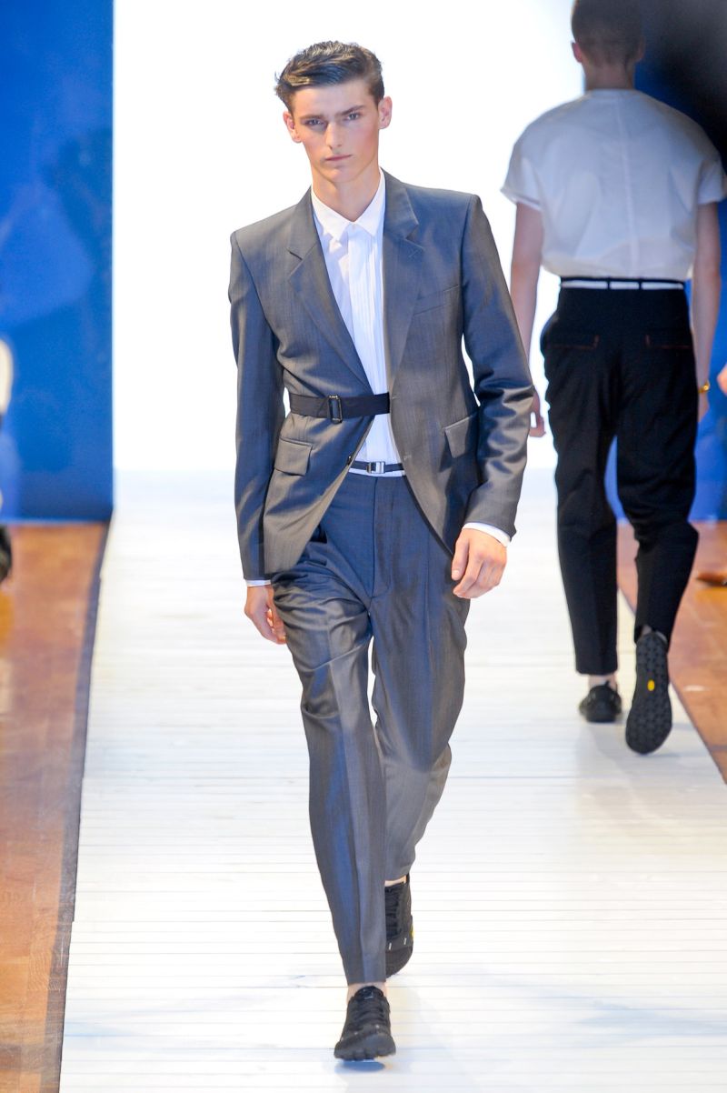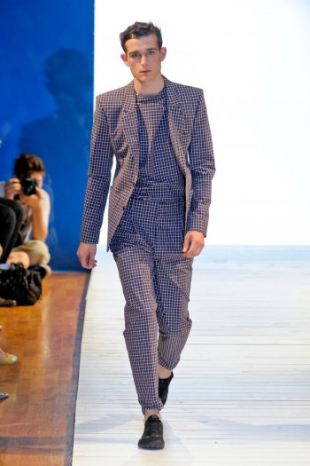 Season Race–Armed with cheerful colors and engaging prints, Christian Lacroix designer Sacha Walckhoff presented a laid-back approach to the season. Racing forward, the men of the French brand had a certain lightness and free spirit about them. Large breathable t-shirts with rolled sleeves reigned and trousers boasted graphic bars. Outerwear was belted in for the ride ahead and fun, bold prints released an almost retro attitude that was entirely charming. Paired with unassuming trainers, Christian Lacroix’s collection showcased a man who can change lanes between casual and formal, never losing a sense of style and spontaneity.