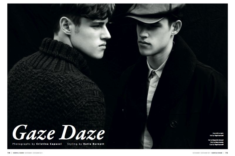 Gaze Daze–Photographer Cristina Capucci rounds up a model troop composed of Christian Plauche (VNY), Eric Puzio (Red), Justin Passmore (Red), Roy Pratt (Request), Paul Boche (Fusion), and twins Jordan and Zac Stenmark (Red) for a spread in Essential Homme. The boys don an array of sleek pieces from labels including Emporio Armani, Burberry and DKNY as styled by Katie Burnett for an eccentrically streamlined photo shoot. / Hair by Martin-Christopher Harper (Kate Ryan) for Bumble & Bumble. Makeup by Belinda Zolla (Kate Ryan).