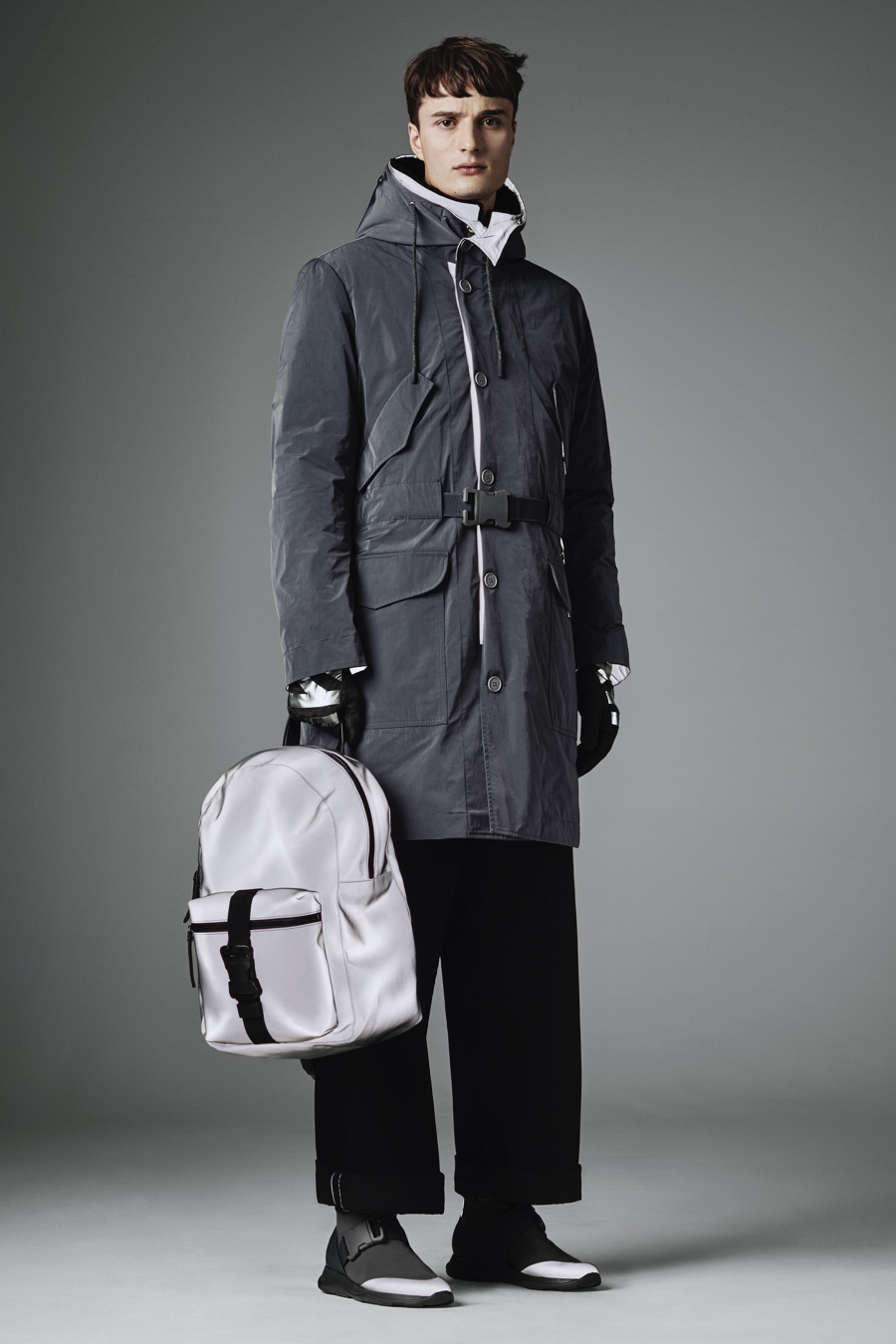 Model Almantas Petkunas is belted into an oversized jacket from Christopher Kane’s fall-winter 2016 men’s collection.