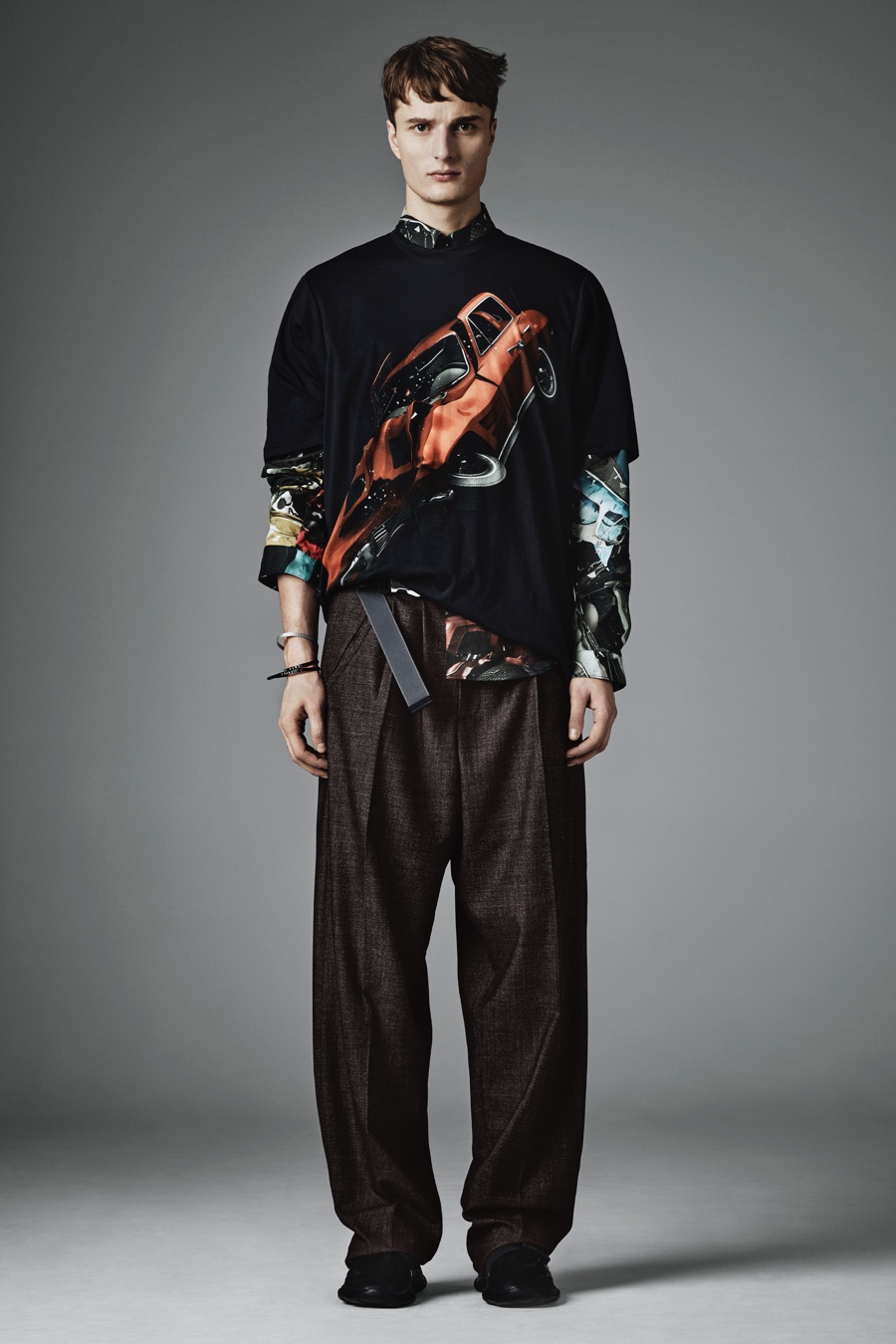 References to the street result in a mix of sportswear and workwear-inspired fits. Here, oversized baggy silhouettes borrow from the signature shapes of Japanese designers. Relaxed denim jeans and loose, straight-cut trousers are paired with sweatshirts and jacquard knits. Meanwhile, car culture dominates the collection’s graphic prints. A ‘car crash’ motif is accented by extra-long belts that double as seatbelts.