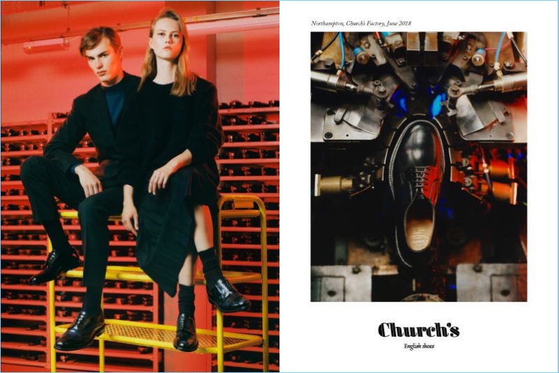 Kit Butler returns as the face of Church’s. The British model visits Church’s factory in Northampton, England for the brand’s fall-winter 2018 campaign. Scandebergs photographs Kit alongside Julie Hoomans for the season. Meanwhile, Pau Avia styles the pair. Front and center, Kit sports sleek looks that complement Church’s classic footwear. The top model dons leather boots and dress shoes.