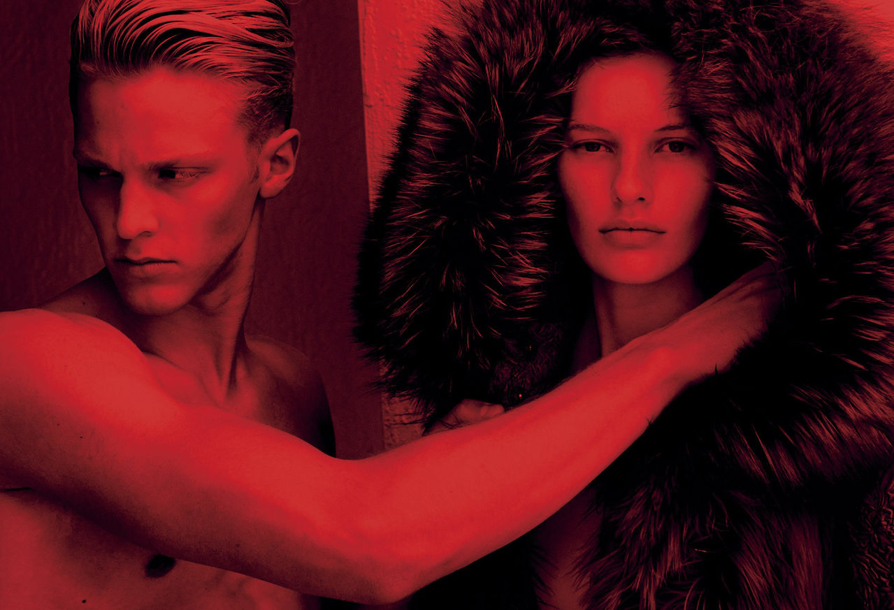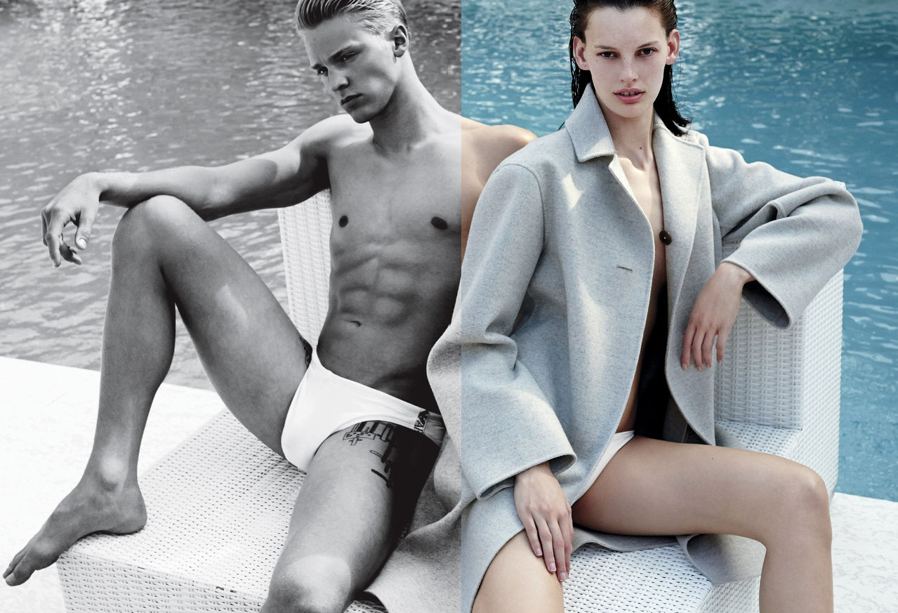 Summer Forecast-After appearing in the newly released Calvin Klein fall 2014 ads, impeccably dressed in winter fashions, model Clark Bockelman moves to an essential wardrobe for V Magazine’s cover story. Captured poolside by Mario Testino, Clark is styled by Sarajane Hoare, who’s definitely an easy job this time, outfitting the blond model in black and white speedos from Emporio Armani and Rufskin’s summer collections. / Hair by Courtney Perkins. Makeup by James Pecis.