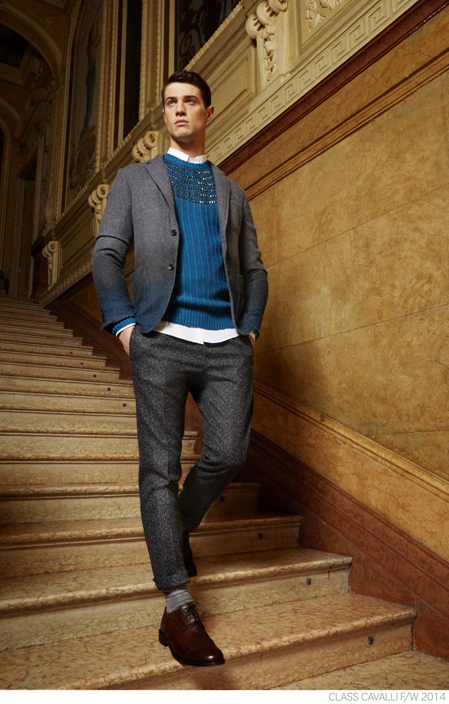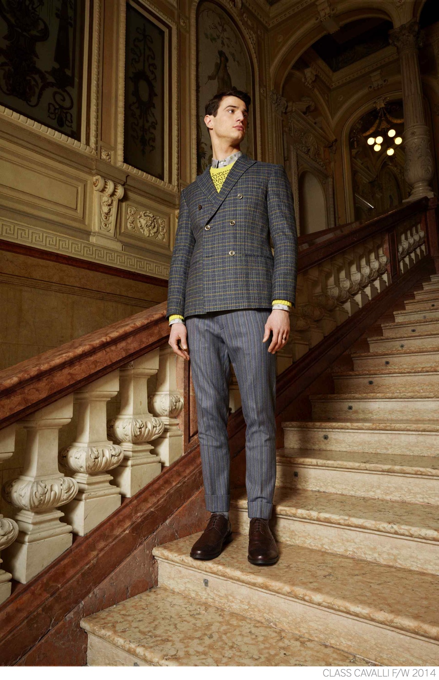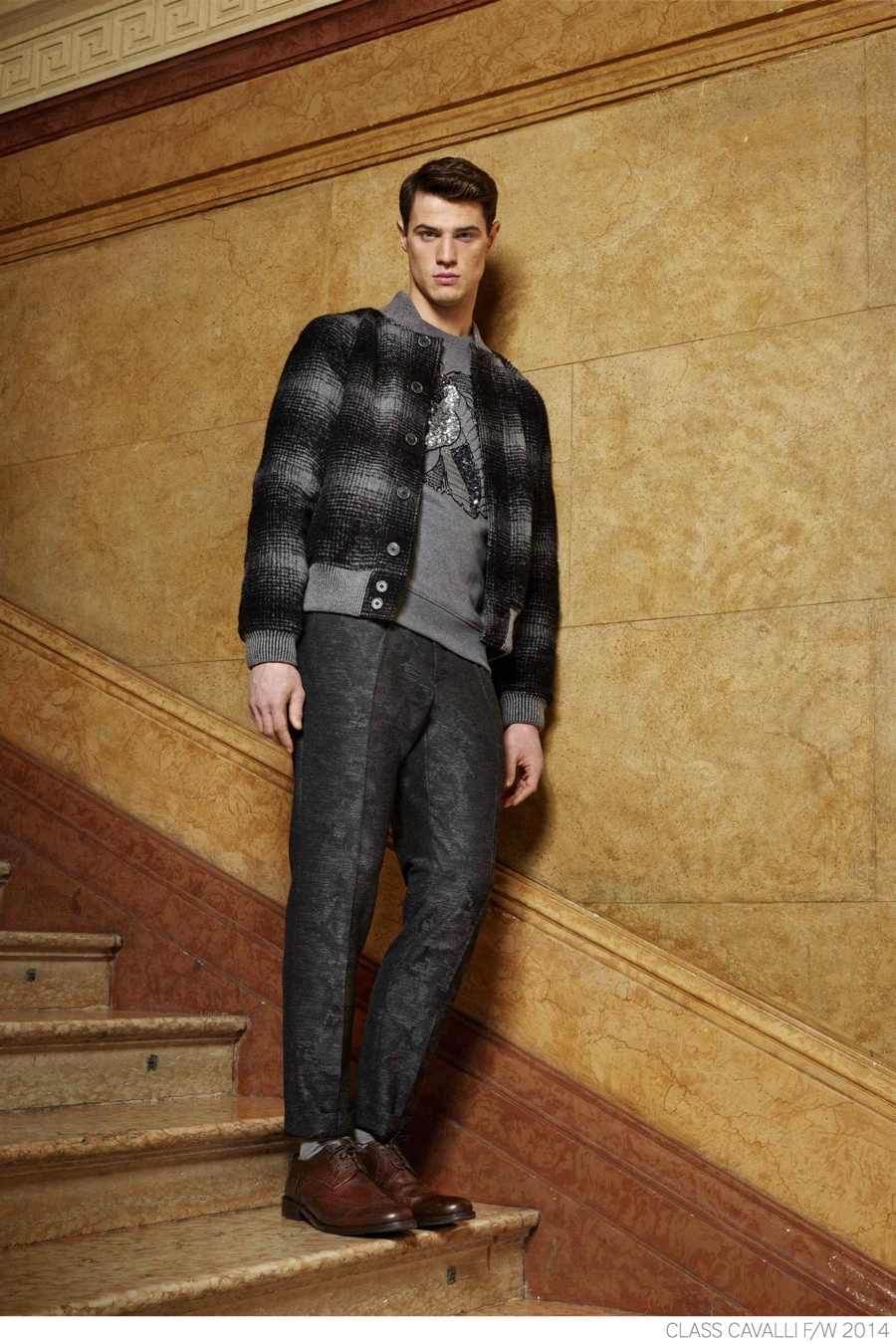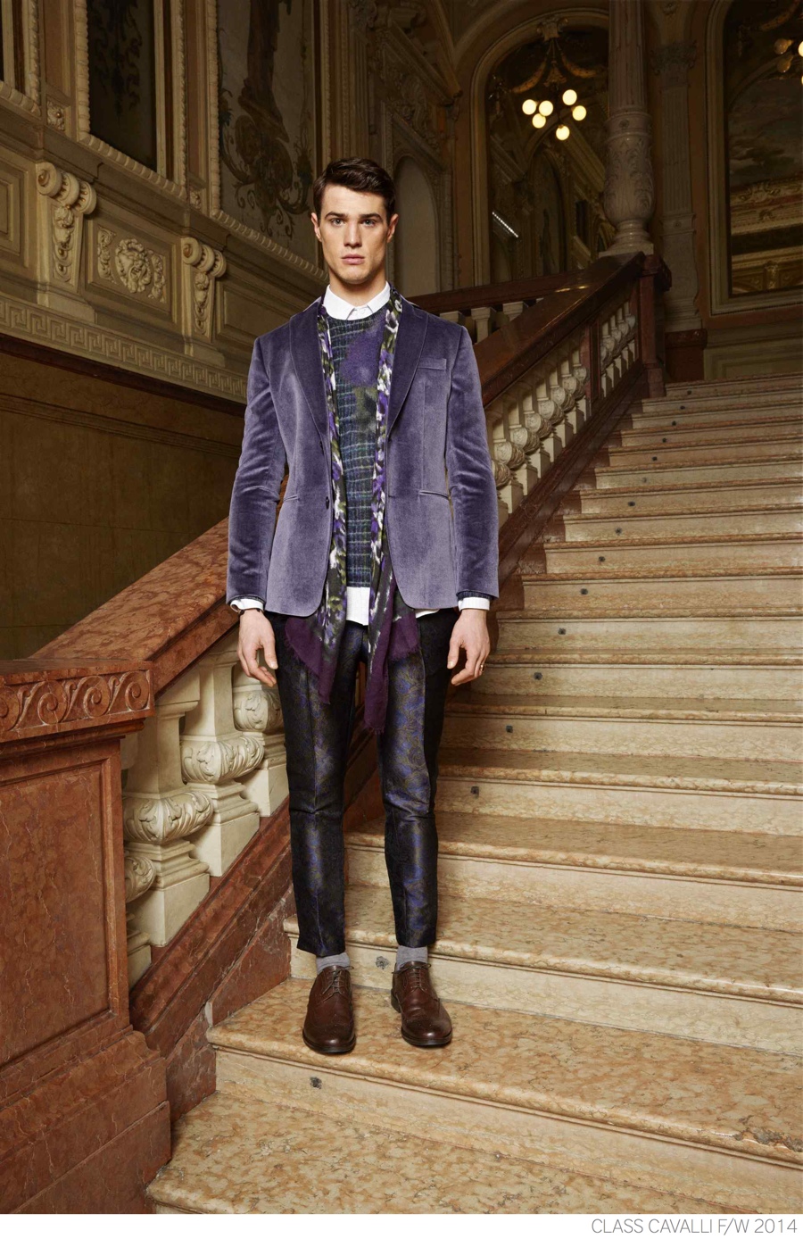 New Wave-Italian label Roberto Cavalli has launched the fall/winter 2014 collection of its Cavalli Class line, which shows off modern and eye-catching silhouettes, embellished with luxurious details. Model Andy Walters is tapped for the newly released lookbook images that feature designs that find inspiration in opposite worlds, like the rebellious rock & roll attitude and the ultra-glamorous dandyish style. From luxurious textured coats with fur details to sartorial velvet jackets, Class Cavalli’s collection finds time to explore and reinvent the iconic rebel figure, with bold leather jackets and skinny printed jeans.