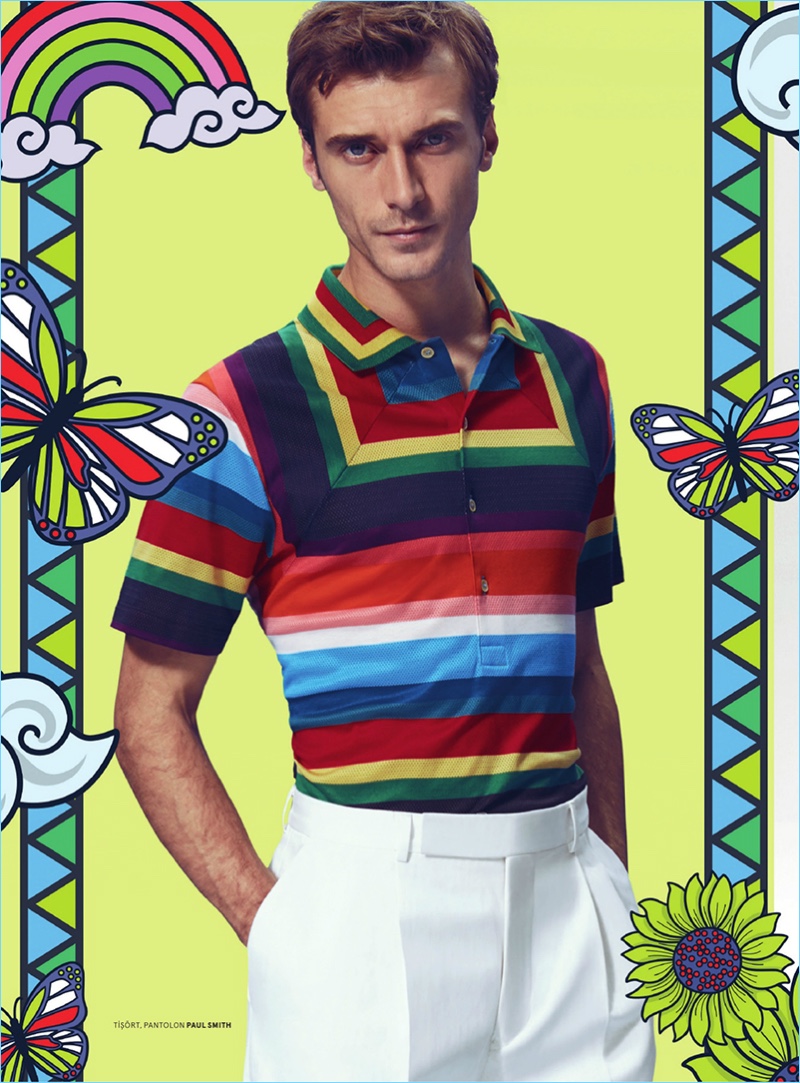 PinClément Chabernaud dons a colorful polo and white trousers by Paul Smith.