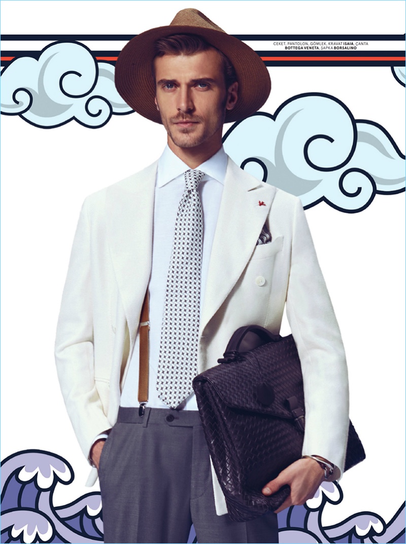 PinBeymen taps Clément Chabernaud for its spring 2017 outing, which features a Kiton look with a Borsalino hat.