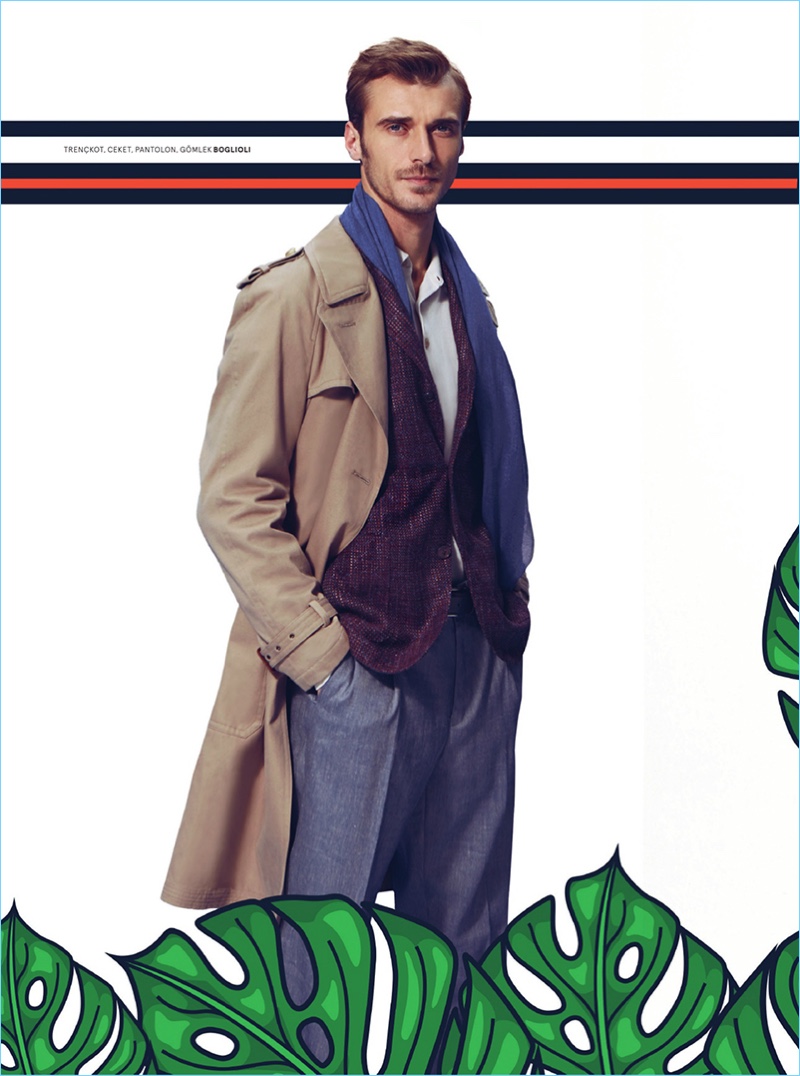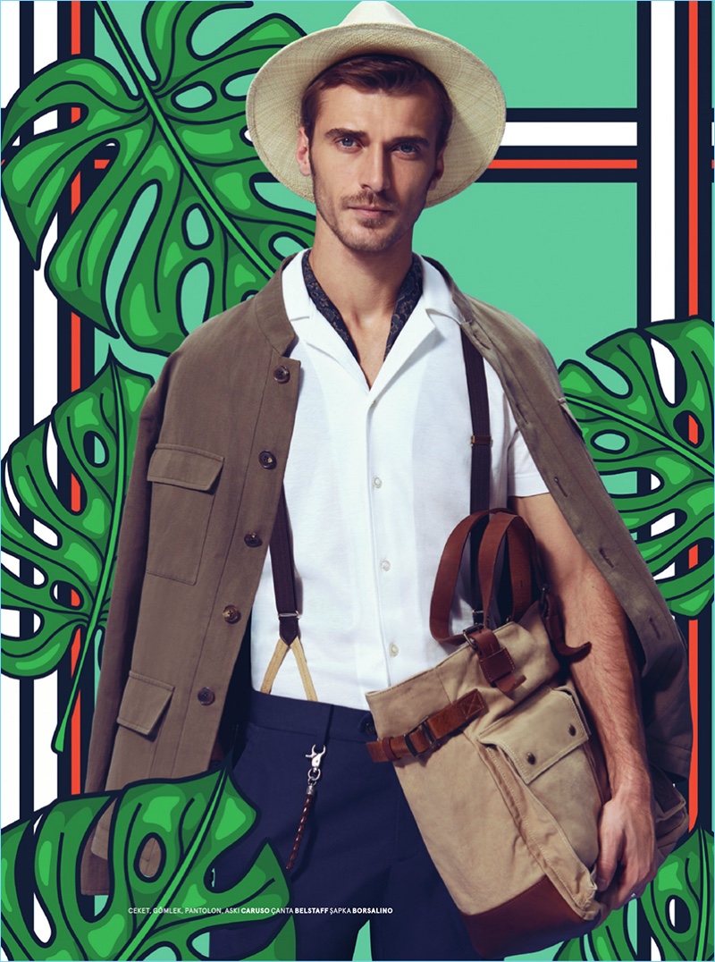 PinCharming in a sharp look by ISAIA, Clément Chabernaud accessorizes with a Bottega Veneta bag and Borsalino hat.PinSafari chic, Clément Chabernaud wears a field jacket look by Ermenegildo Zegna. The French model also takes hold of a Belstaff bag.PinMixing prints, Clément Chabernaud wears fashions from Academia.PinTapping into a retro flair, Clément Chabernaud wears Valentino fashions with a Borsalino hat.