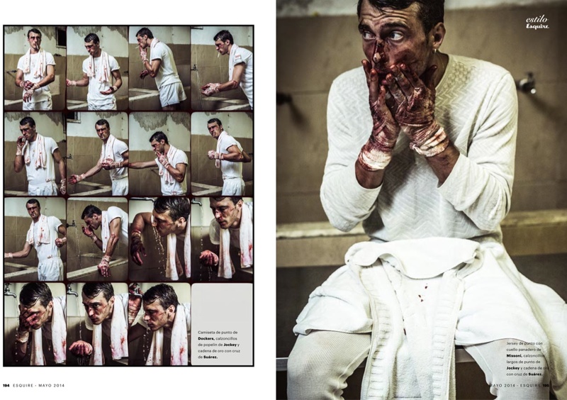 Blood, Sweat & Fashion–Esquire España doesn’t hold back in the model talent department when it comes to its May issue. Enlisting top models Clement Chabernaud and Alexandre Cunha, the magazine commissions photographer Alfonso Ohnur for a story. Embracing an athletic theme, it’s a boxing match between Clement and Alexandre as they are styled by Berta Alvarez. Working up a sweat and showing bloody bruises after a couple of punches, the pair square off in styles from Prada, Gucci and other fashion houses.