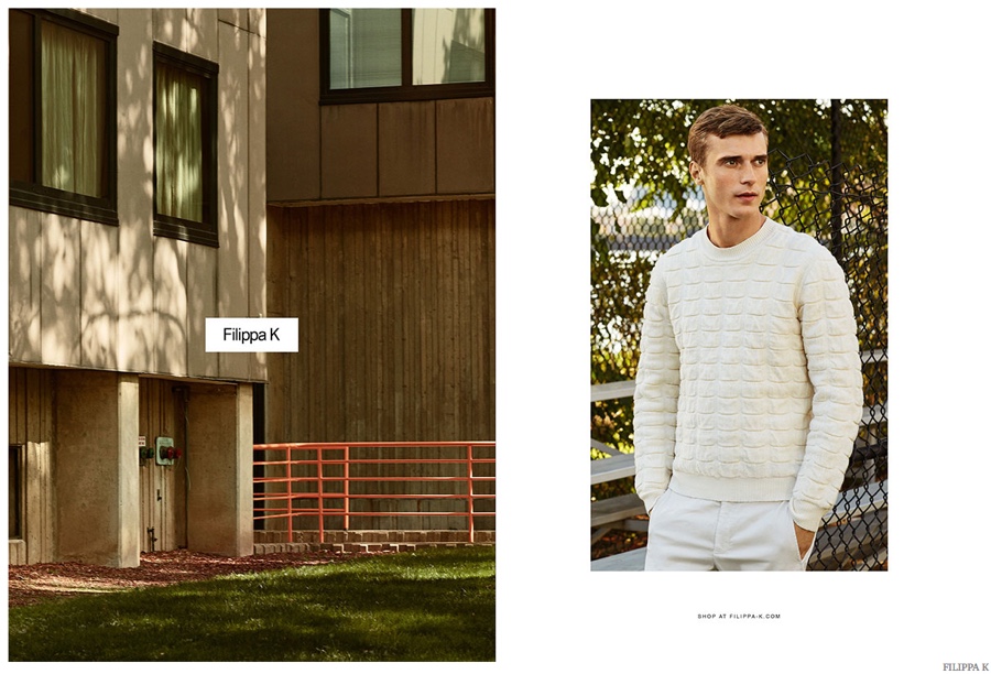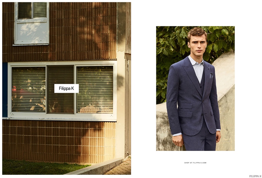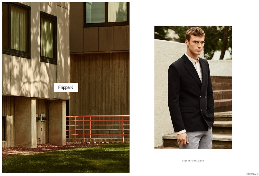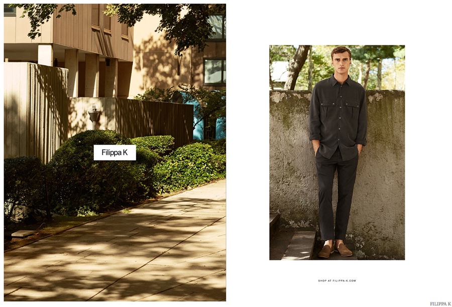 Photographed by Maciek Kobielski, French model Clément Chabernaud stars in the spring-summer 2015 advertising campaign of Filippa K. Heading outdoors for casual images, Clément dons impeccable tailored suits as well as chic casual pieces that include a serene cream colored pullover and an oversized button-down.