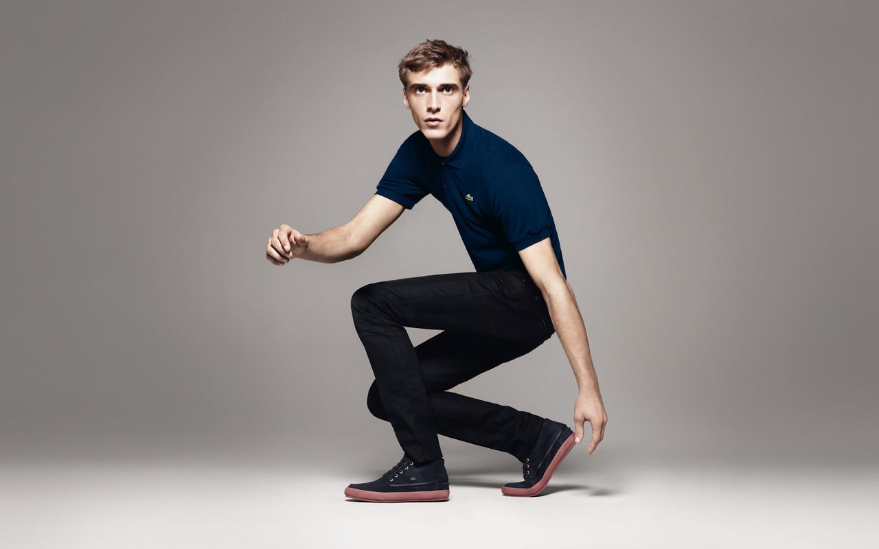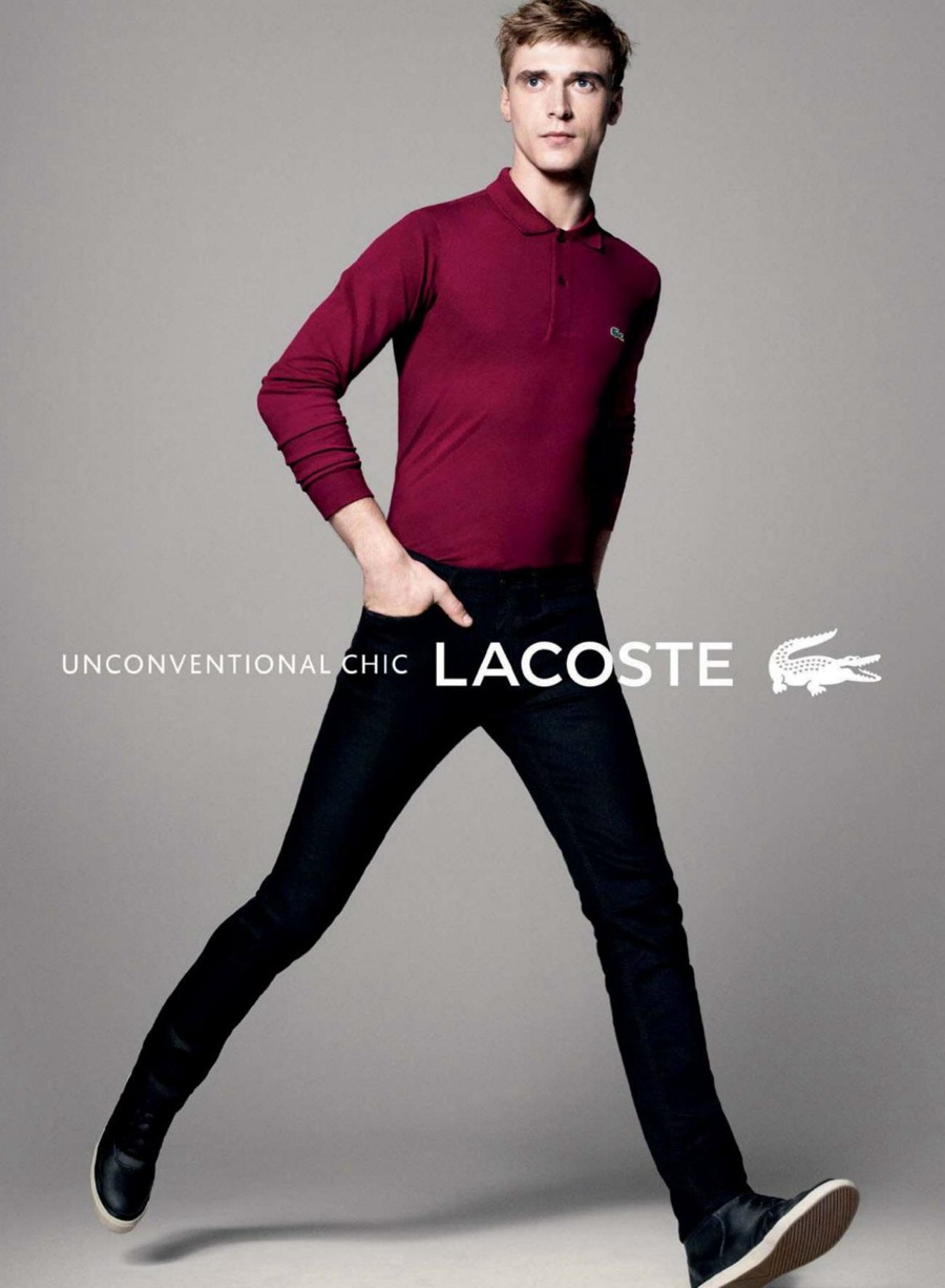 Dynamic Attitude–Photographed by David Sims, French leading model Clément Chabernaud gets ready to spend a new season as the favorite male face of Lacoste, as seen by the new advertisements released by the brand. Celebrating eighty years in the market, Lacoste embraces once more its Unconventional Chic motto for the new campaign, lensed in a bare grey studio. Wearing skinny jeans and Lacoste’s signature polo shirts in rich colors, Clément is a dynamic vision of effortless style.