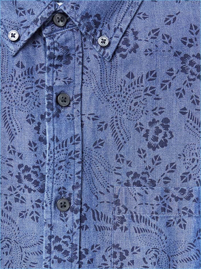 A sleek vision, Alexander Beck dons a Club Monaco denim twill topcoat, floral shirt, slim-fit vintage denim jeans, and a wool zip cardigan.Pin