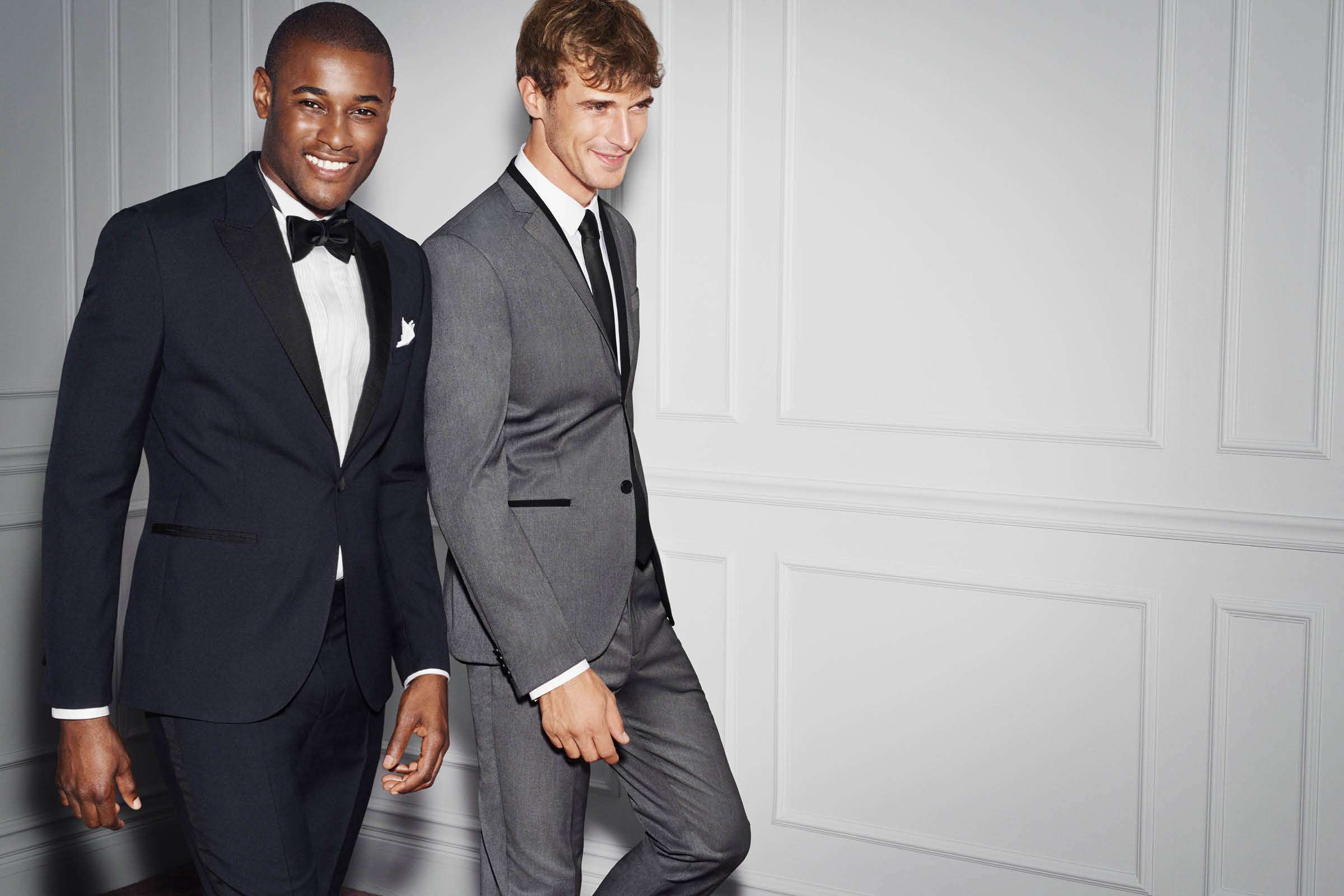Trim, tailored dinner jackets, skinny ties, and bow-ties paint a dapper picture for evening wear, while the informal cocktail can go any way. Here, H&M presents a velvet jacket in midnight blue as well as a trendy polka-dot shirt. The must-have shirt is paired with gray skinny jeans and a double-breasted jacket. Modern elements are also added to the dressy wardrobe with a leather lapel jacket and detailed t-shirt.