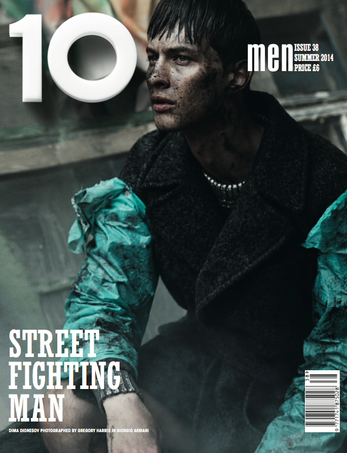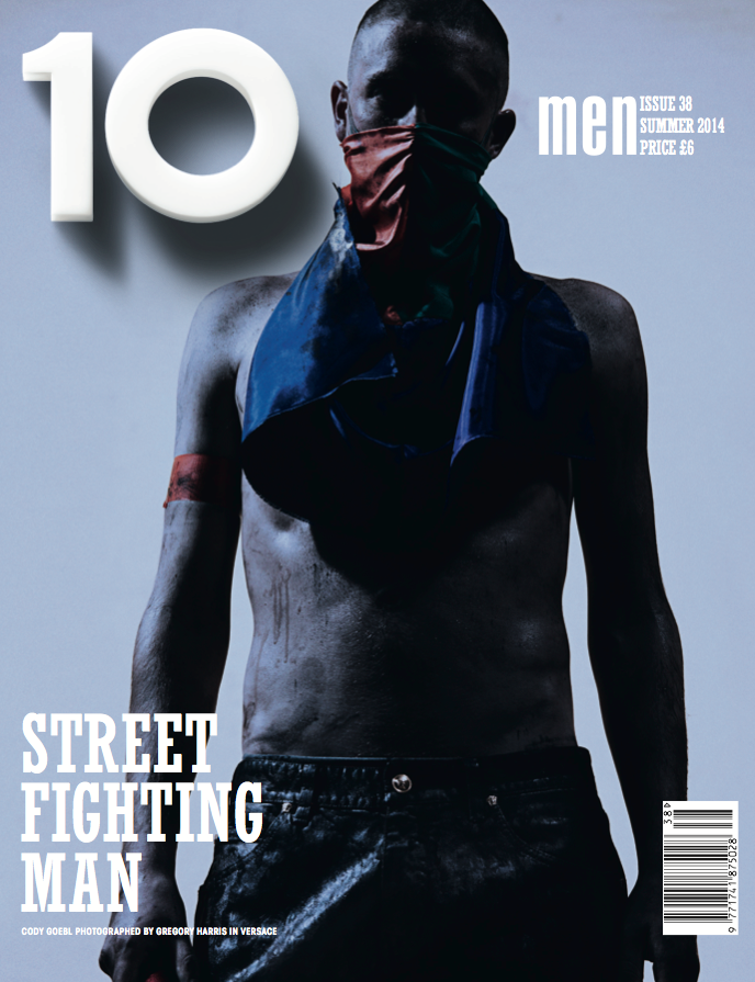 Street Fighting Man–Photographer Greg Harris reunites with British magazine 10 Men to shoot two covers for its spring/summer 2014 issue. Embracing a militant theme, models Cody Goebl and Dima Dionesov are captured in dark repurposed looks. While Cody wears leather pants from Versace, Dima dons a coat from Giorgio Armani.