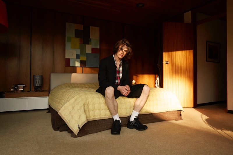 Model Liam Gardner rocks a J.W. Anderson shirt and shorts for Coggles' spring-summer 2019 campaign.Pin