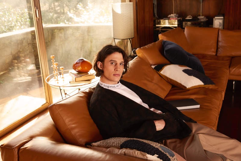 Relaxing, Liam Gardner sports a Neil Barrett shirt for Coggles’ spring-summer 2019 campaign.