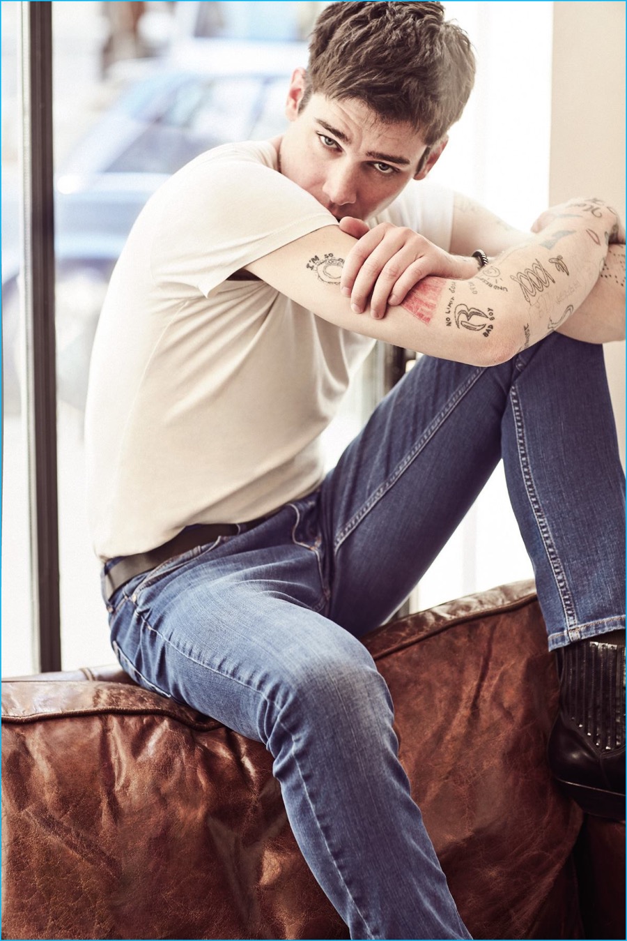 Cole Mohr relaxes in a classic t-shirt and distressed denim jeans for Koton Jeans’ spring-summer 2016 campaign.