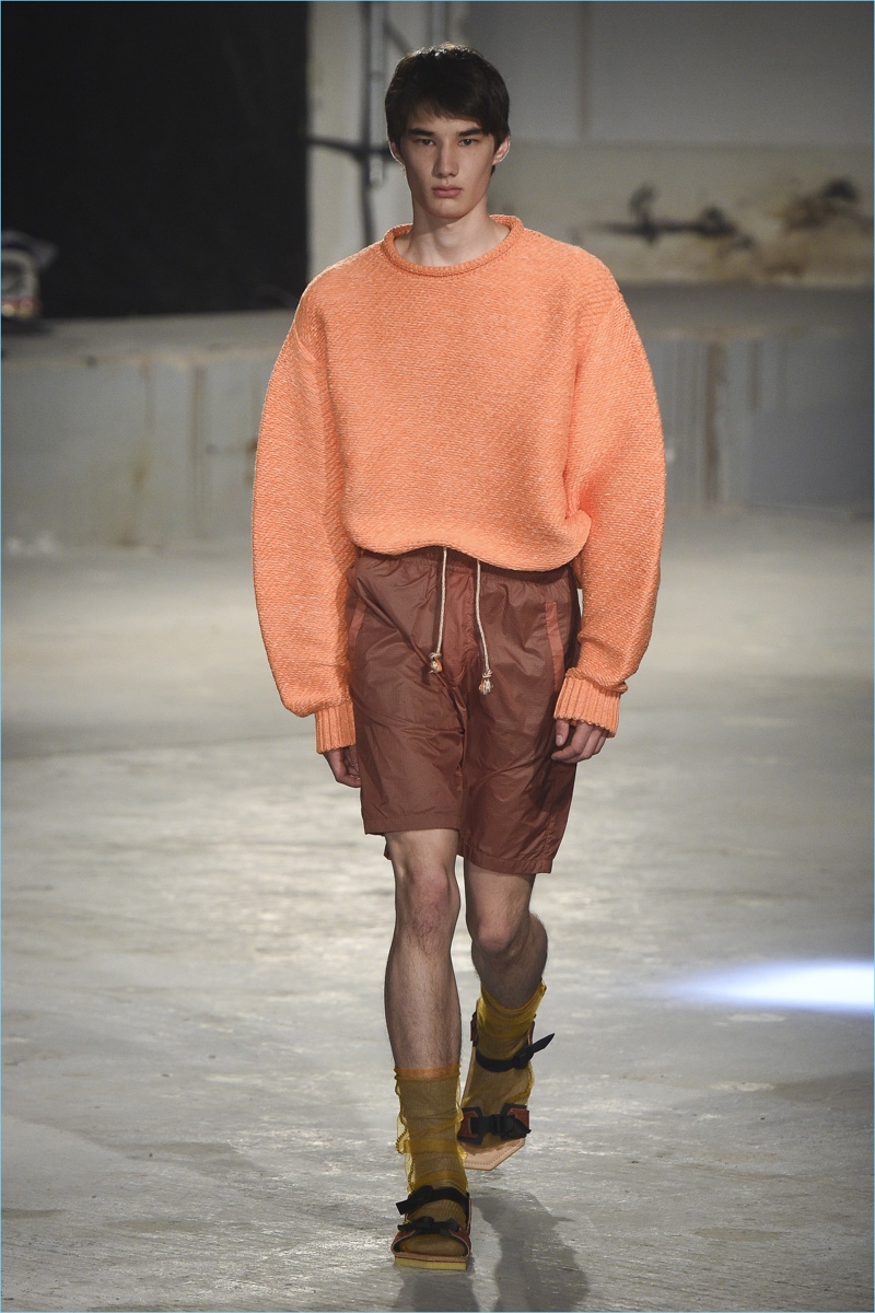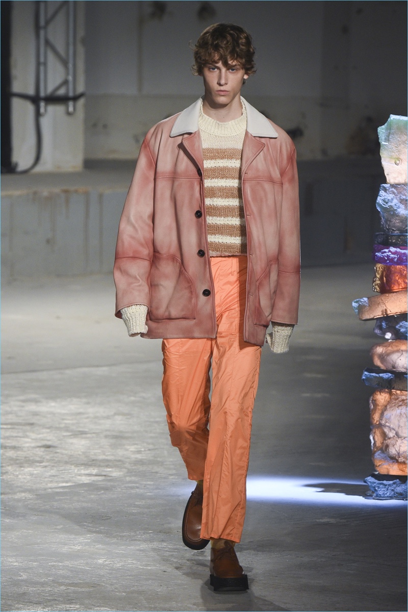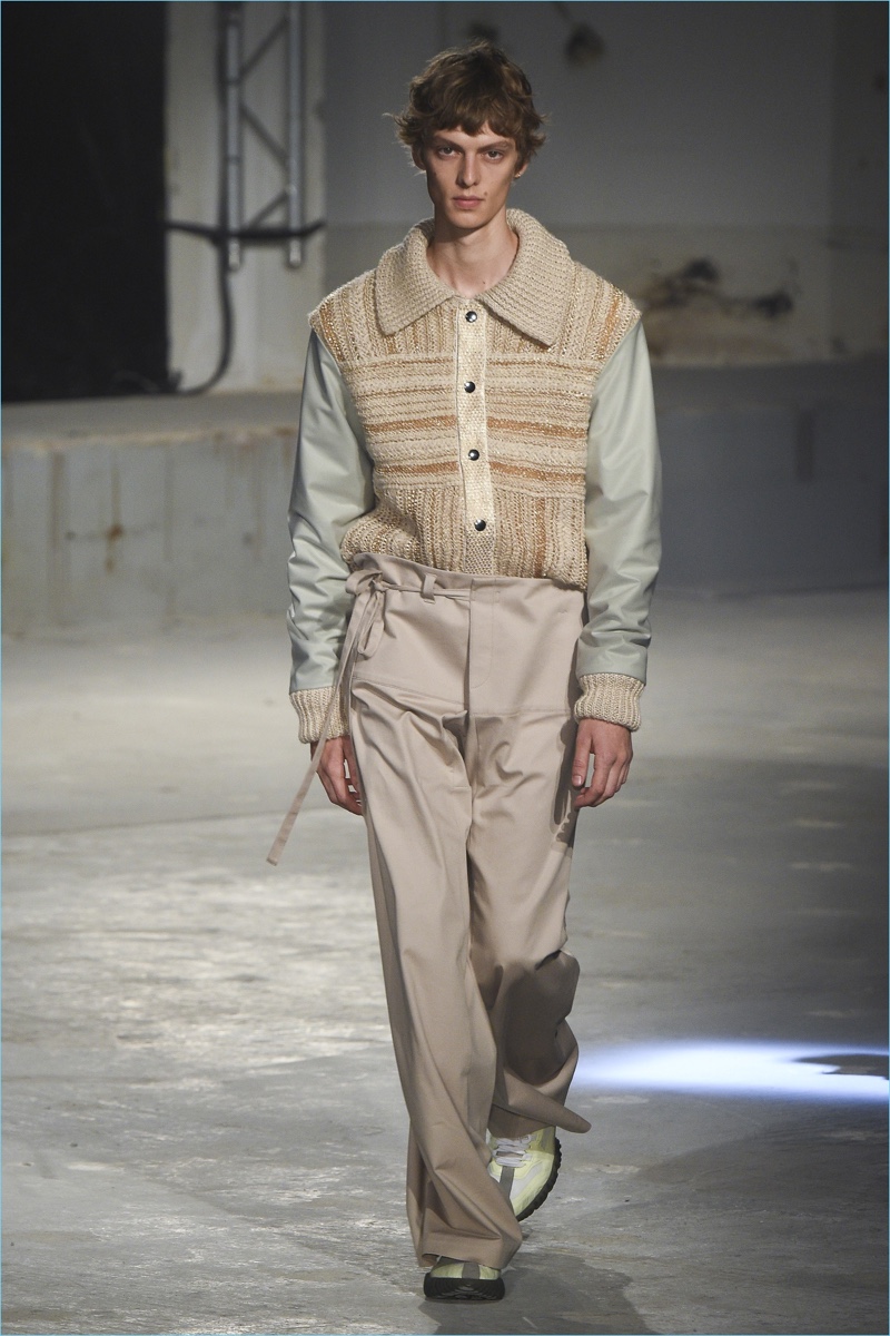 An unlikely color palette comes together for the season as Johansson dissects and reassembles menswear. Details emerge such as a fringed coat that brings to mind a winter scarf or a translucent shirt that may double as a jacket. Additional statements included a weathered leather jacket and knit sweater with bomber sleeves.