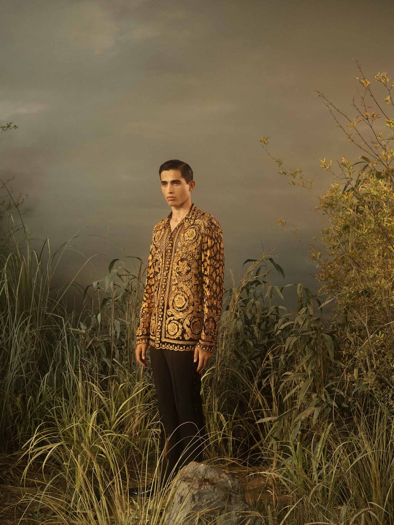 Atelier Versace presents its fall-winter 2019 men’s collection. The Italian label draws inspiration from the American West, juxtaposing it with references to pop art and Fauvism. Posing in a field, model Ismaël Choron stars in the season’s lookbook. He connects with photographer Casper Sejersen. Front and center, Ismaël dons extravagant pieces made by hand at Versace’s Milanese atelier. Embellished jackets, both casual and formal, come together with equally print-savvy shirts. Sparing no bold statement, Atelier Versace’s signature use of intricate prints is embraced for coordinated shirts and pants.