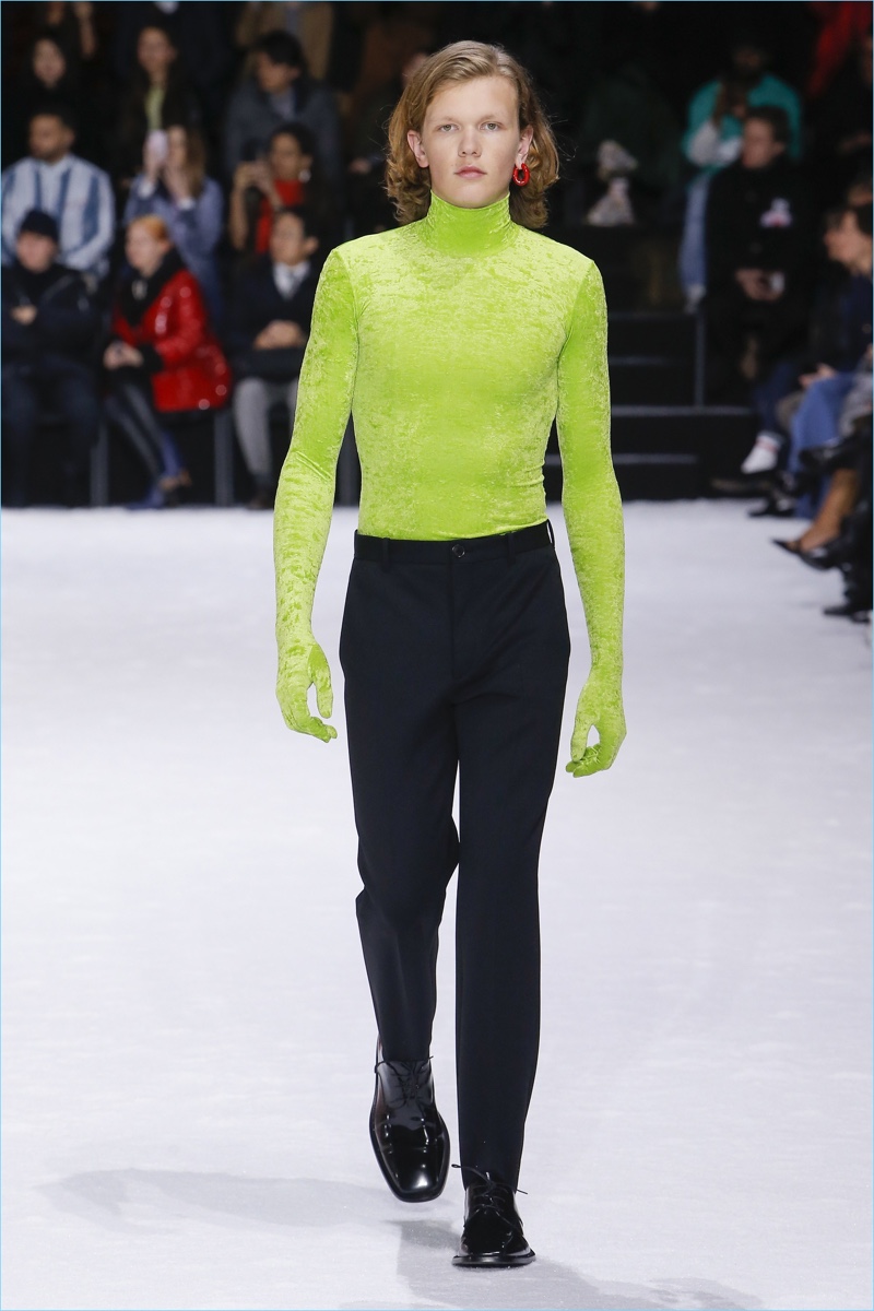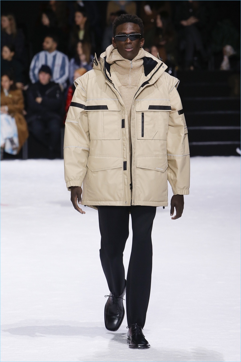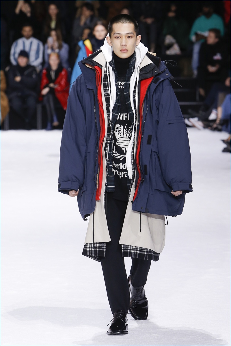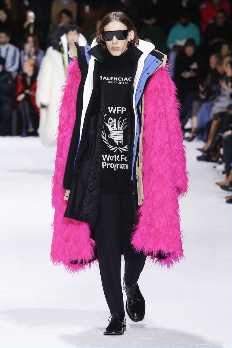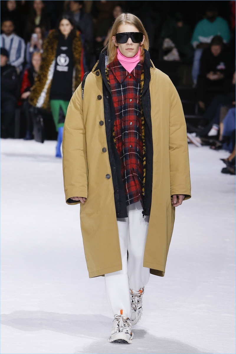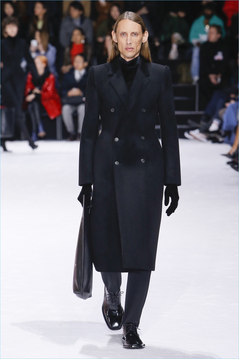 Demna Gvasalia follows the progression of the Balenciaga man for fall-winter 2018. The designer revisits the design codes of Cristóbal Balenciaga and transitions into his own aesthetic for the fashion house. Set against a snowy winter landscape, Gvasalia braces his man for the cold. Body-hugging turtlenecks open up to jackets and coats that pinch at the waist. Meanwhile, the initial formality of the season gives way to Gvasalia’s nostalgic approach towards streetwear. Nineties vibes reign as the designer embraces a vintage-like attitude. It’s here that oversized shirt jackets join layers of tees, sweaters, hoodies, and parkas. For footwear, the Balenciaga man is treated to retro-style sneakers and classic leather dress shoes.