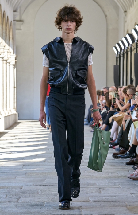 You’re immediately drawn to the sculpted leather coats and jackets—slick and deliberately worn-looking—reminiscent of mid-90s Helmut Lang but with a contemporary twist.