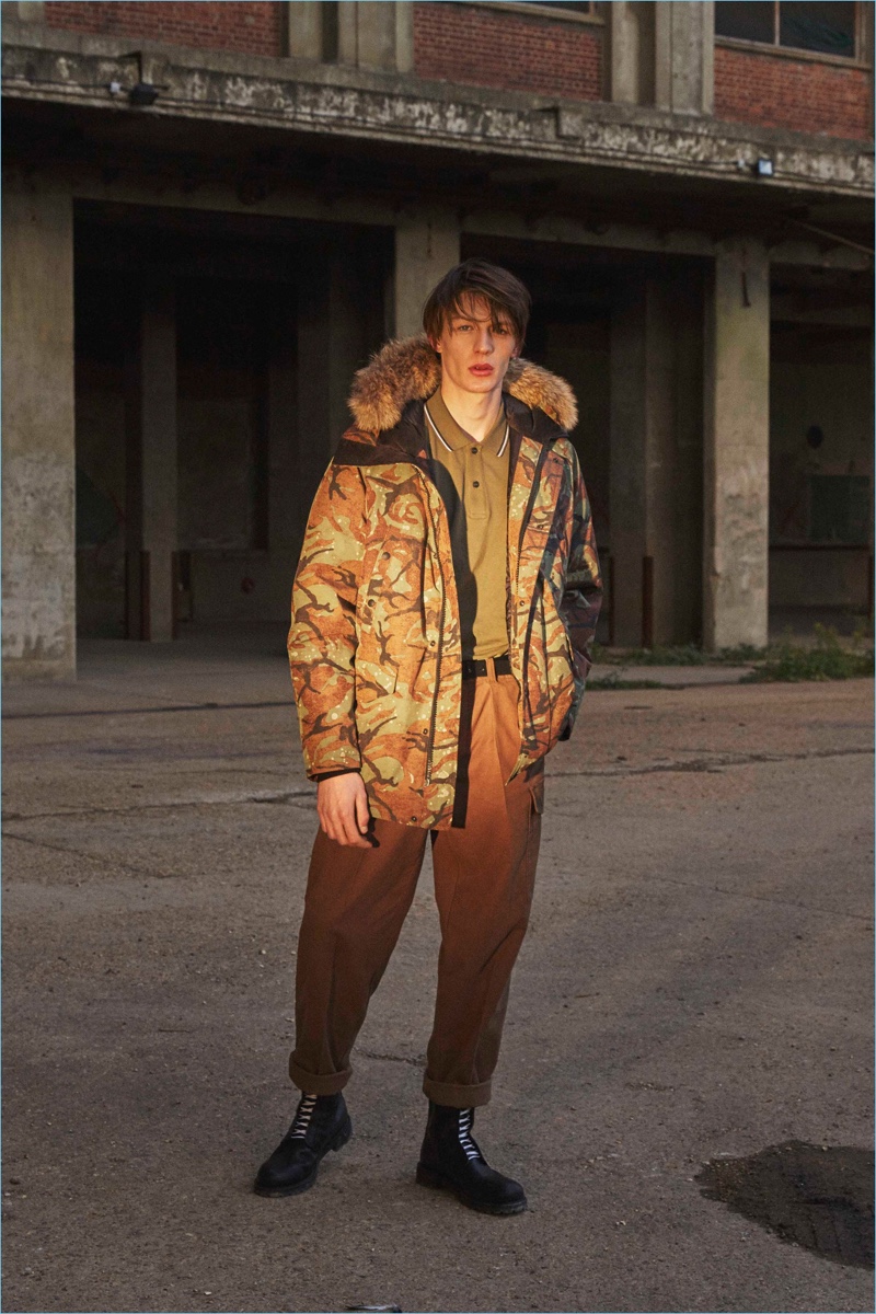 Belstaff presents its fall-winter 2018 collection. The brand revisits its rich history as well as its British roots. 1950s youth movements and subcultures serve as inspiration for the season. Military references come together as Belstaff serves up khaki shades and its fair share of tapered trousers. However, the biker is represented as well with zipper adorned denim and leather jackets. 2018 also marks the 70th anniversary of Belstaff’s iconic Trialmaster jacket. Therefore, the label revisits its signature style in a coated cotton with reflective stripes and badges.