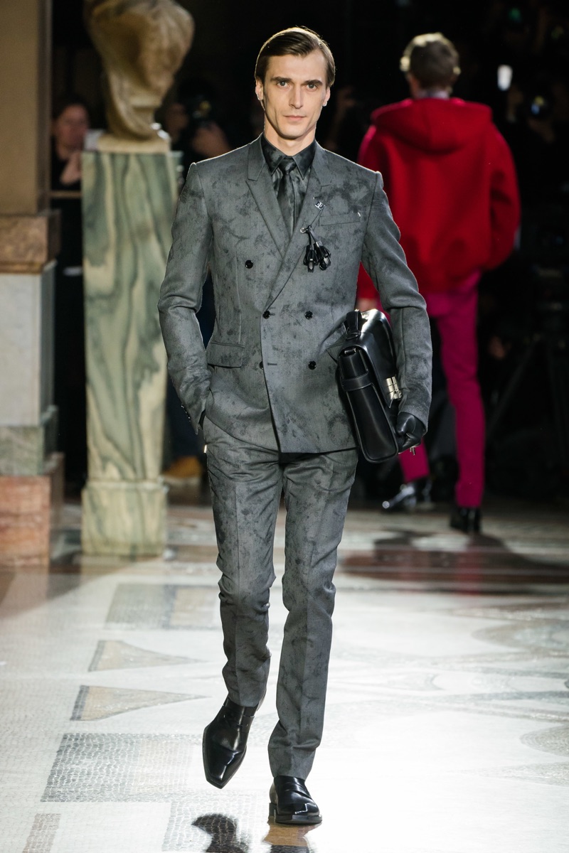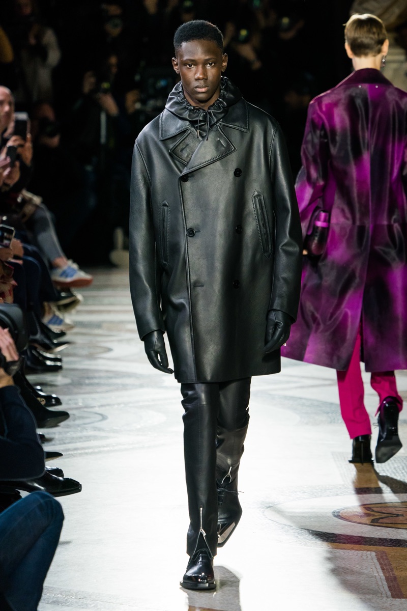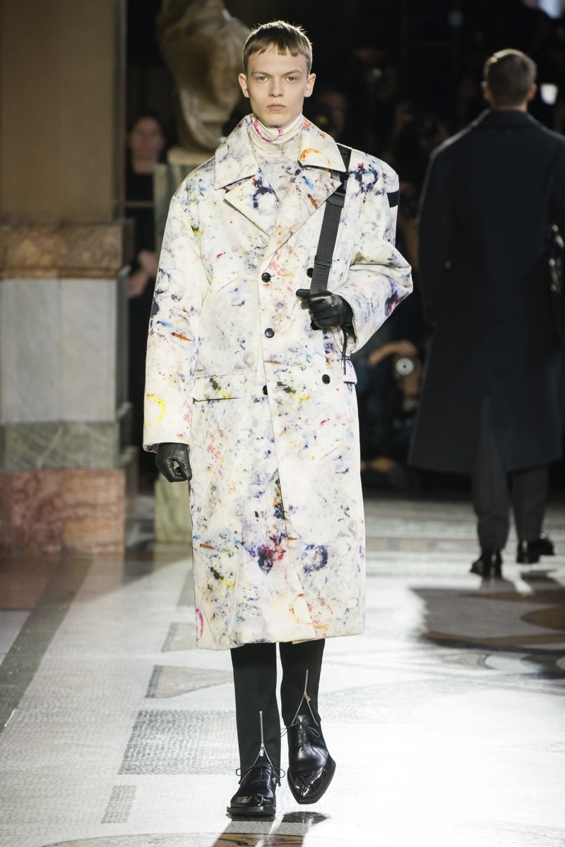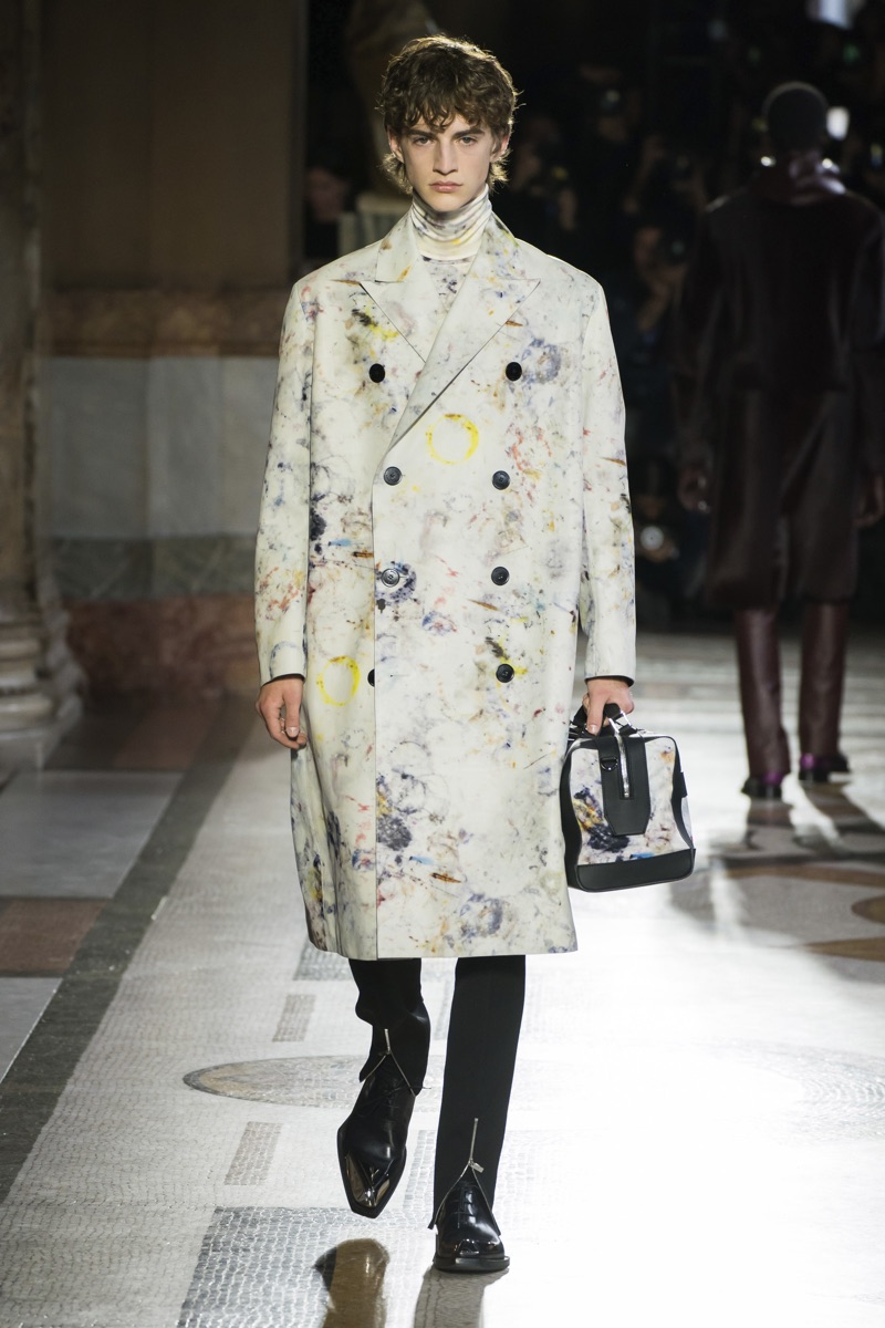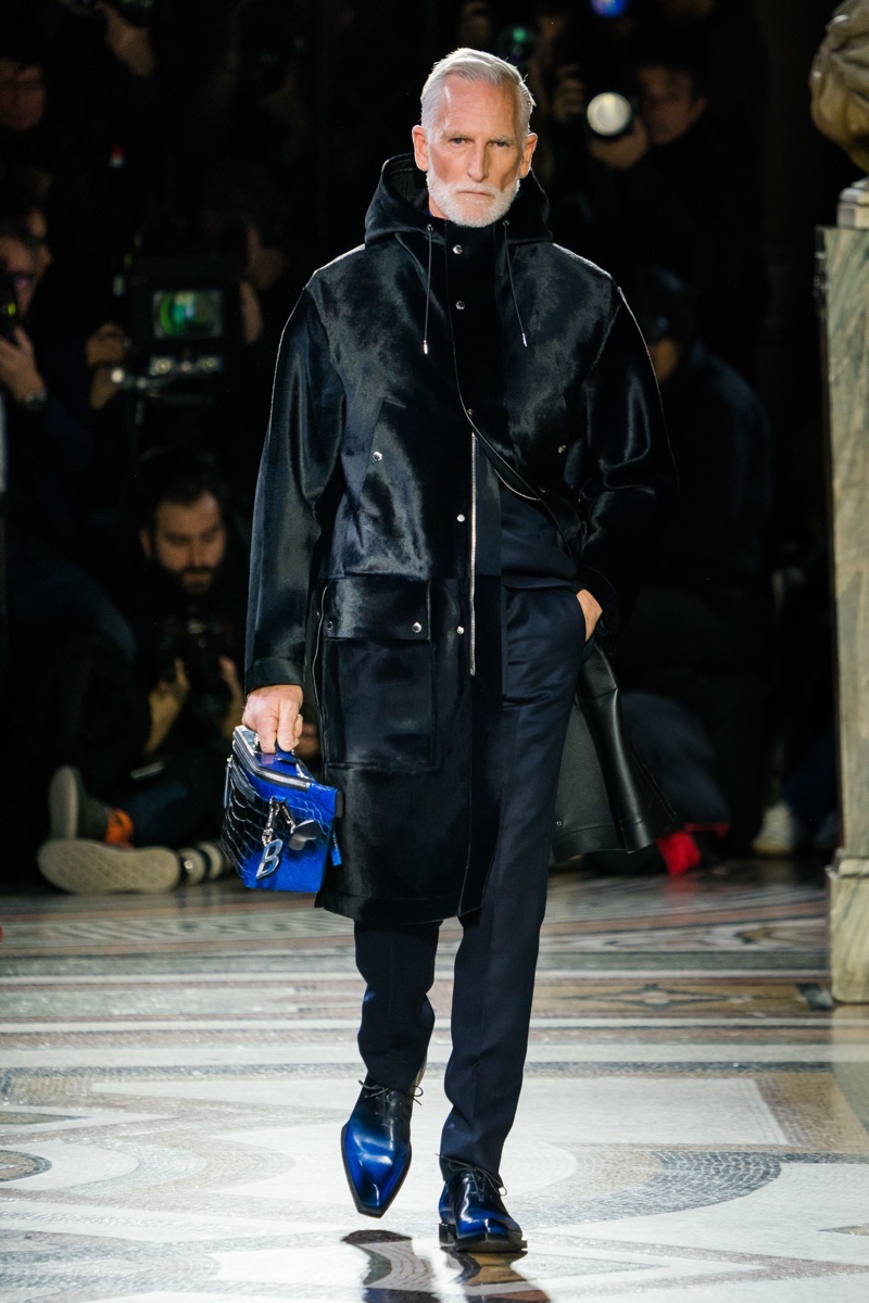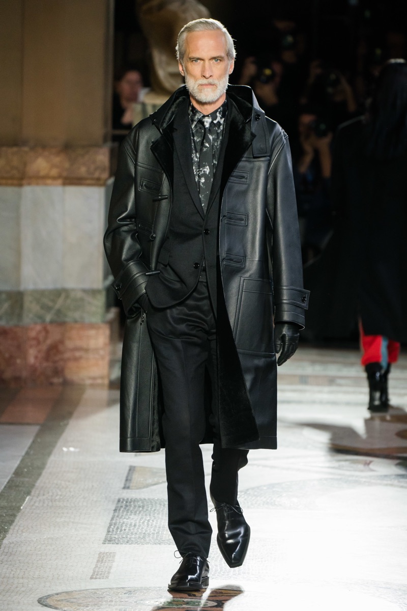 Setting the framework for his tenure at Berluti, designer Kris Van Assche finds inspiration in the fashion house’s notable craftsmanship. In particular, Berluti’s fine reputation for leather shoes and accessories influence the direction of Van Assche’s fall-winter 2019 collection. From the rich quality of leather garments to the print of stained marble from Berluti’s own factory, this season’s lineup mirrors the brand’s esteemed accessories. While the theme at heart plays into a series of impeccably tailored suits and coats, Van Assche perhaps hints at what’s to come for Berluti. Casual pieces like a parka, bomber, and hoodie offered a glimpse into the future.