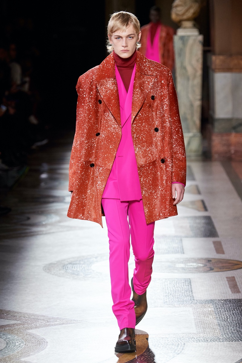 Sharp suits and tailored coats steal the spotlight for the season. The clean, elegant lines encompass a timeless approach to menswear, while Van Assche’s use of bright colors lends the range a contemporary appeal. In addition to vibrant statements on the catwalk, the patina leather suit makes another appearance as a new Berluti signature. Meanwhile, Van Assche introduces the Berluti Signature Canvas that features the fashion house’s new logo and the strokes of the iconic Scritto motif.