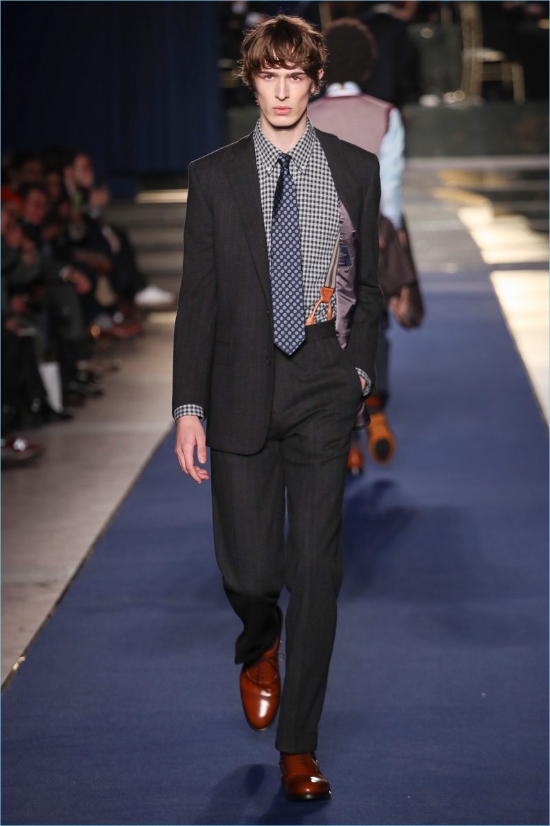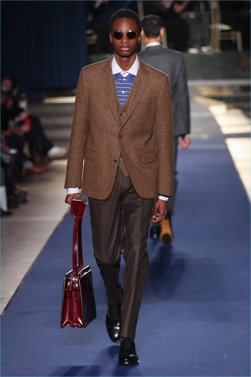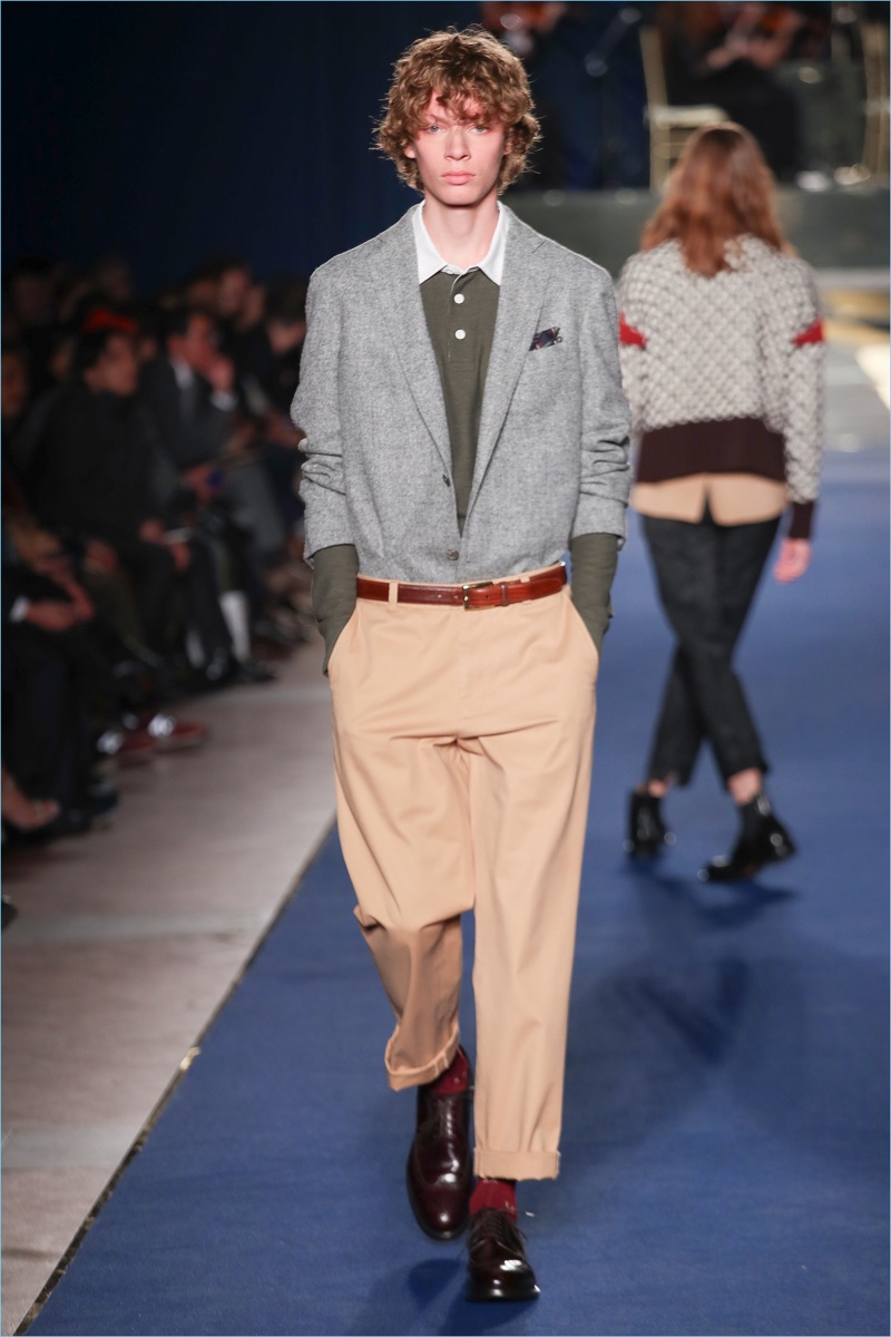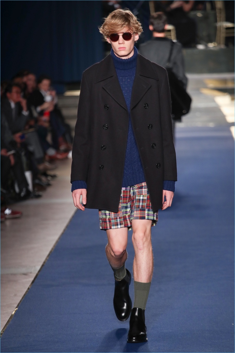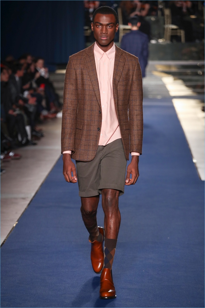 Founded in 1818, 2018 marks the 200 year anniversary of Brooks Brothers. Although the brand was established in New York City, Brooks Brothers decided to make a global impression by traveling to Florence, Italy. Unveiling its fall-winter 2018 collection, the label showed during Pitti Uomo. Known for its classic menswear, Brooks Brothers did not deviate from expectations. Models took to the catwalk in a parade of sartorial ensembles. Impeccably tailored suits were shown alongside a playful mix of smart separates. They included blouson jackets, v-neck sweaters, tailored shorts, patched knits, leather jackets, and pleated trousers. Appealing to a youthful spirit of exploration, boots and shorts made for an interesting pairing.