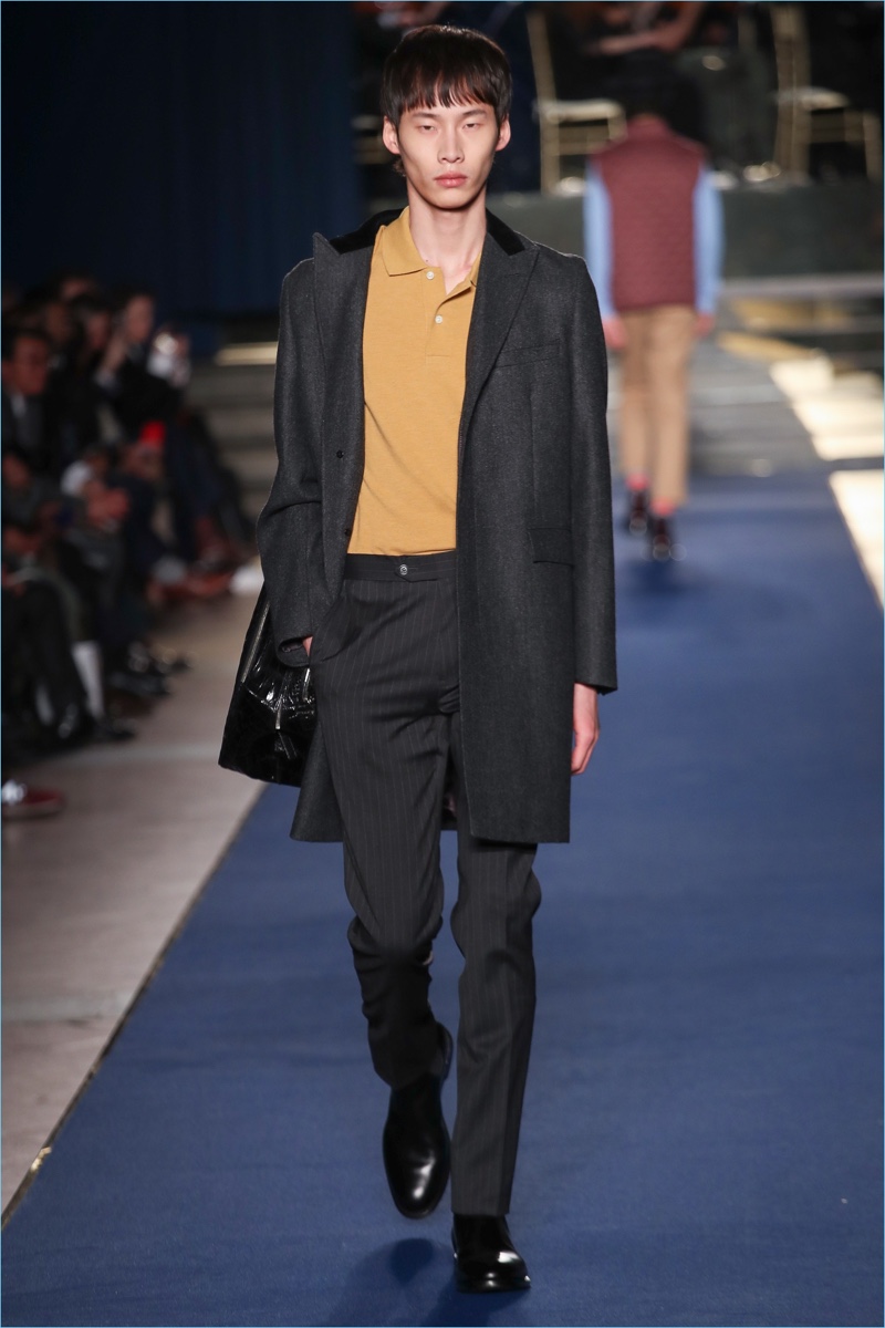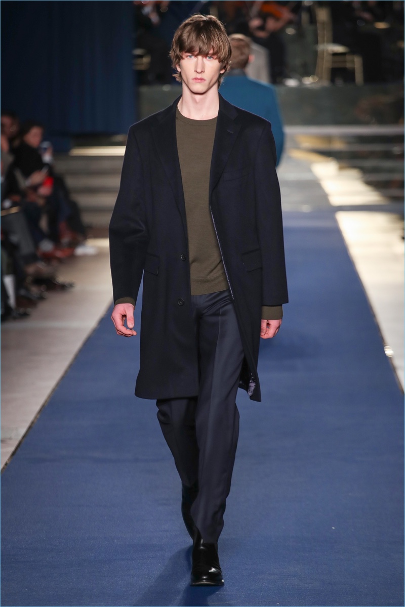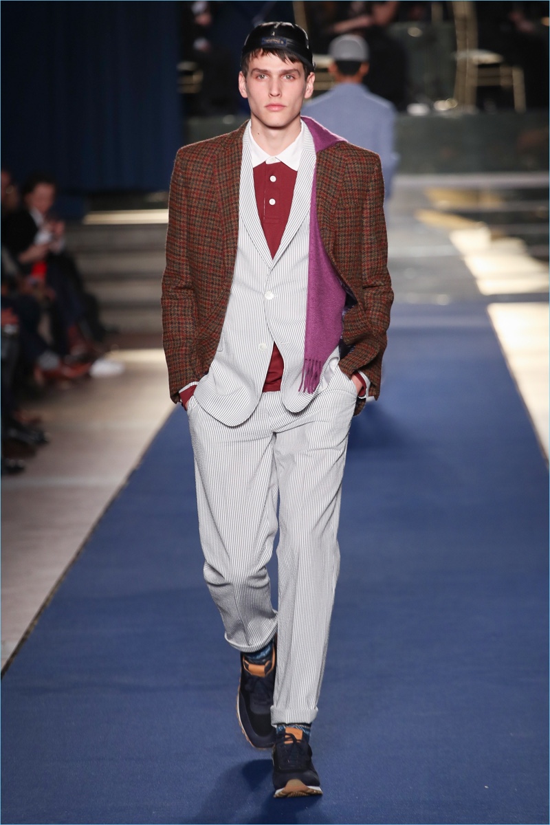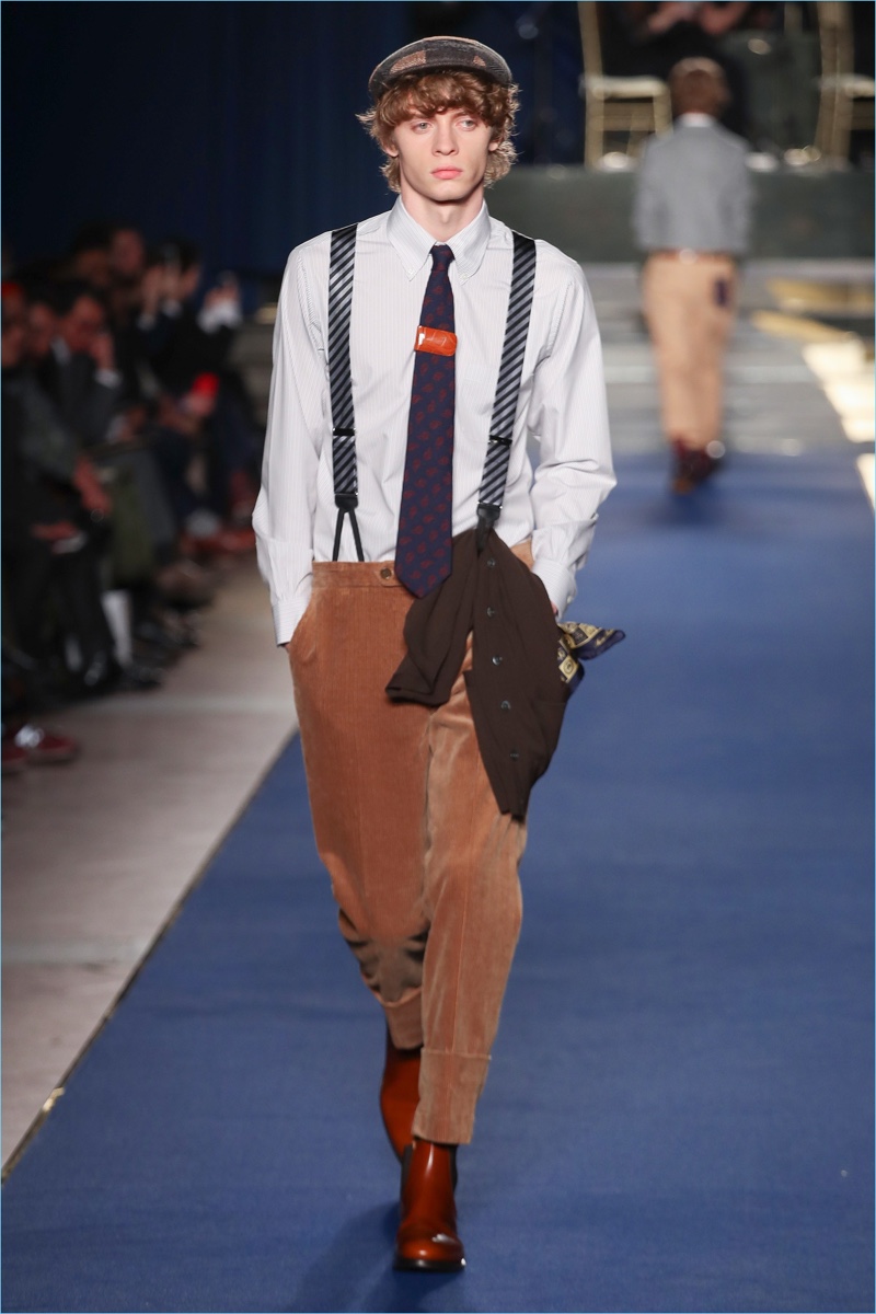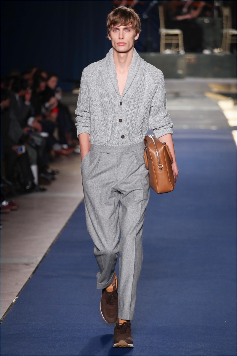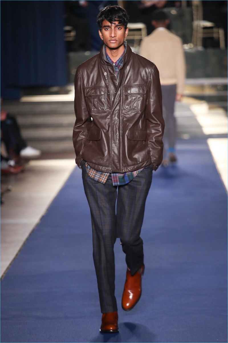 Founded in 1818, 2018 marks the 200 year anniversary of Brooks Brothers. Although the brand was established in New York City, Brooks Brothers decided to make a global impression by traveling to Florence, Italy. Unveiling its fall-winter 2018 collection, the label showed during Pitti Uomo. Known for its classic menswear, Brooks Brothers did not deviate from expectations. Models took to the catwalk in a parade of sartorial ensembles. Impeccably tailored suits were shown alongside a playful mix of smart separates. They included blouson jackets, v-neck sweaters, tailored shorts, patched knits, leather jackets, and pleated trousers. Appealing to a youthful spirit of exploration, boots and shorts made for an interesting pairing.