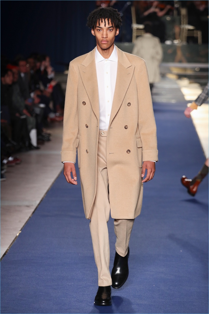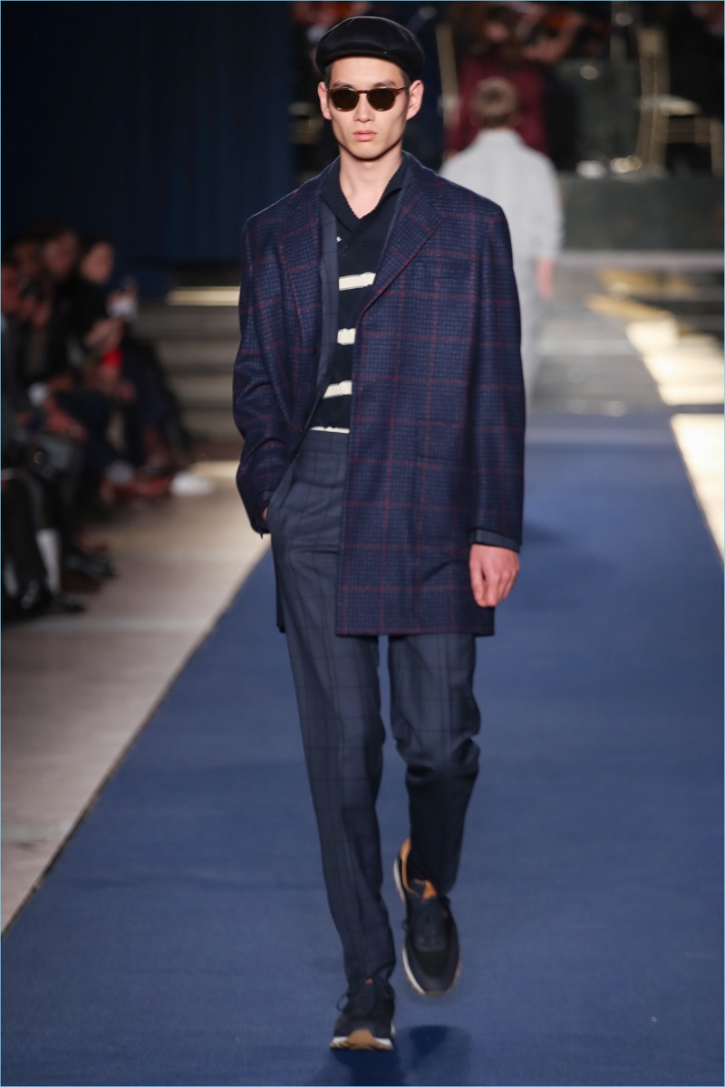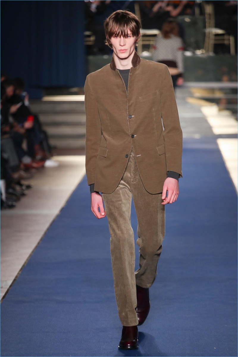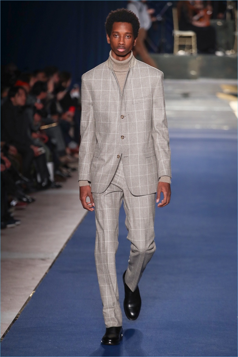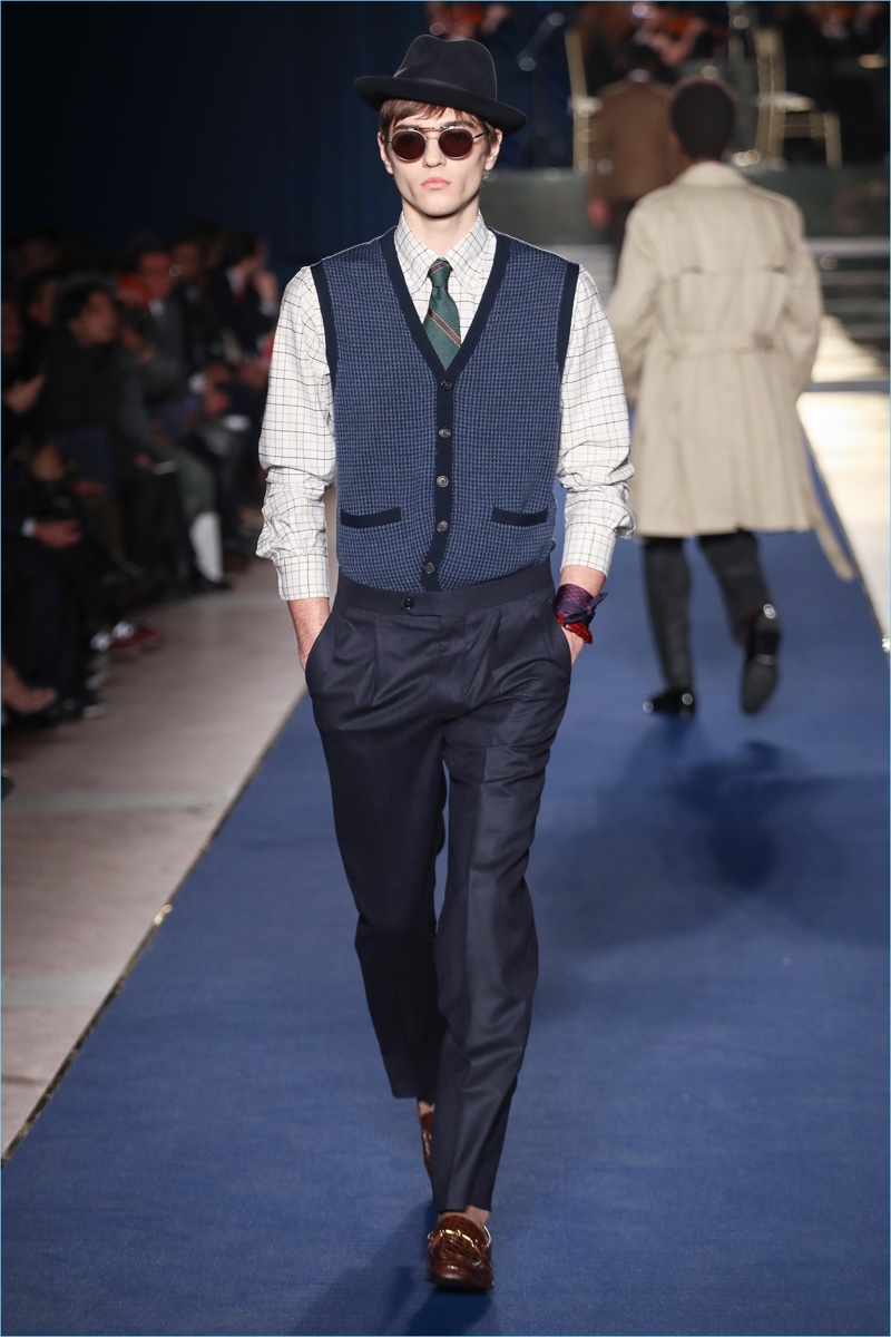 Founded in 1818, 2018 marks the 200 year anniversary of Brooks Brothers. Although the brand was established in New York City, Brooks Brothers decided to make a global impression by traveling to Florence, Italy. Unveiling its fall-winter 2018 collection, the label showed during Pitti Uomo. Known for its classic menswear, Brooks Brothers did not deviate from expectations. Models took to the catwalk in a parade of sartorial ensembles. Impeccably tailored suits were shown alongside a playful mix of smart separates. They included blouson jackets, v-neck sweaters, tailored shorts, patched knits, leather jackets, and pleated trousers. Appealing to a youthful spirit of exploration, boots and shorts made for an interesting pairing.