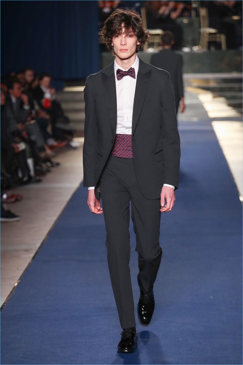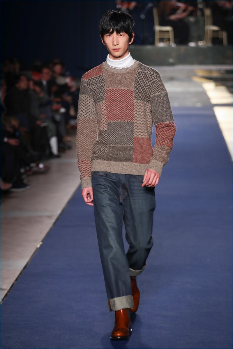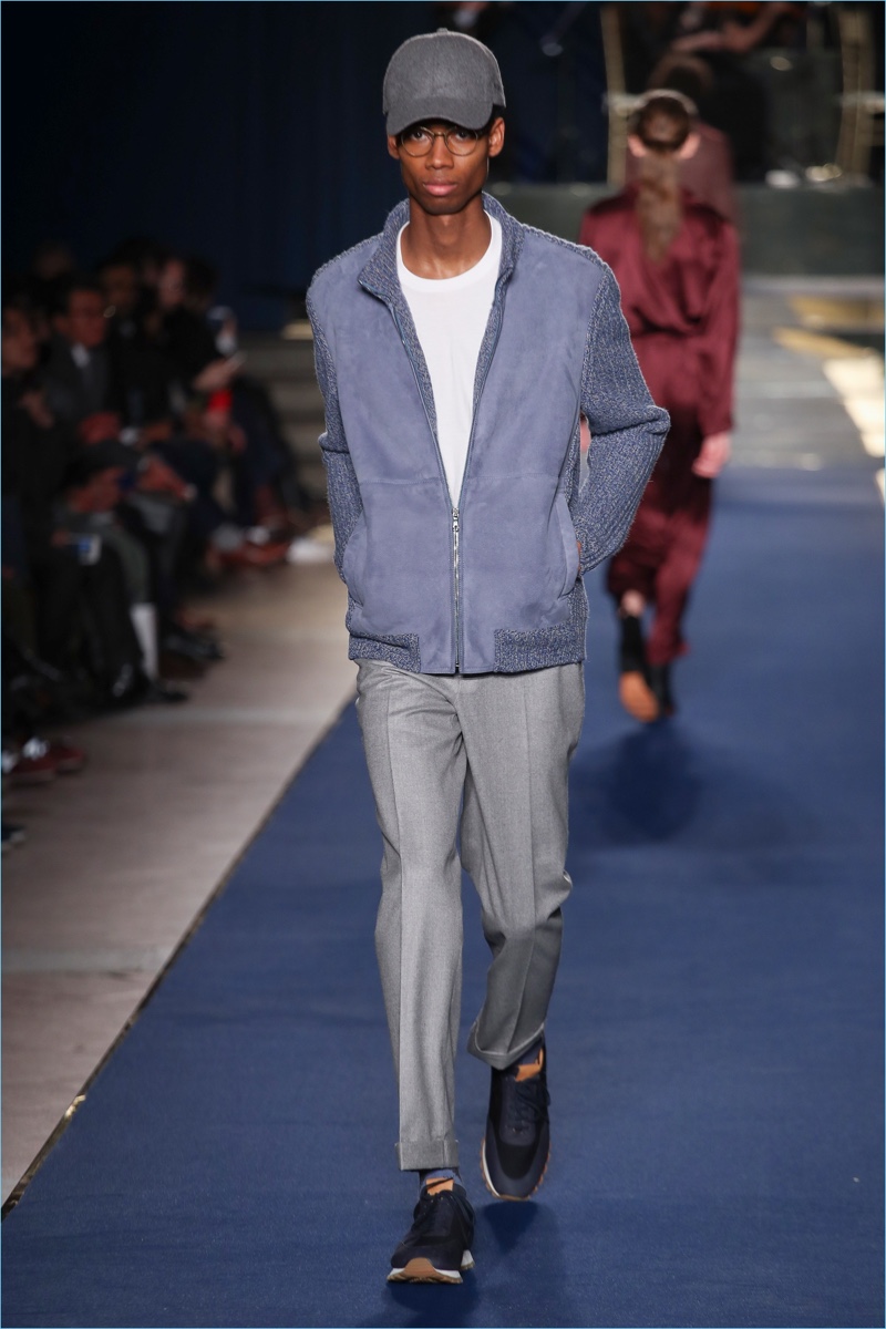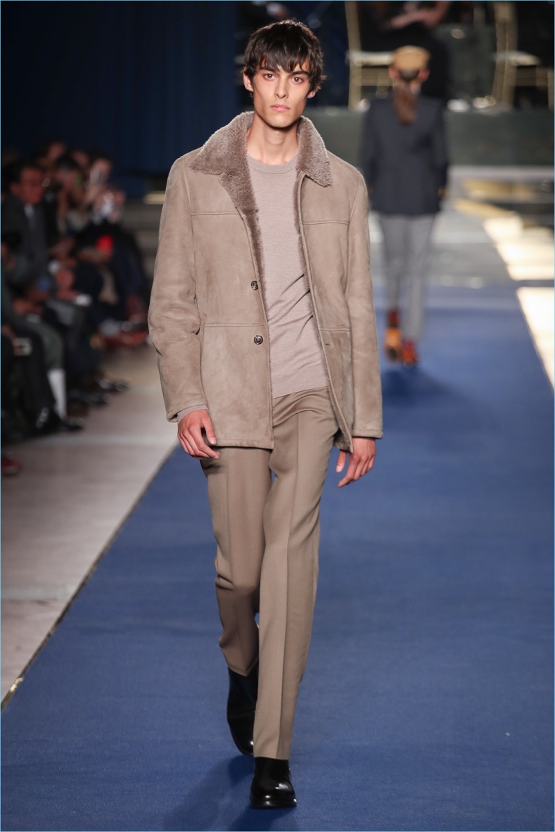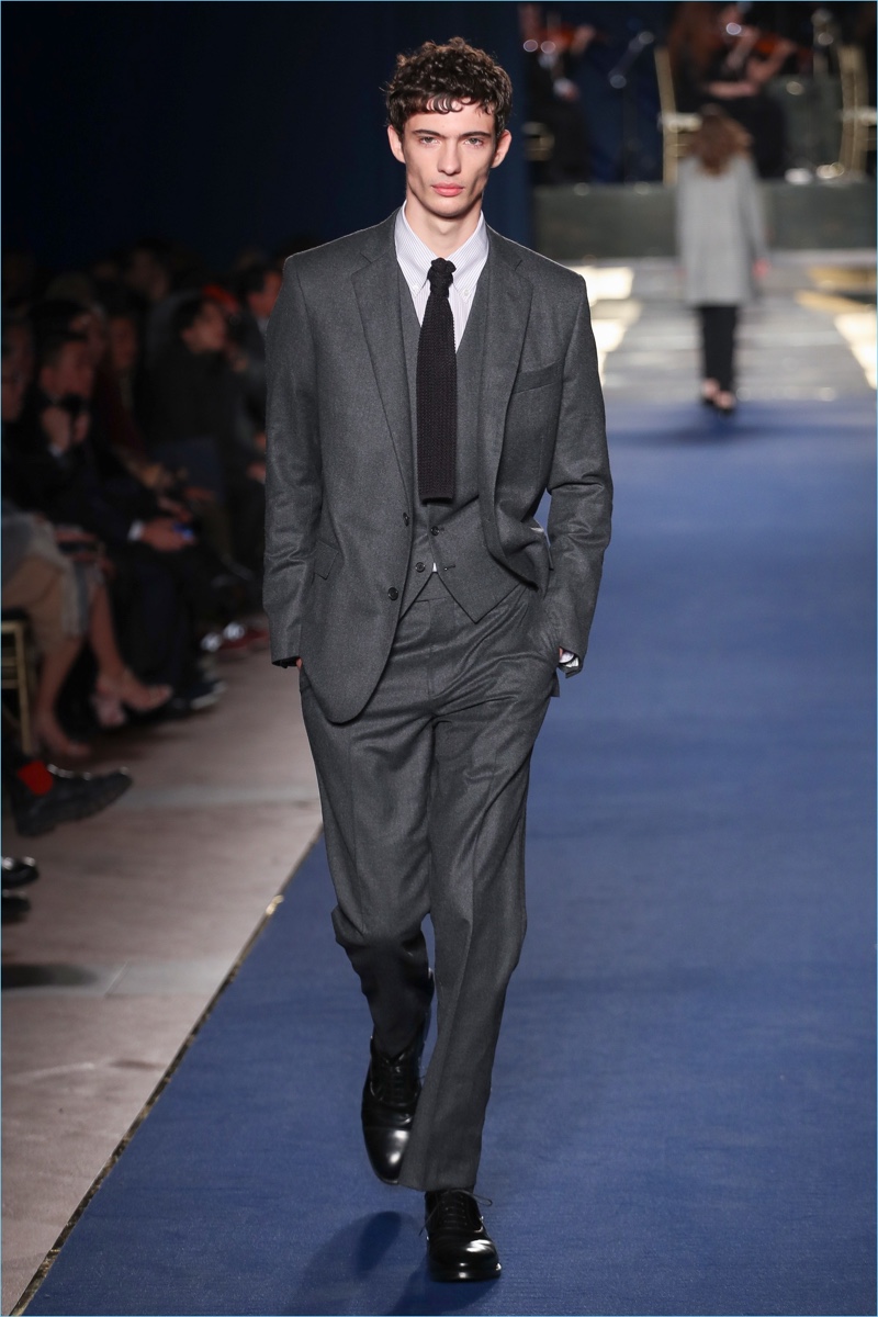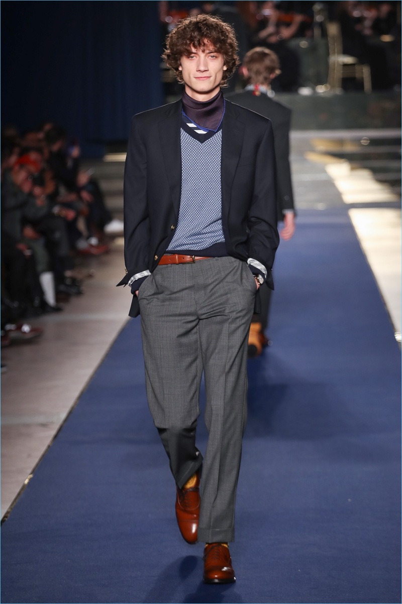 Founded in 1818, 2018 marks the 200 year anniversary of Brooks Brothers. Although the brand was established in New York City, Brooks Brothers decided to make a global impression by traveling to Florence, Italy. Unveiling its fall-winter 2018 collection, the label showed during Pitti Uomo. Known for its classic menswear, Brooks Brothers did not deviate from expectations. Models took to the catwalk in a parade of sartorial ensembles. Impeccably tailored suits were shown alongside a playful mix of smart separates. They included blouson jackets, v-neck sweaters, tailored shorts, patched knits, leather jackets, and pleated trousers. Appealing to a youthful spirit of exploration, boots and shorts made for an interesting pairing.