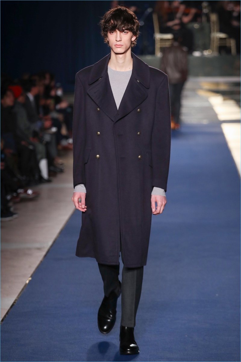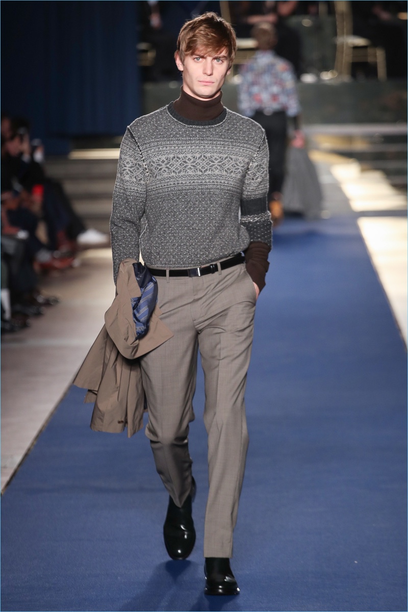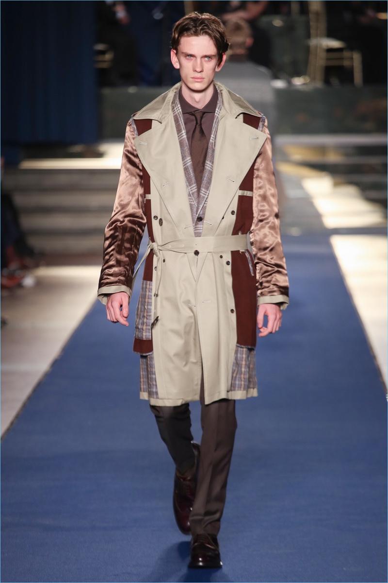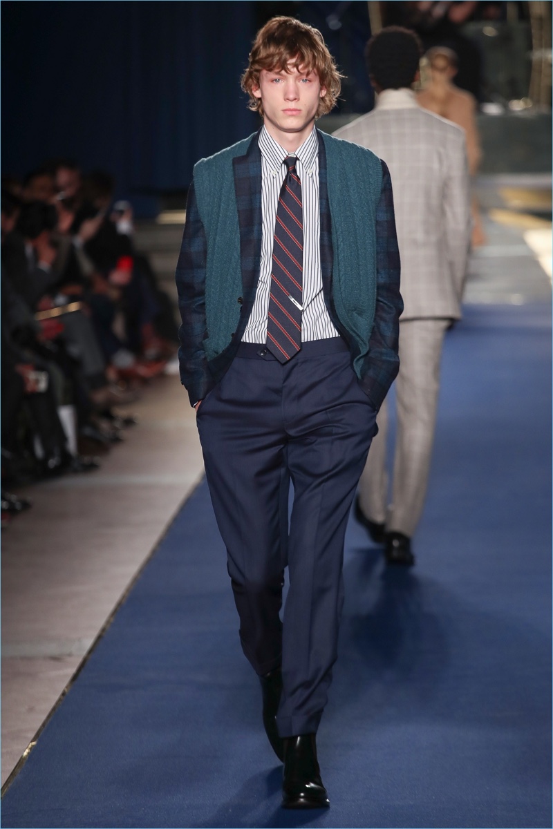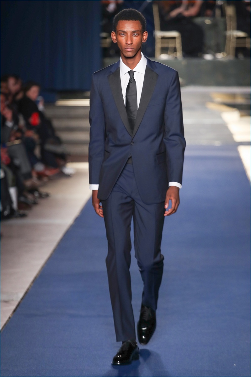 Founded in 1818, 2018 marks the 200 year anniversary of Brooks Brothers. Although the brand was established in New York City, Brooks Brothers decided to make a global impression by traveling to Florence, Italy. Unveiling its fall-winter 2018 collection, the label showed during Pitti Uomo. Known for its classic menswear, Brooks Brothers did not deviate from expectations. Models took to the catwalk in a parade of sartorial ensembles. Impeccably tailored suits were shown alongside a playful mix of smart separates. They included blouson jackets, v-neck sweaters, tailored shorts, patched knits, leather jackets, and pleated trousers. Appealing to a youthful spirit of exploration, boots and shorts made for an interesting pairing.