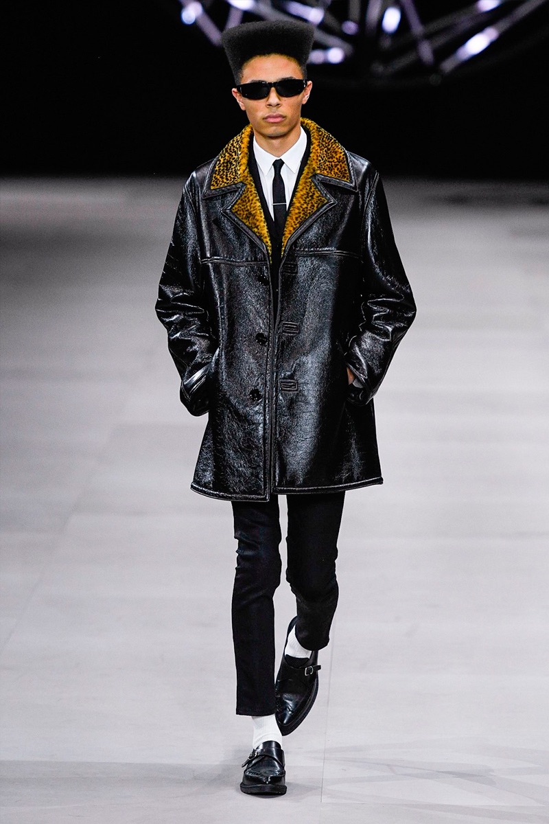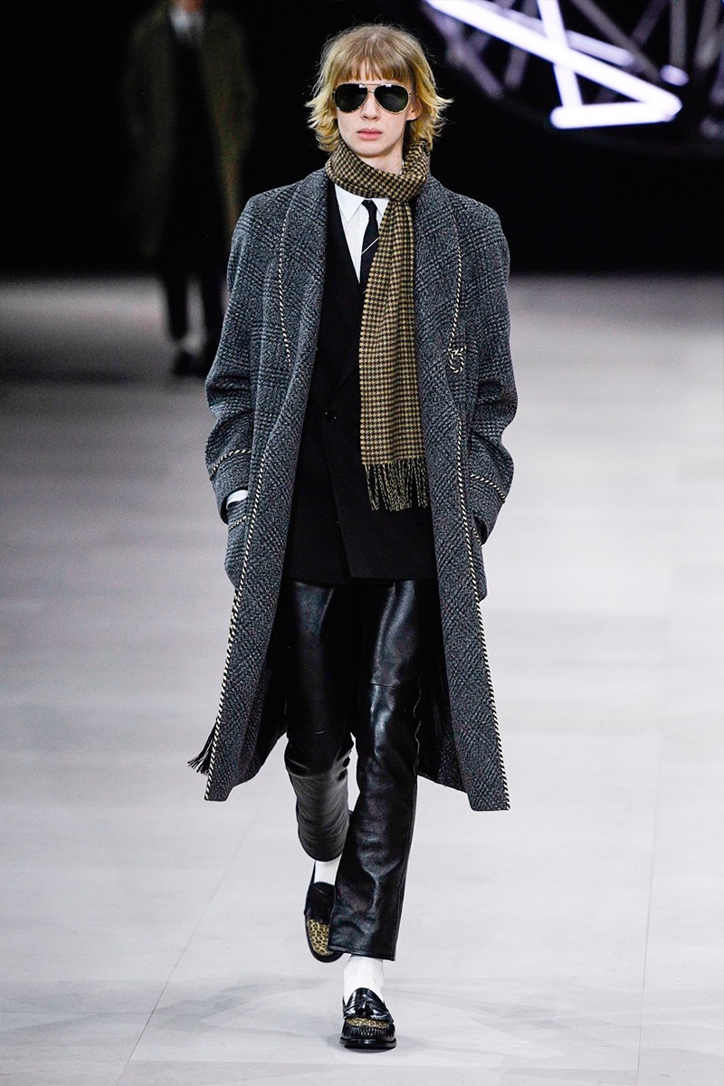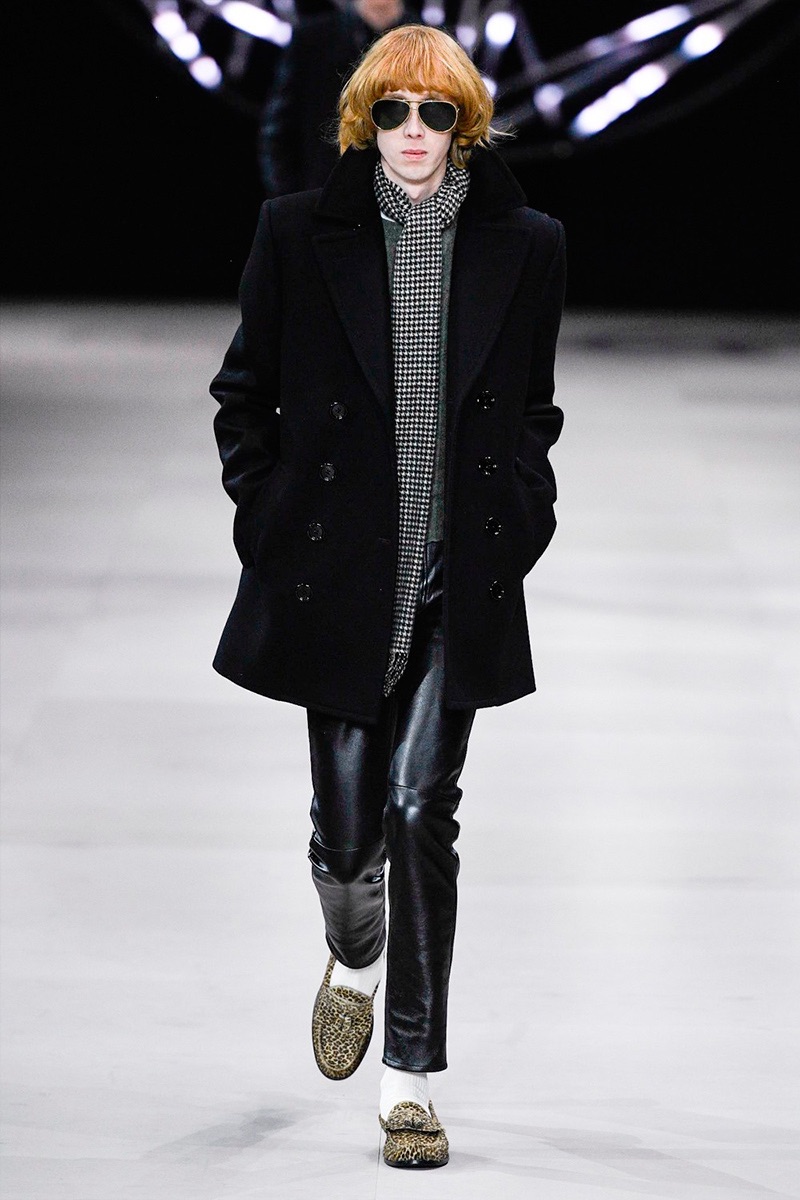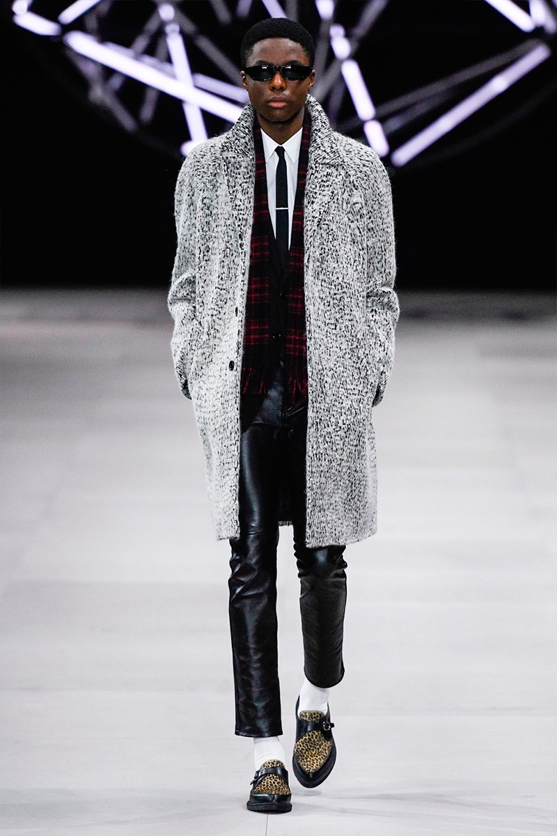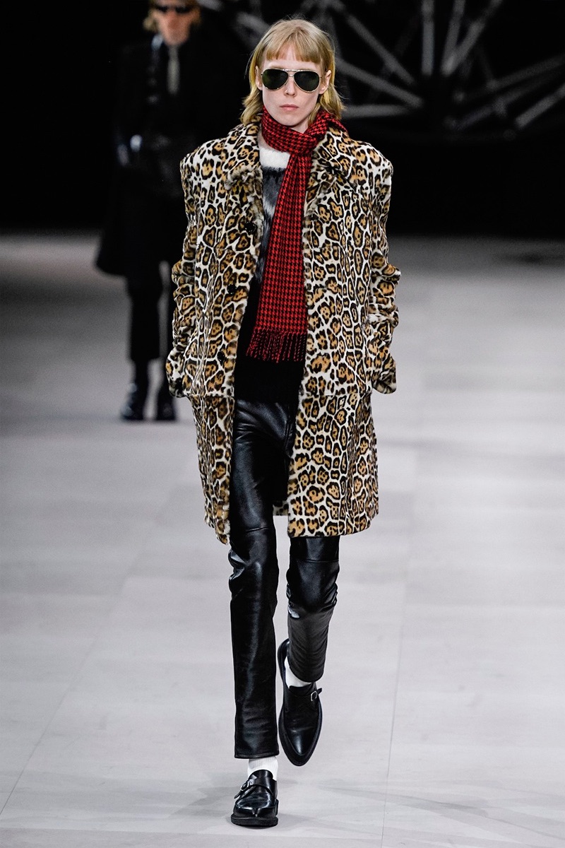 However, there’s still space for Slimane’s brand of cool. Shrunken leather jackets and pants join distressed denim, animal print coats, and the occasional scarf. Moving away from ankle boots, Slimane makes a strong case for the loafer and classic white socks.