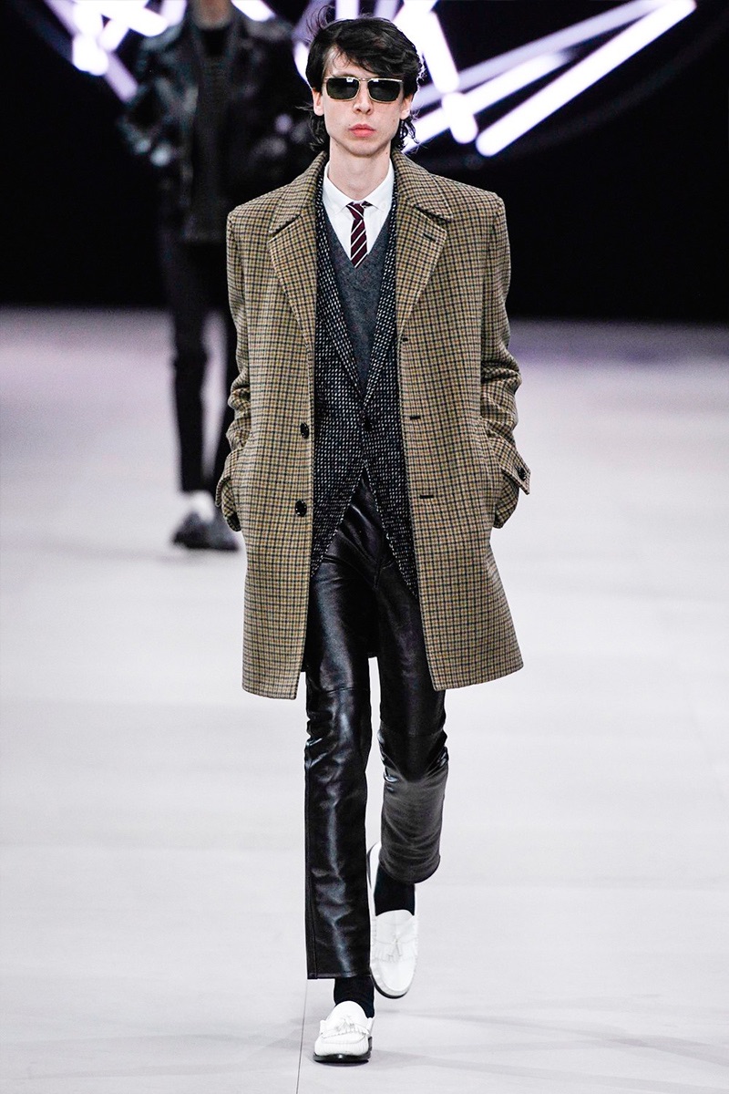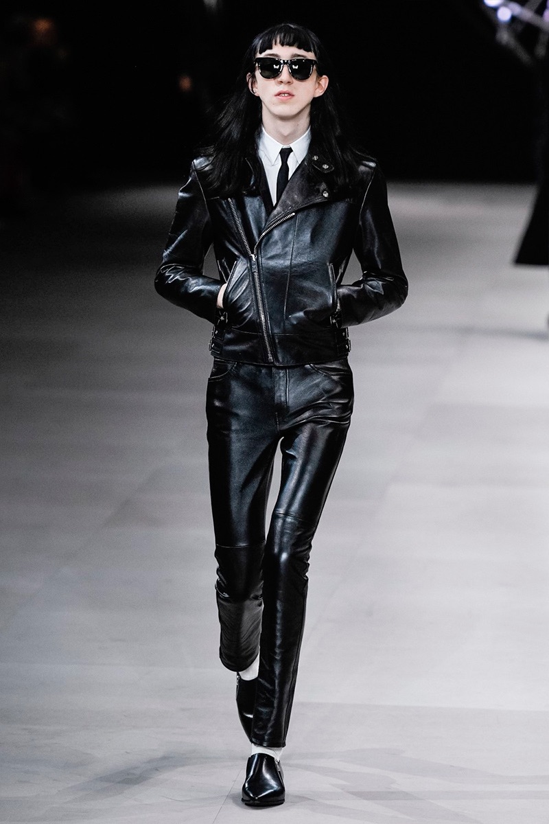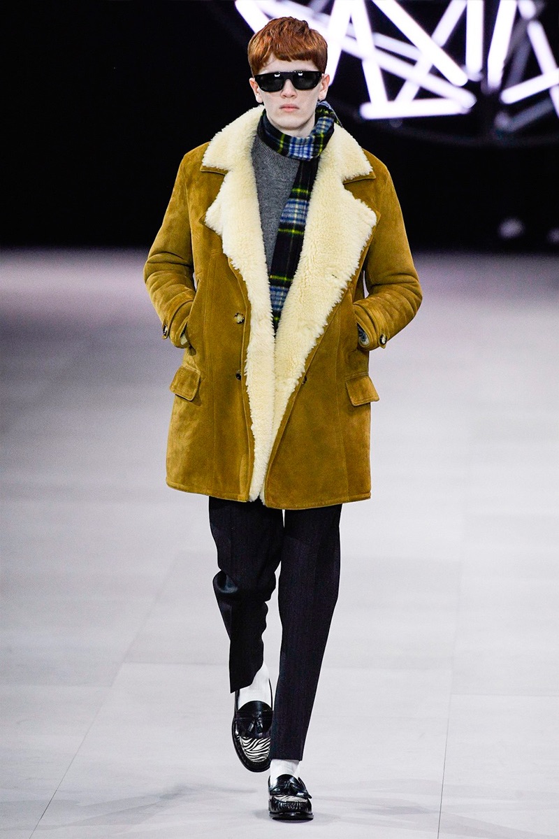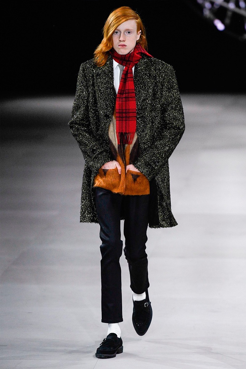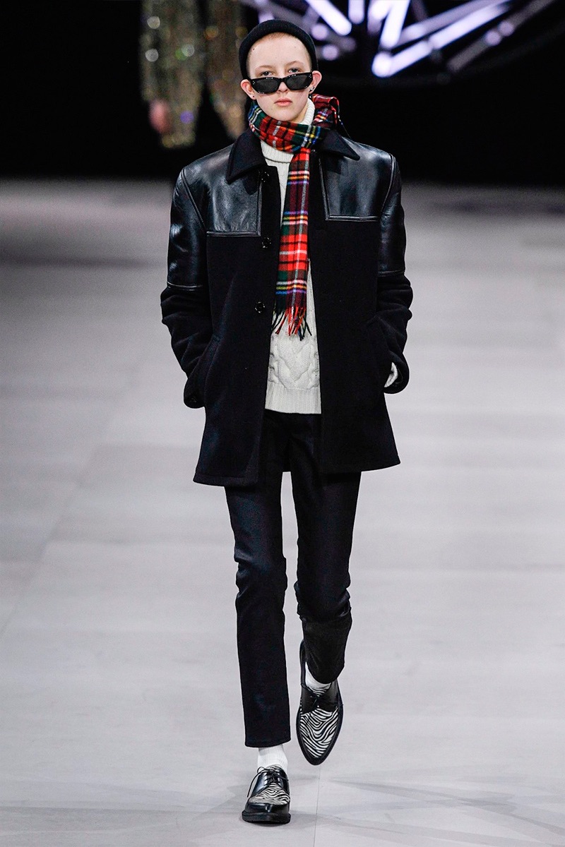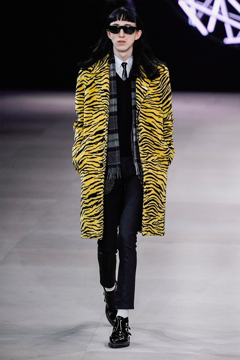 However, there’s still space for Slimane’s brand of cool. Shrunken leather jackets and pants join distressed denim, animal print coats, and the occasional scarf. Moving away from ankle boots, Slimane makes a strong case for the loafer and classic white socks.