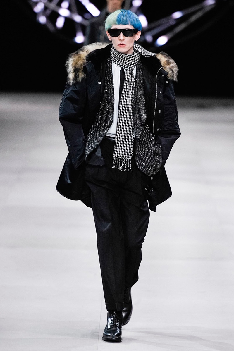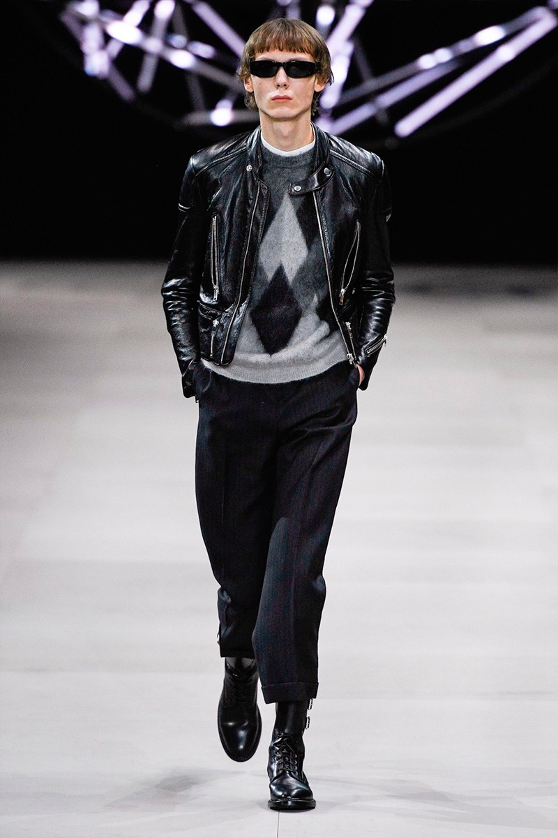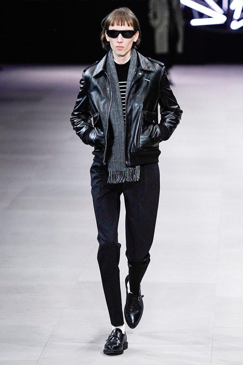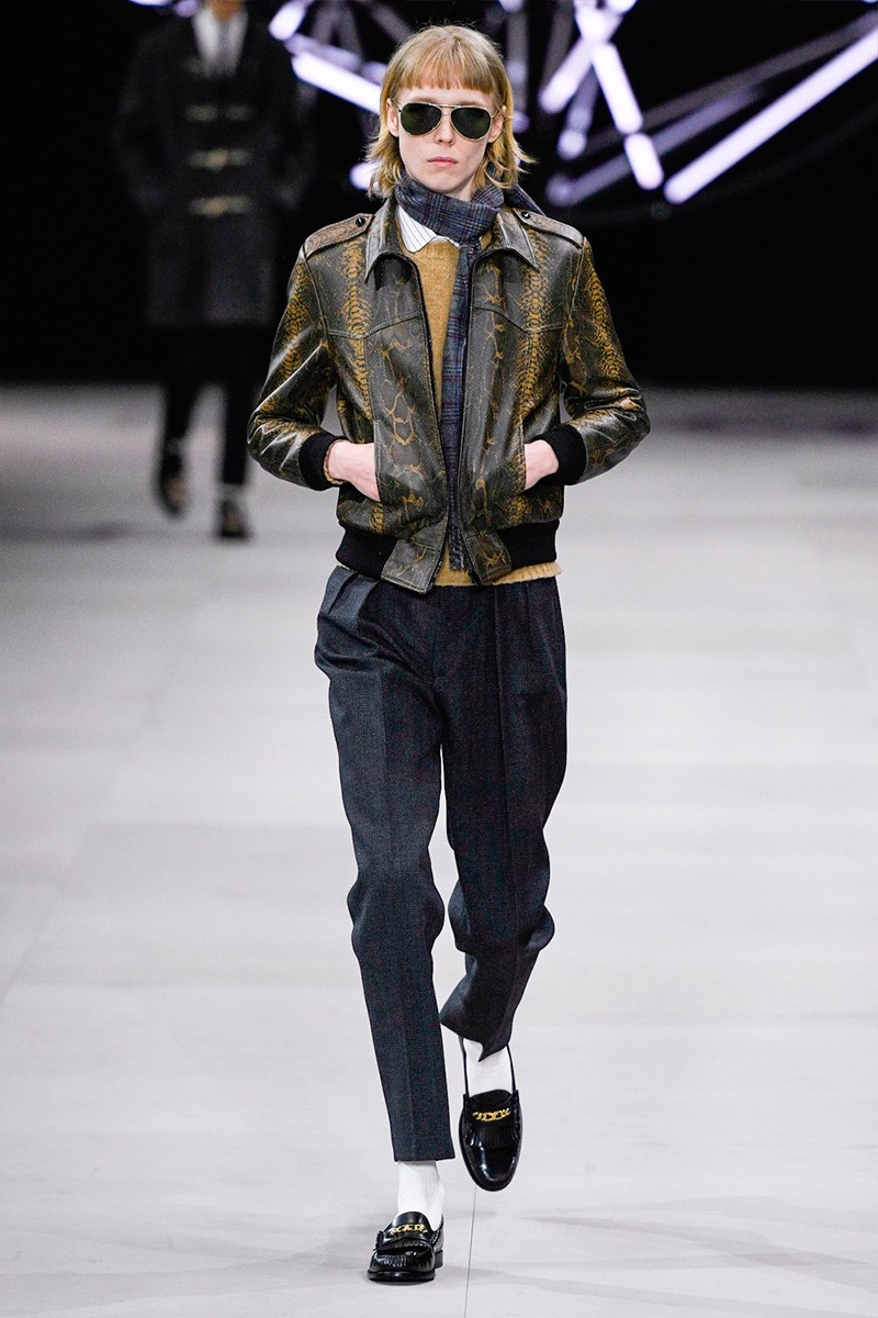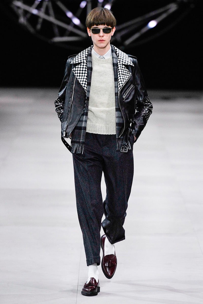 However, there’s still space for Slimane’s brand of cool. Shrunken leather jackets and pants join distressed denim, animal print coats, and the occasional scarf. Moving away from ankle boots, Slimane makes a strong case for the loafer and classic white socks.