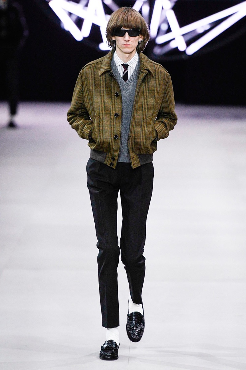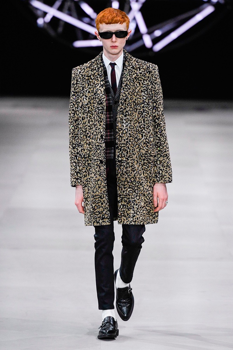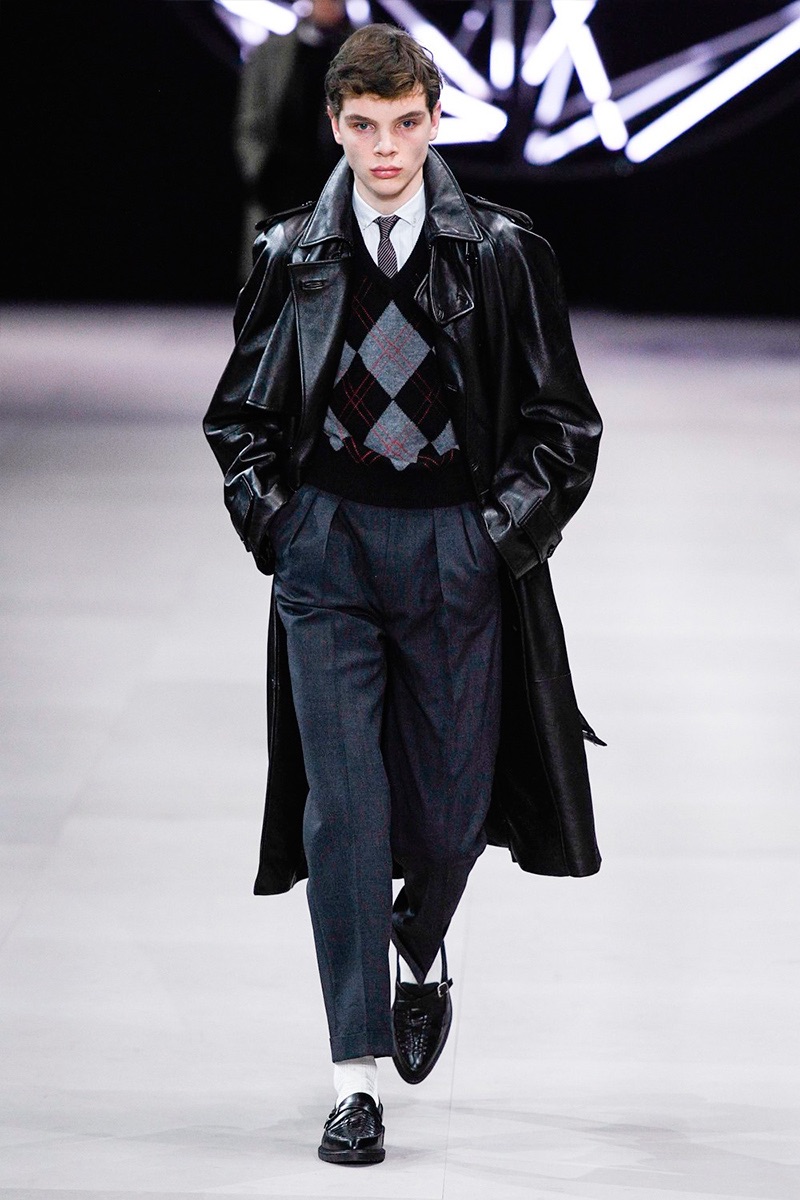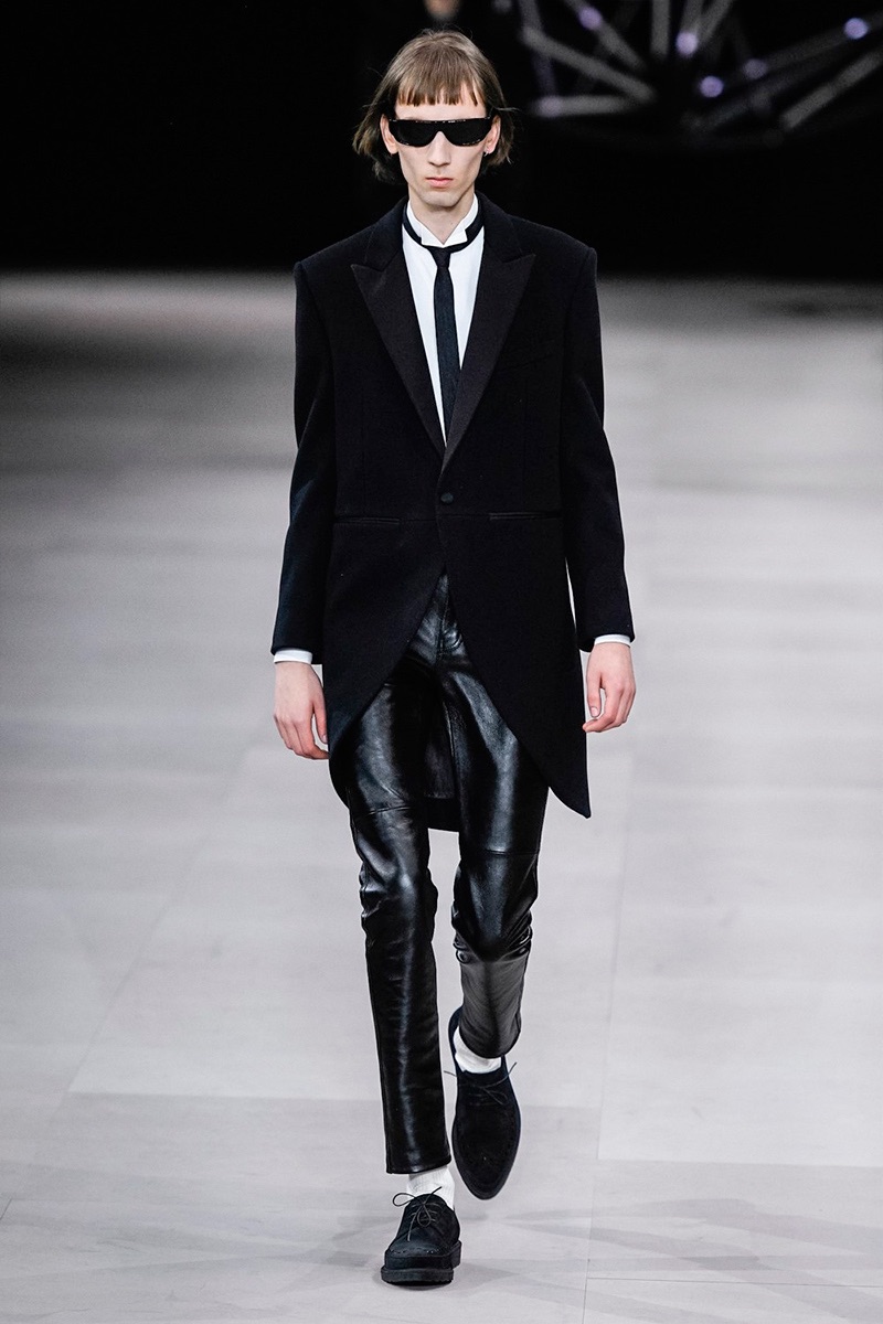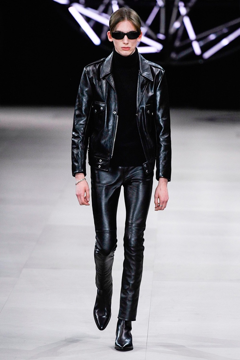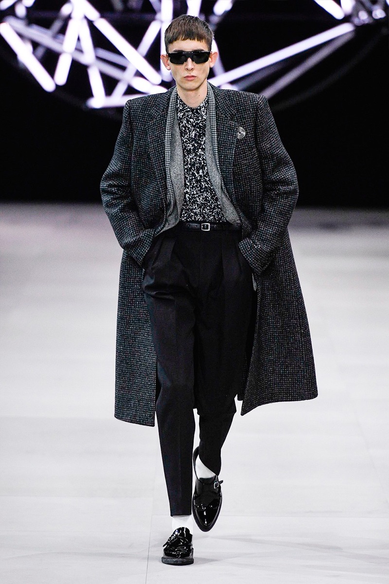 However, there’s still space for Slimane’s brand of cool. Shrunken leather jackets and pants join distressed denim, animal print coats, and the occasional scarf. Moving away from ankle boots, Slimane makes a strong case for the loafer and classic white socks.