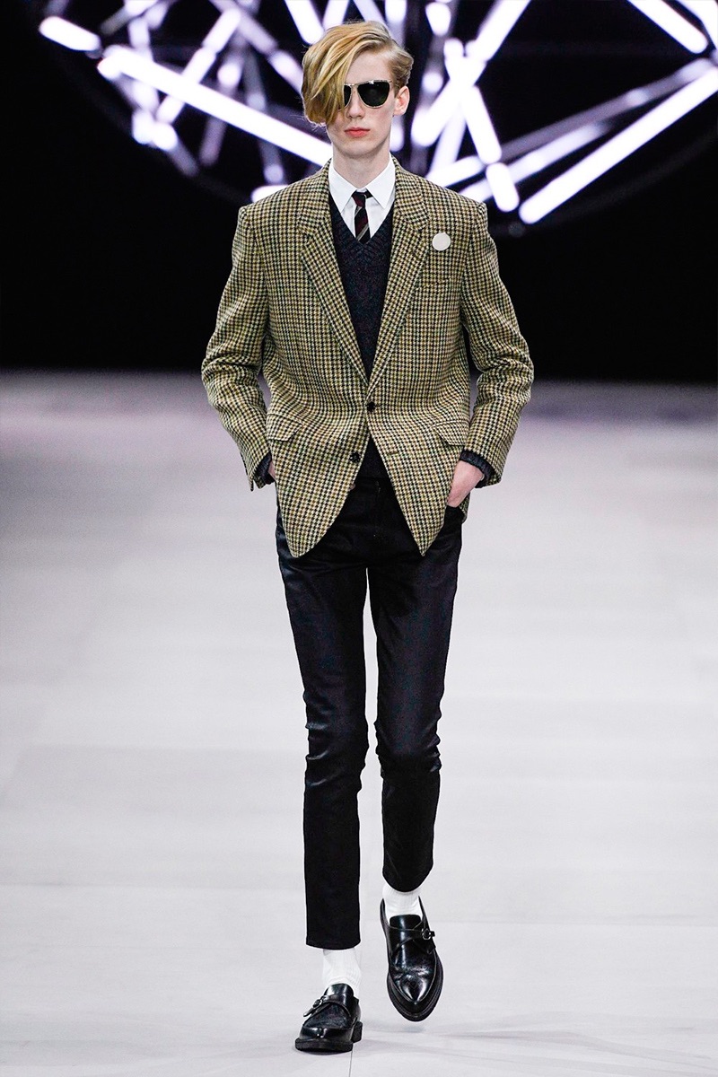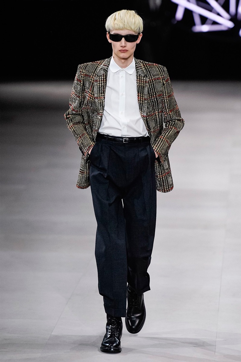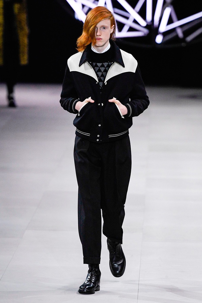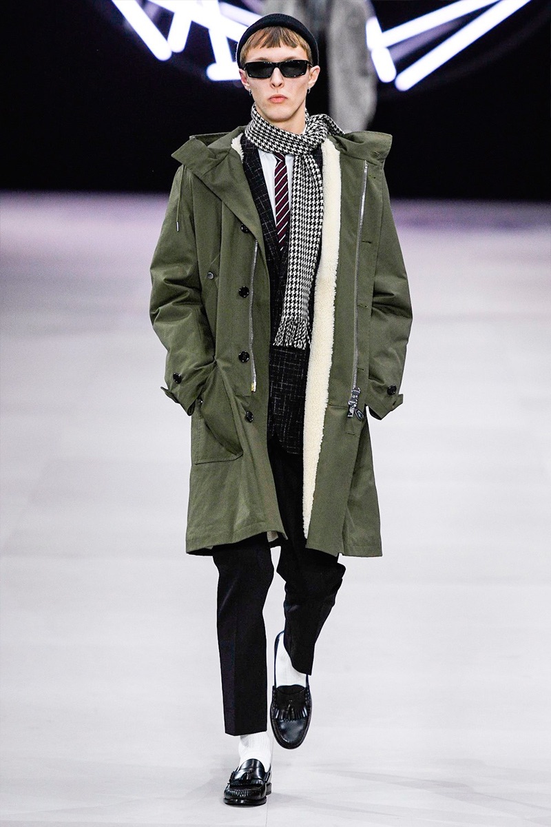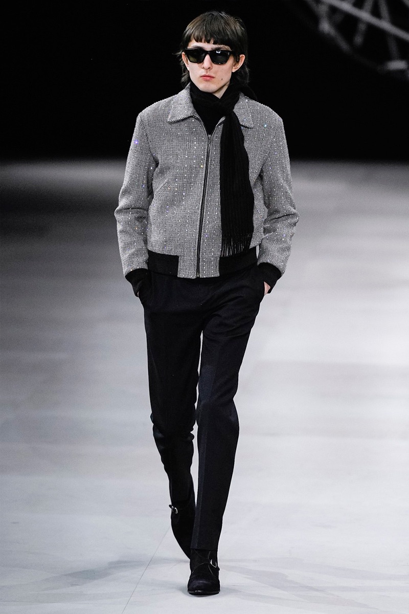 However, there’s still space for Slimane’s brand of cool. Shrunken leather jackets and pants join distressed denim, animal print coats, and the occasional scarf. Moving away from ankle boots, Slimane makes a strong case for the loafer and classic white socks.