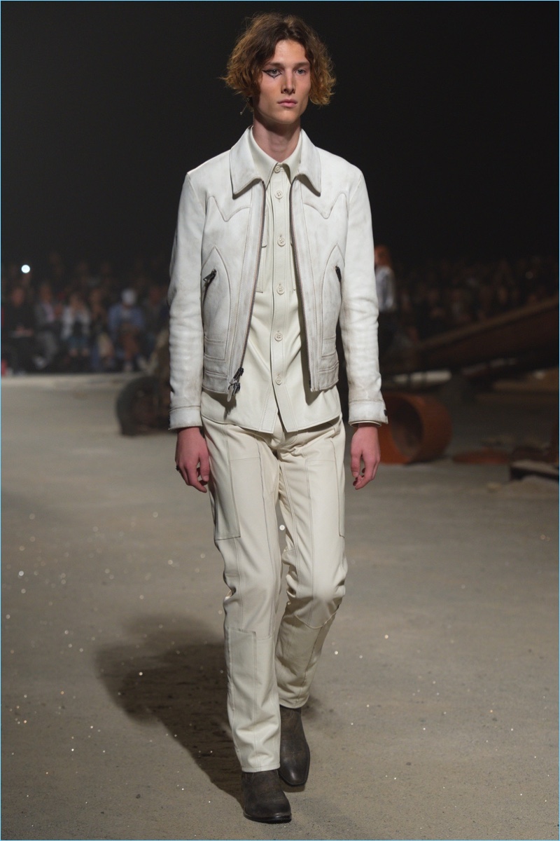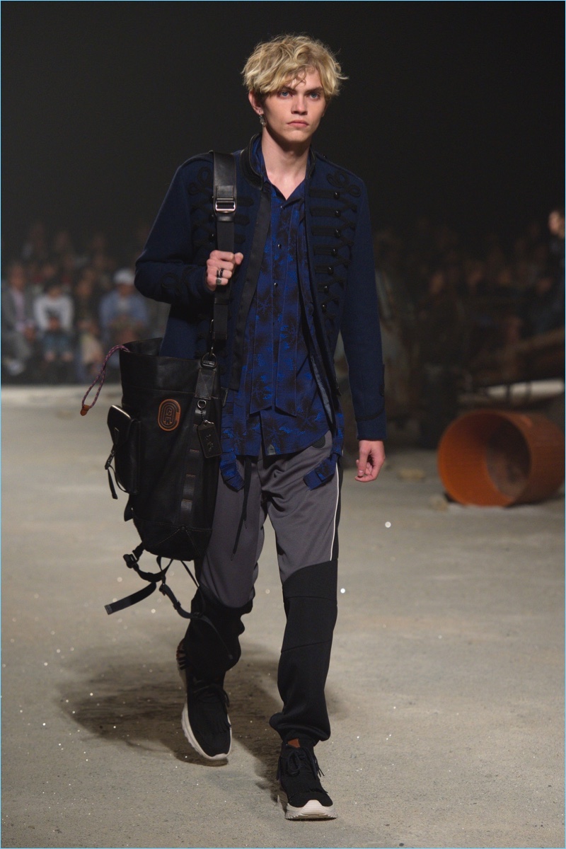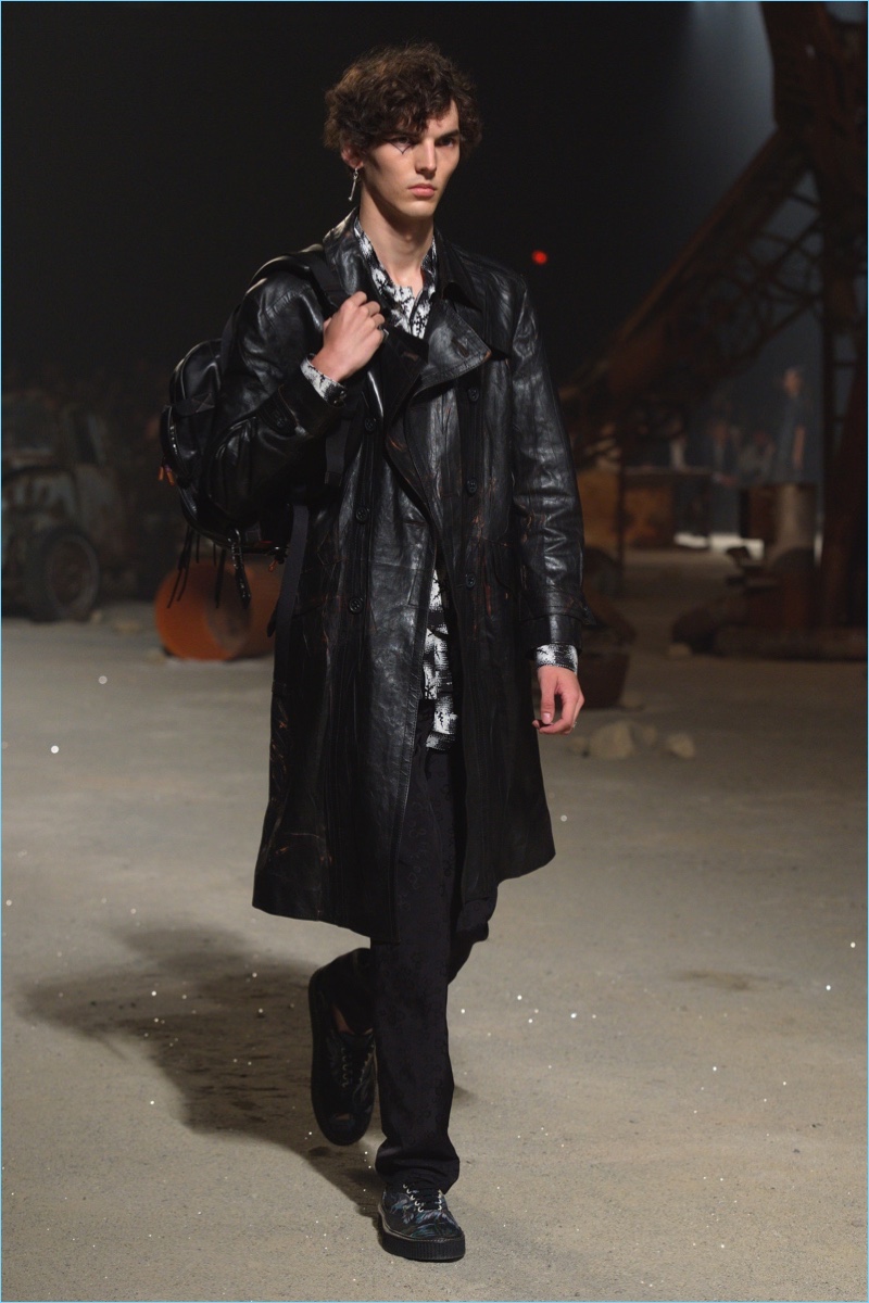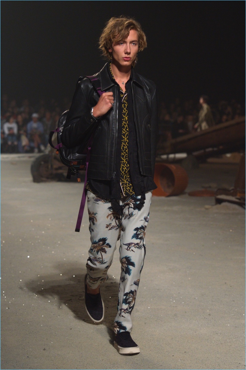 Coach creative director Stuart Vevers dreams up a romantic gang of American dreamers for spring-summer 2019. Departing a prairie landscape, we find Coach’s dreamers in the midst of a social revolution. American heirlooms come together with new ideas for the season. Vevers juxtaposes a patchwork motif with a contemporary approach to leather. Coach’s man embraces a mix of monochromatic ensembles and graphic print statements. Must-have pieces from the collection range from a brown fringed leather jacket and patchwork pullover to a tropical print shirt. As always, covetable accessories include totes and backpacks.
