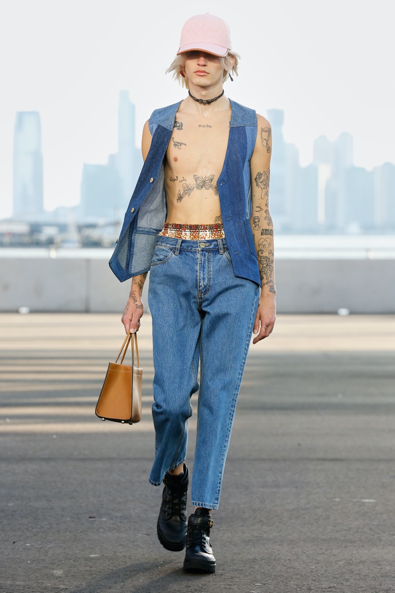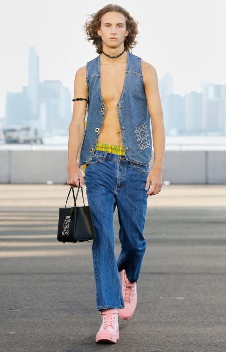 A casual attitude pervades Coach’s spring collection with a focus on denim. Sustainability is also at the forefront, with upcycled denim presented as essentials like jeans and denim vests. Cashin adds her voice to the mix with updates of vintage Bonnie Cashin outerwear and bags.