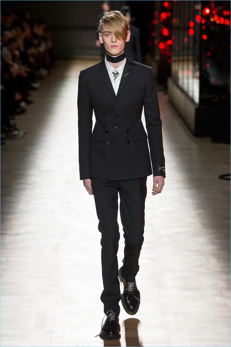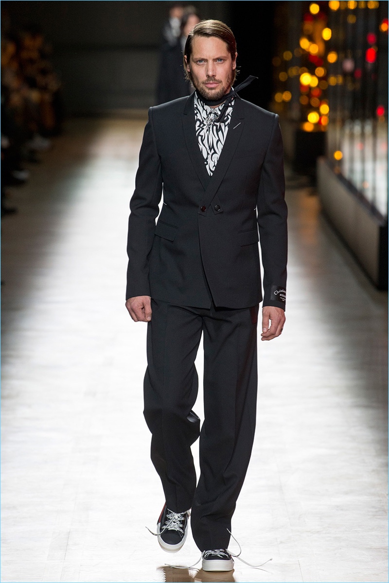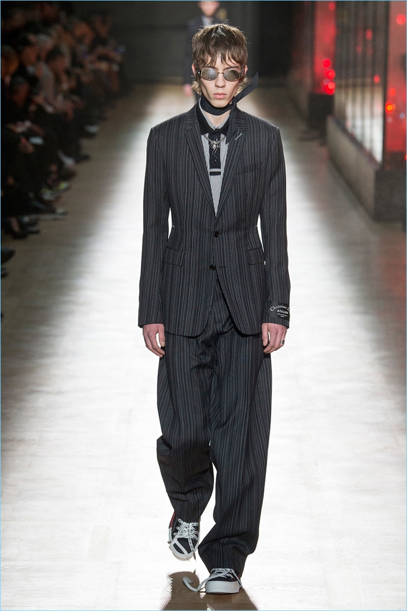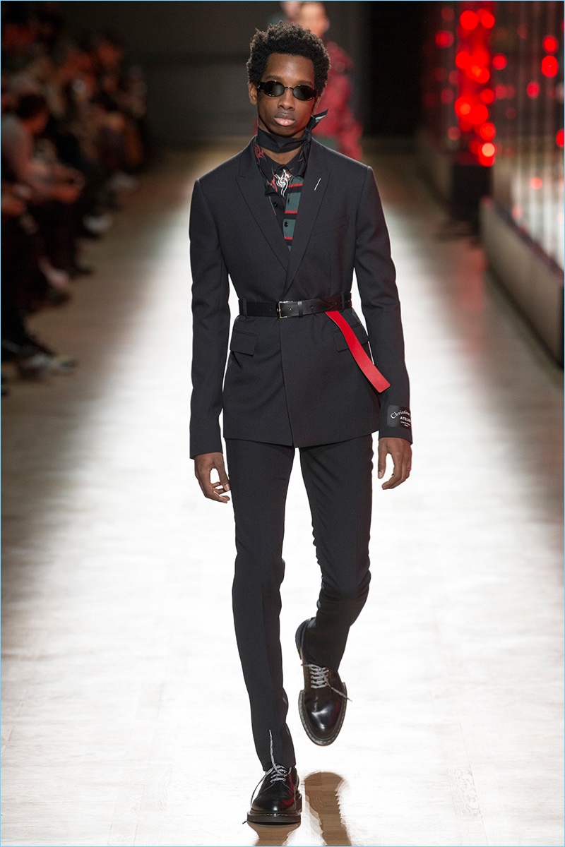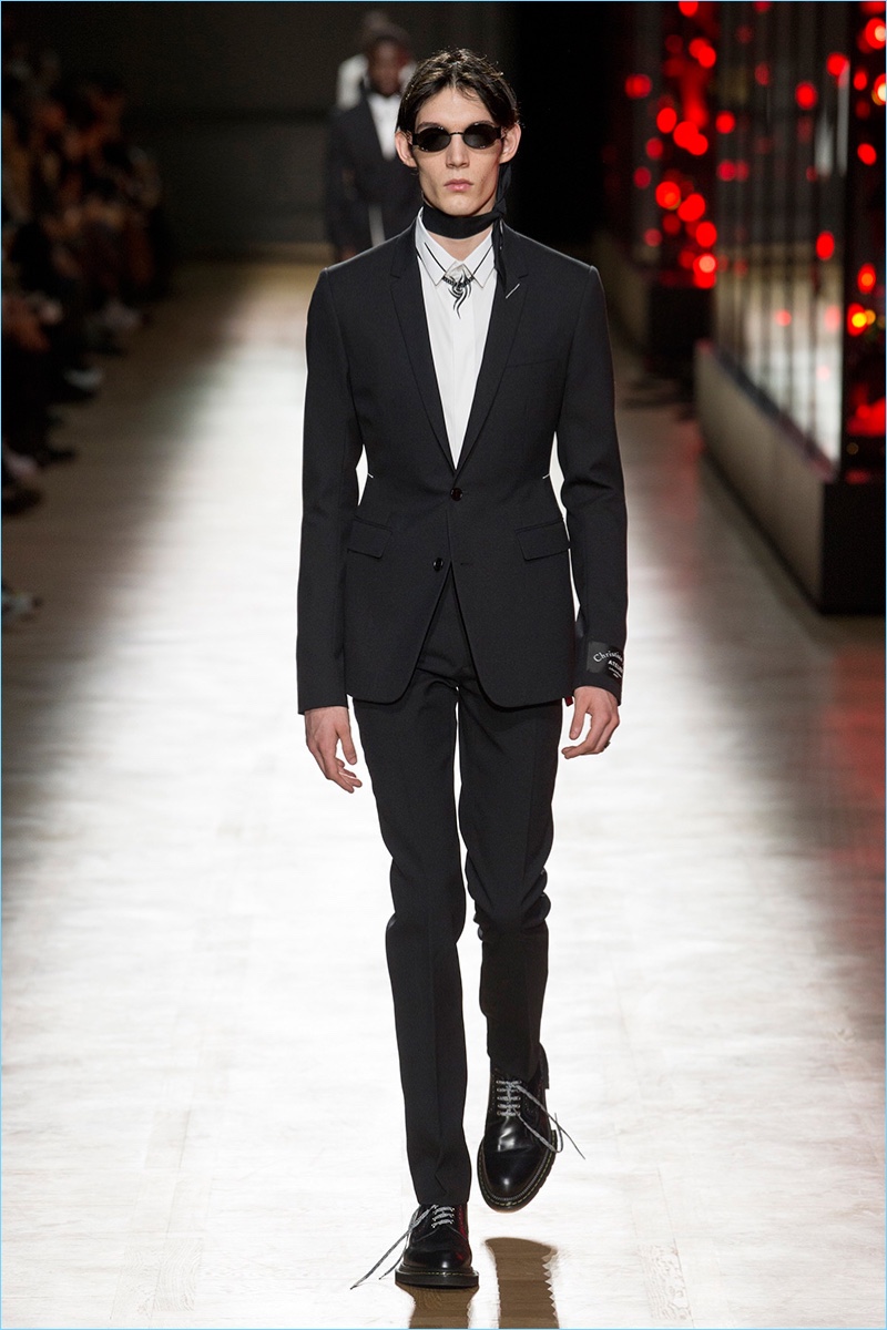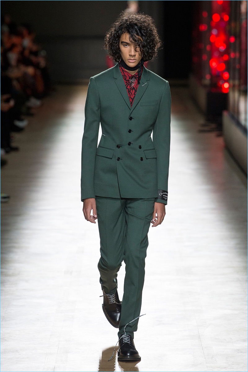Kris Van Assche once again finds inspiration in youth. The Belgian designer marries the freedom of young age with the vision of an adult outsider. Revisiting his dissection of the Dior Homme suit, Van Assche references nineties tattoo culture as he breaks down formal elements into casual alternatives. Black tailored suits open themselves up to shirts and additional sportswear with graphic rave totems and spiked tattoos. Forest green, red, brown, yellow, and blue add color to the lineup as Van Assche explores an urban prowess. Casual wear ranges from tattooed shirts and polos to color contrasted jackets. The Dior man embraces a relaxed silhouette as well with baggy pants. Further highlights include Christian Dior logo t-shirts, double-breasted coats, and cropped nylon parkas.
