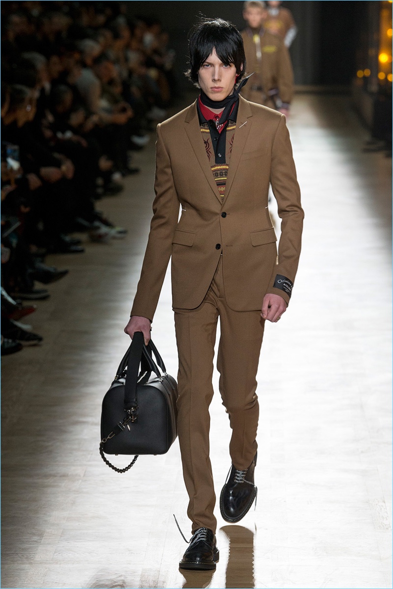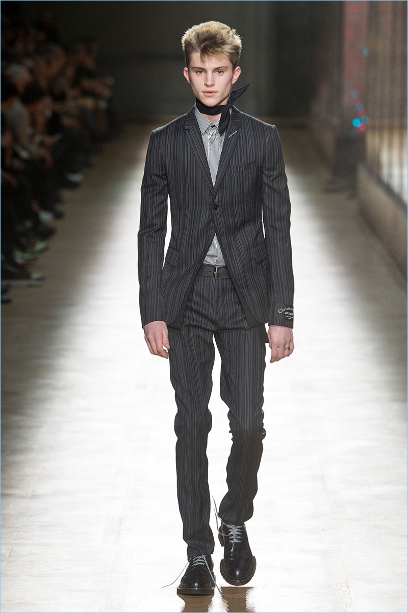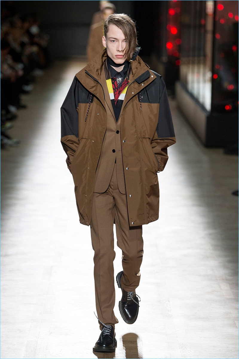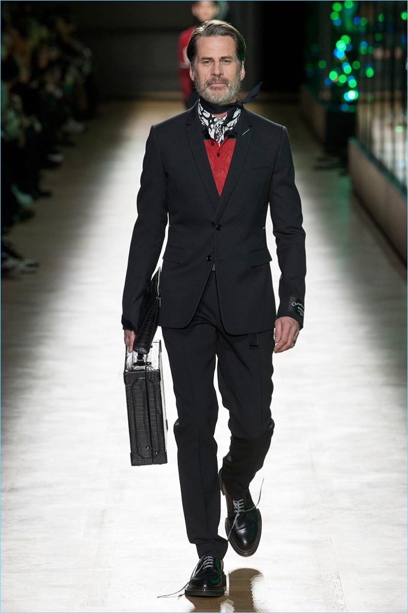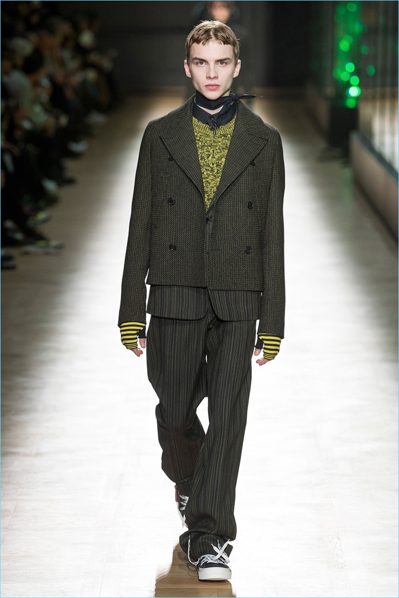 Kris Van Assche once again finds inspiration in youth. The Belgian designer marries the freedom of young age with the vision of an adult outsider. Revisiting his dissection of the Dior Homme suit, Van Assche references nineties tattoo culture as he breaks down formal elements into casual alternatives. Black tailored suits open themselves up to shirts and additional sportswear with graphic rave totems and spiked tattoos. Forest green, red, brown, yellow, and blue add color to the lineup as Van Assche explores an urban prowess. Casual wear ranges from tattooed shirts and polos to color contrasted jackets. The Dior man embraces a relaxed silhouette as well with baggy pants. Further highlights include Christian Dior logo t-shirts, double-breasted coats, and cropped nylon parkas.