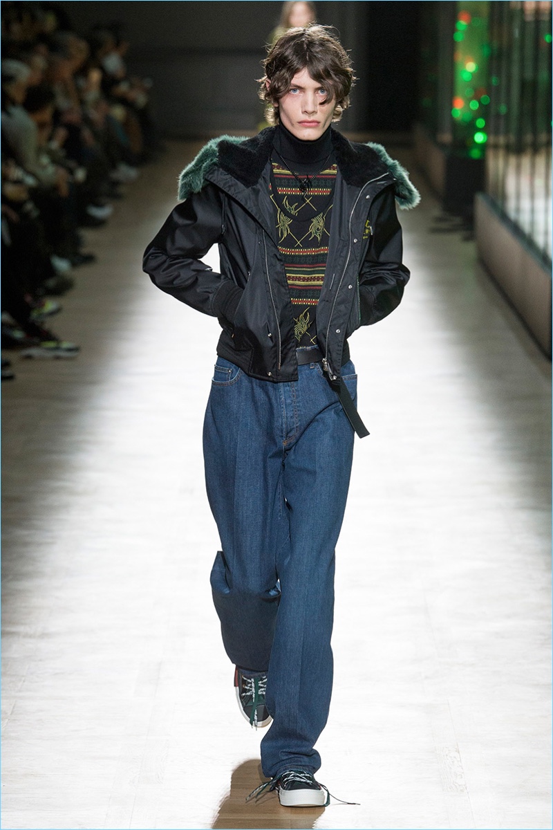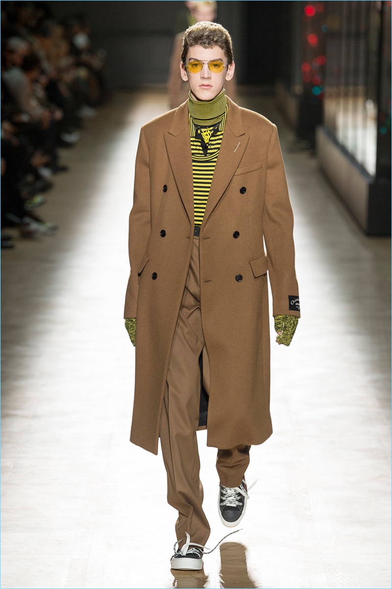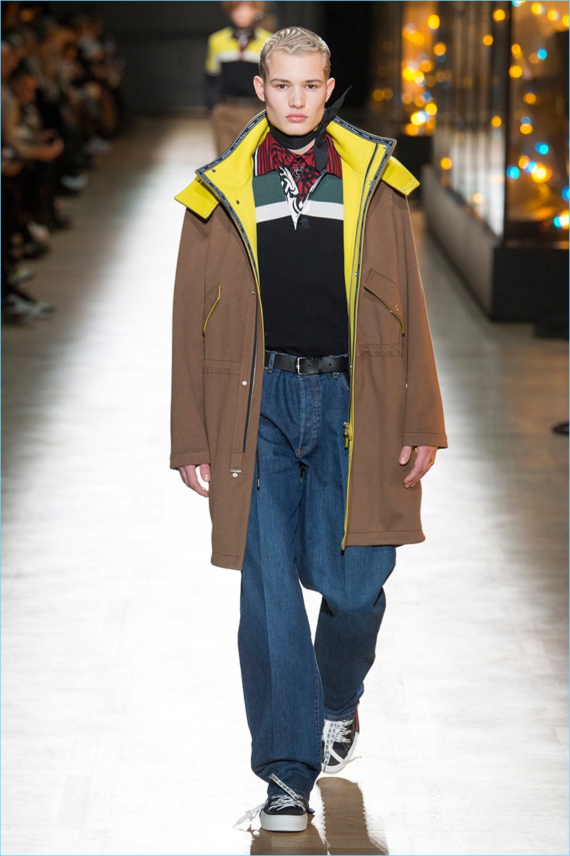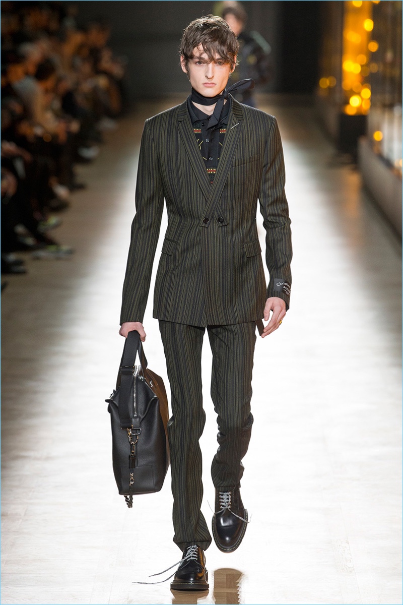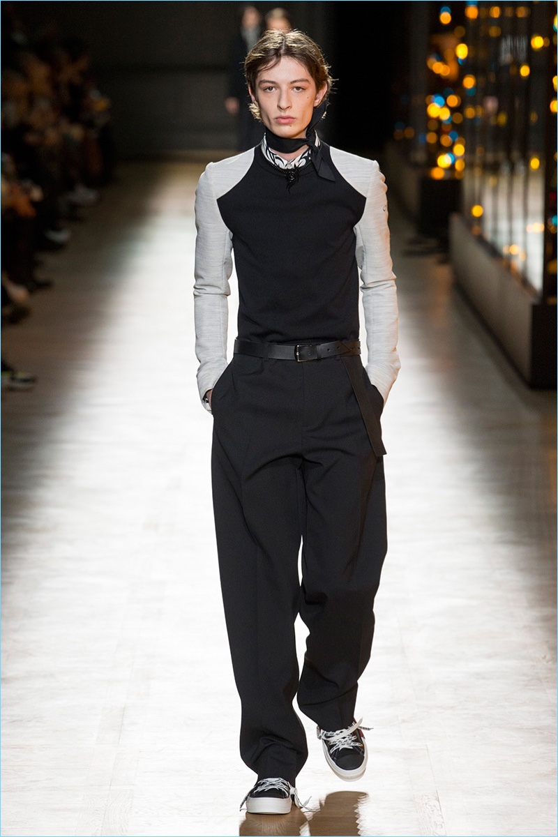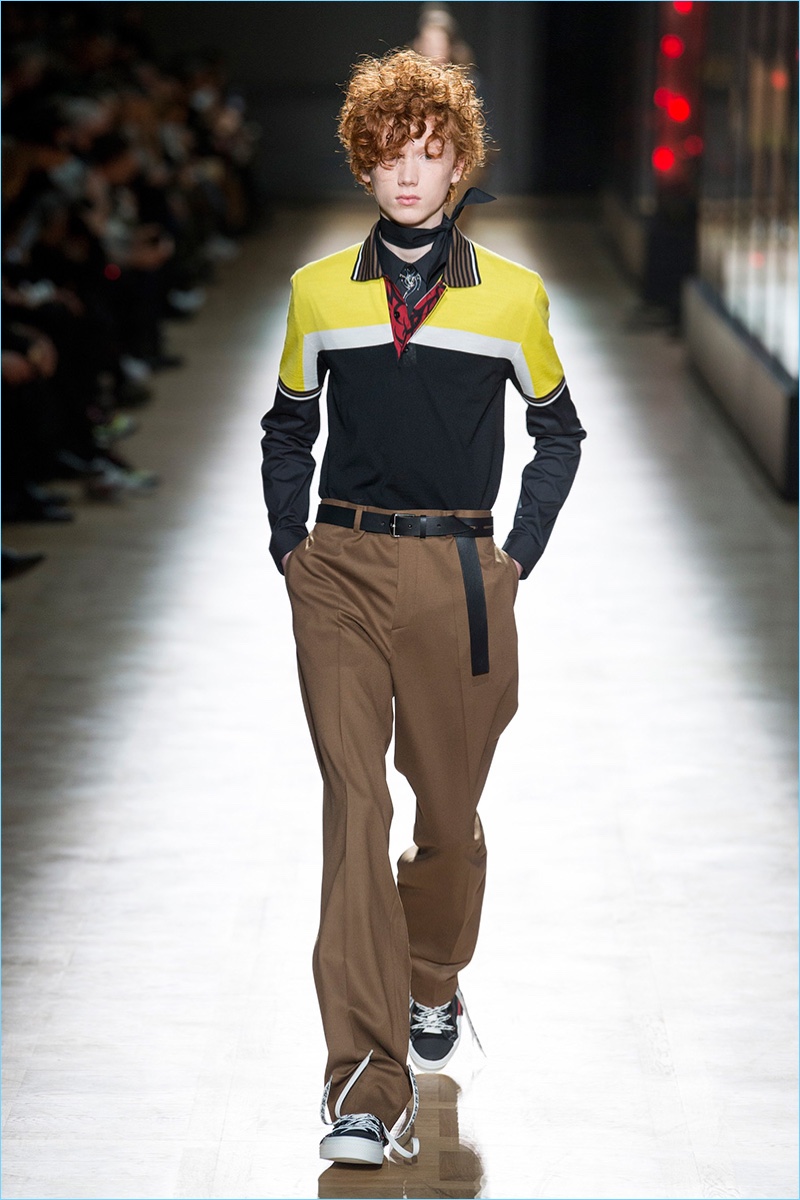 Kris Van Assche once again finds inspiration in youth. The Belgian designer marries the freedom of young age with the vision of an adult outsider. Revisiting his dissection of the Dior Homme suit, Van Assche references nineties tattoo culture as he breaks down formal elements into casual alternatives. Black tailored suits open themselves up to shirts and additional sportswear with graphic rave totems and spiked tattoos. Forest green, red, brown, yellow, and blue add color to the lineup as Van Assche explores an urban prowess. Casual wear ranges from tattooed shirts and polos to color contrasted jackets. The Dior man embraces a relaxed silhouette as well with baggy pants. Further highlights include Christian Dior logo t-shirts, double-breasted coats, and cropped nylon parkas.