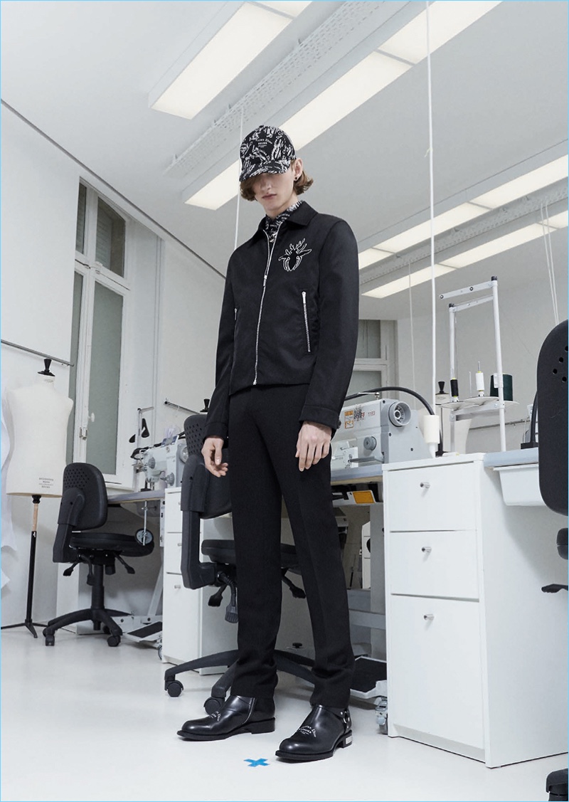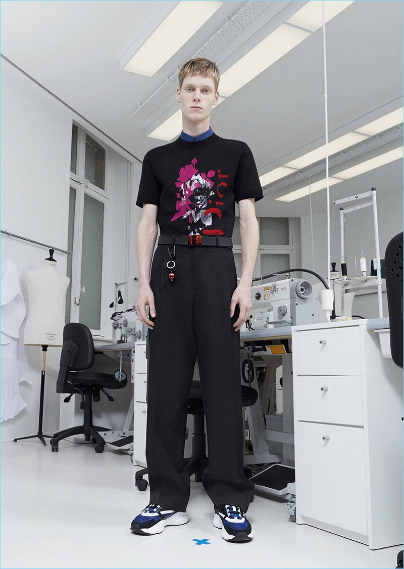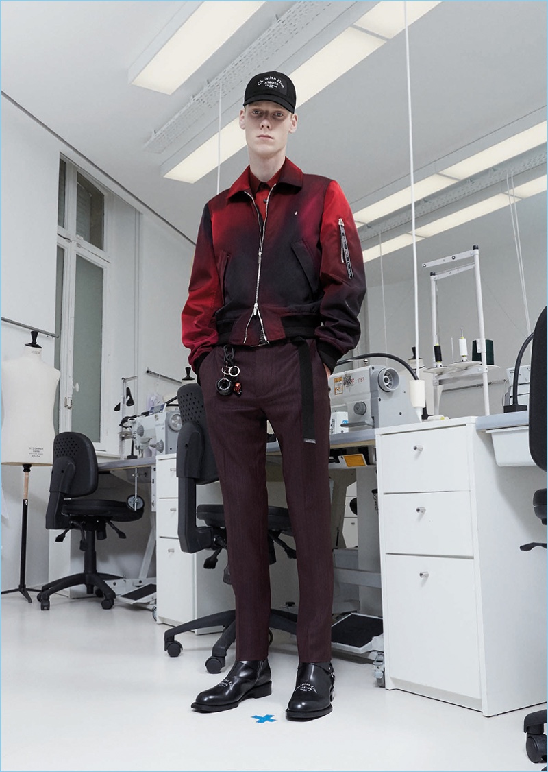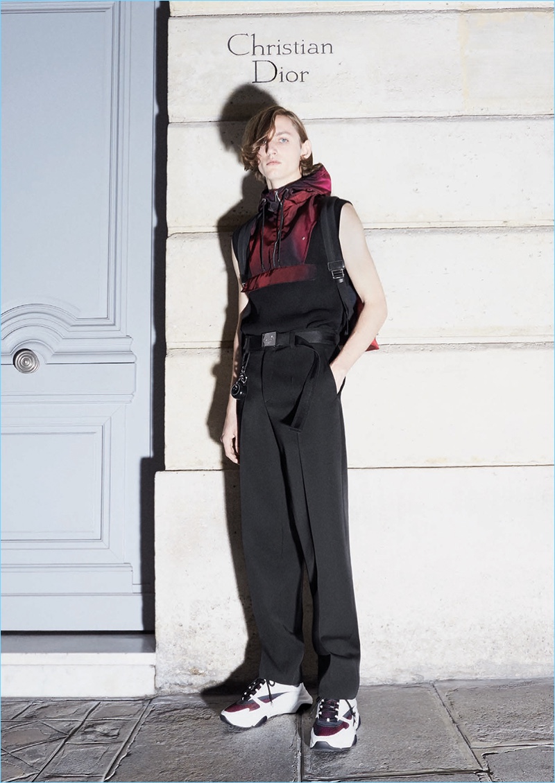Following the news that Kris Van Assche is departing the brand, Dior Homme unveils a new lookbook. The brand paints a dark image with its pre-fall 2018 collection. Tailoring is front and center for the occasion. Deep blue and red accent black as the fashion brand delivers on relaxed tailoring. Pleated trousers and sleek suit jackets join deconstructed essentials. Taking a page from a book of patterns, graphic lines adorn paneled jackets and coats. Meanwhile, a sporty element invades the lineup with graphic tees, casual jackets, and on-trend bags. The Dior man is also treated to gradient prints and high profile sneakers.