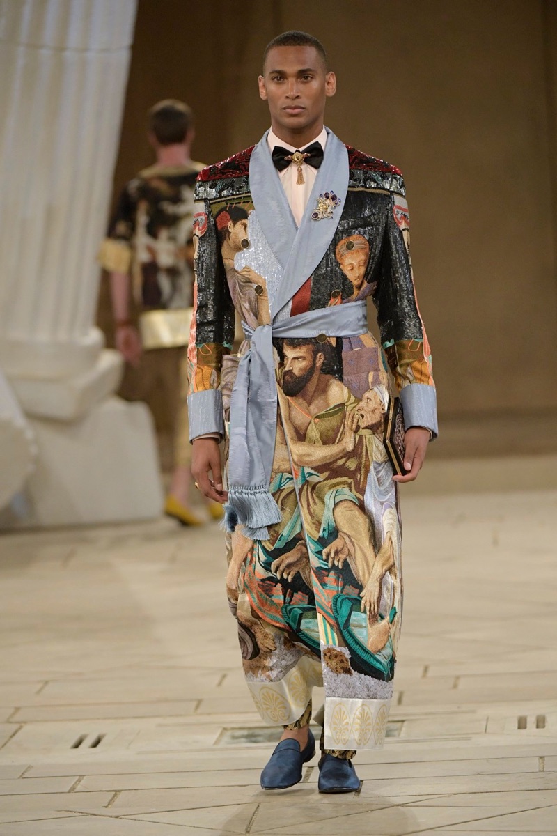 Italian fashion house Dolce & Gabbana dreams up a magical collection for its latest Alta Sartoria outing. Looking to Ancient Greece for inspiration, Dolce & Gabbana’s print savvy menswear indulges in rich Hellenic patterns. Cementing the season’s theme, top models Evandro Soldati, Adam Senn, and Noah Mills even make an appearance in draped tunics. Taking a more practical but nevertheless dandy approach to Hellenic references, embroidered suits, oversized tops, and gladiator sandals contribute to Dolce & Gabbana’s beautiful lineup.