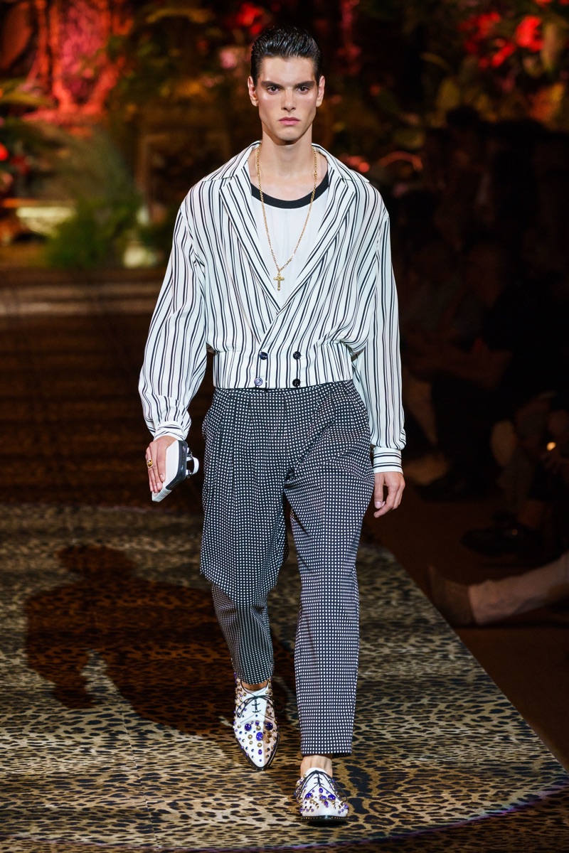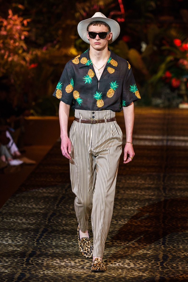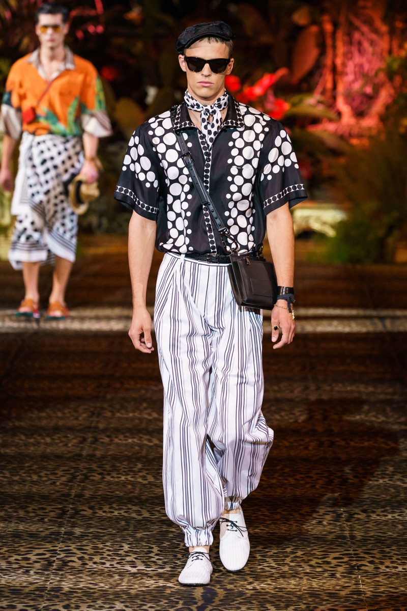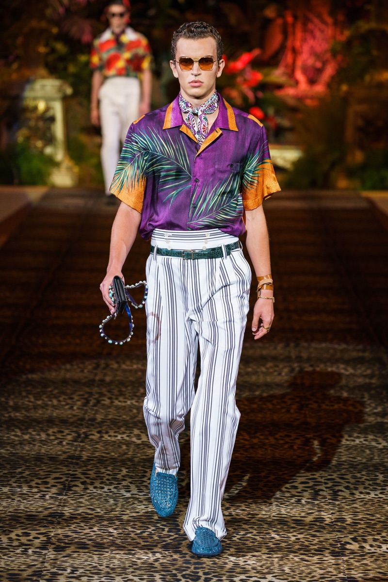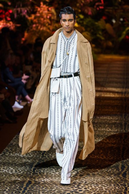 Dolce & Gabbana embraces a tropical safari theme for spring-summer 2020. Offering fresh optics for the season, the luxury fashion house fuses its Italian motifs with tropical undertones. Prim and proper, tailored khakis appear alongside leopard print shirts, jackets, and trousers. Alluding to a tropical getaway, floral shirts enjoy the comfort of oversized proportions. Meanwhile, Dolce & Gabbana revisits polka dots and pinstripes, juxtaposing both classic and trendy fashion ideas. It’s also of note that the label’s interpretation of an iconic style motif acts as a stepping stone for less of a focus on streetwear and a nod to timeless pieces with the occasional statement attire.