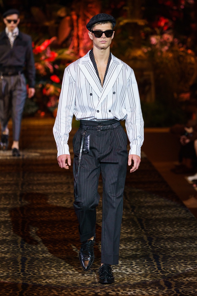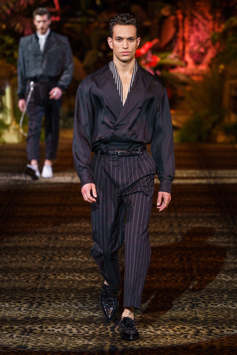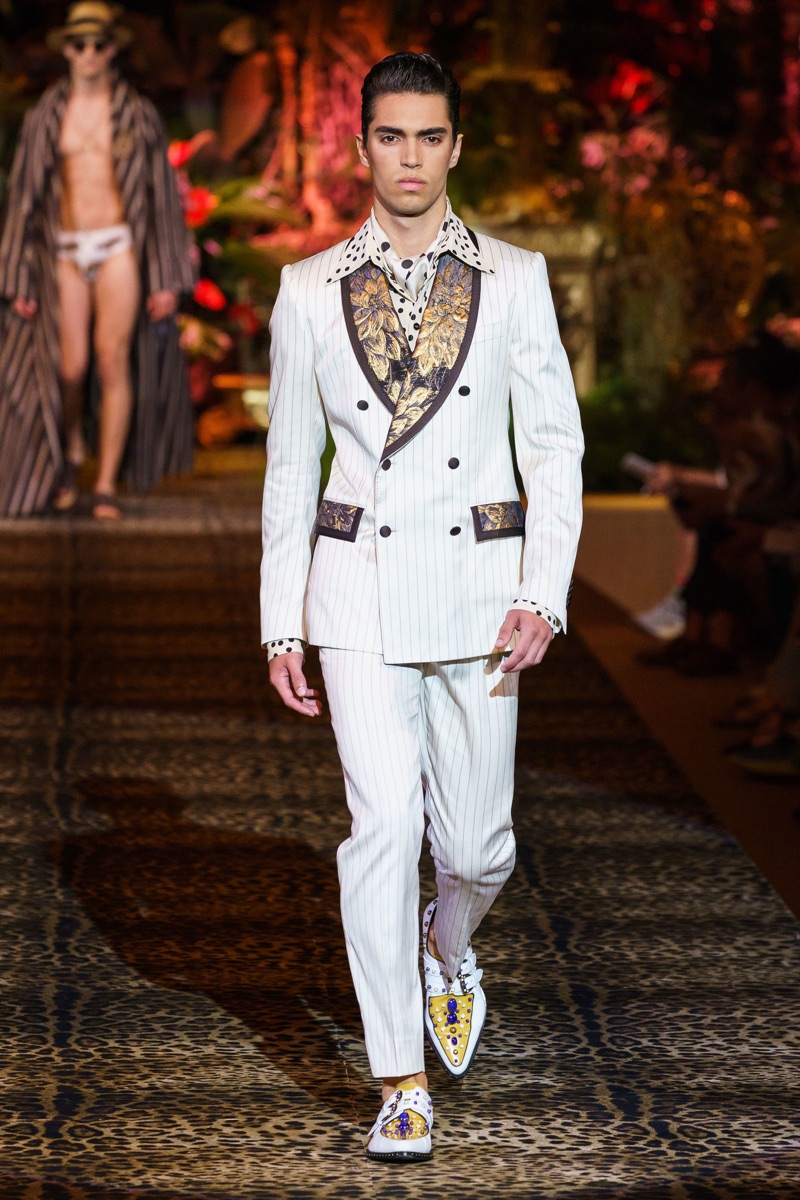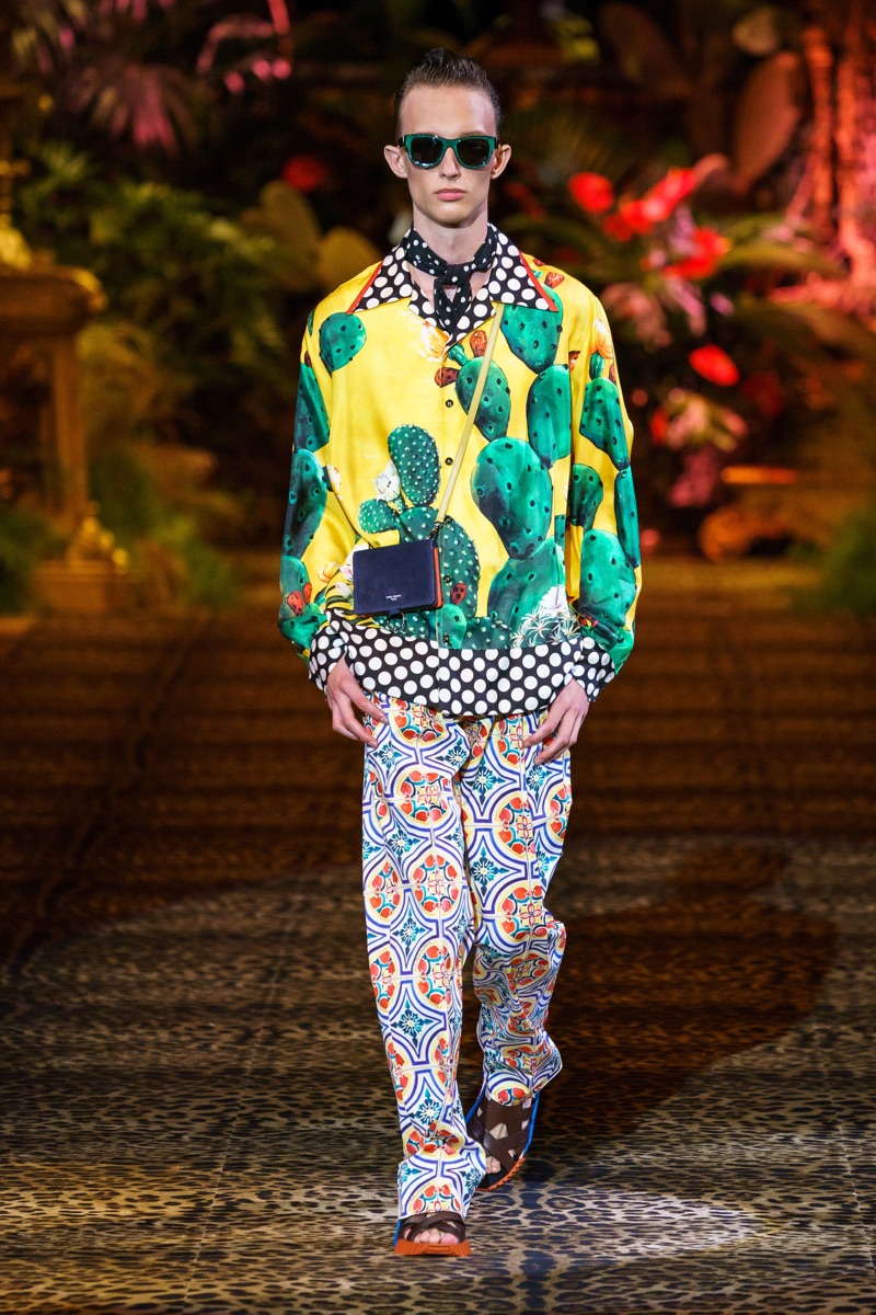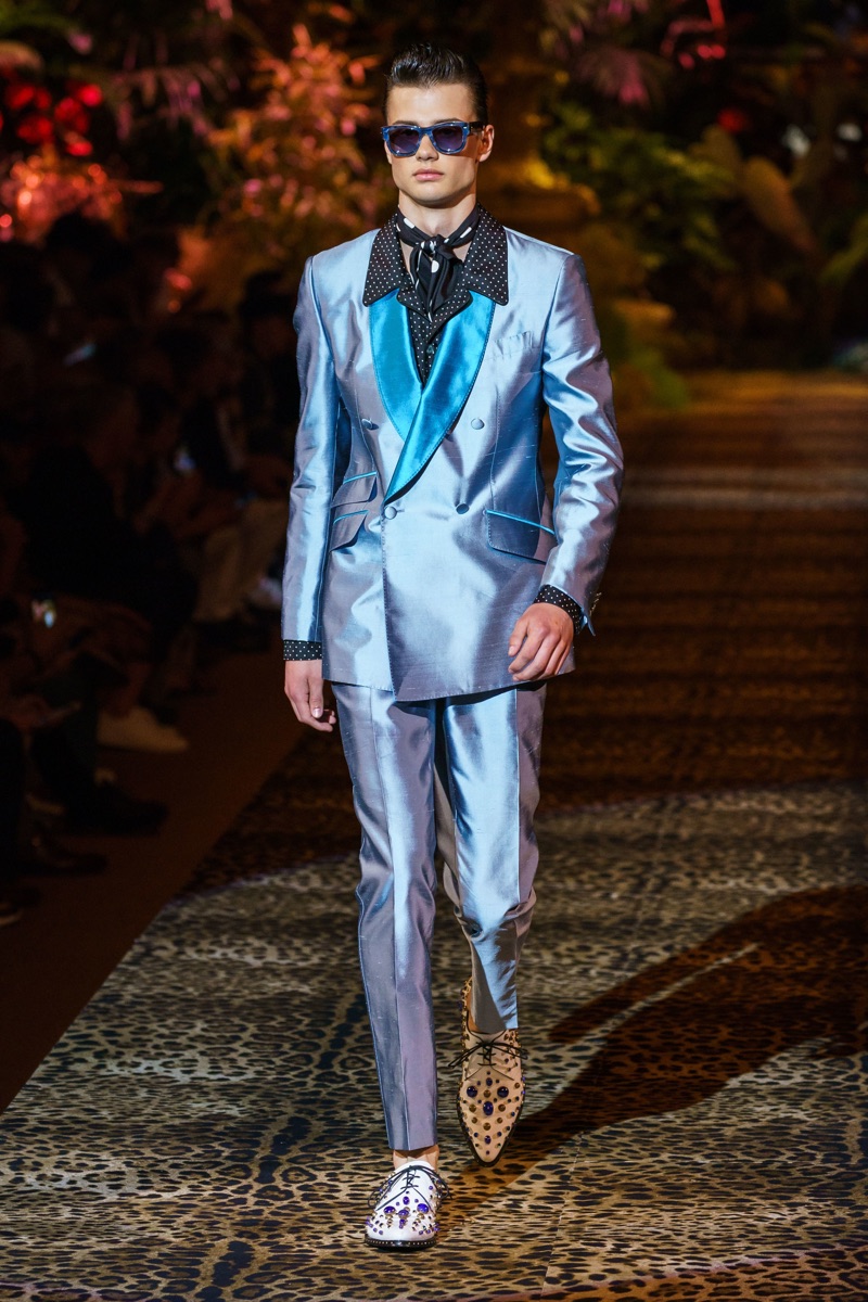 Dolce & Gabbana embraces a tropical safari theme for spring-summer 2020. Offering fresh optics for the season, the luxury fashion house fuses its Italian motifs with tropical undertones. Prim and proper, tailored khakis appear alongside leopard print shirts, jackets, and trousers. Alluding to a tropical getaway, floral shirts enjoy the comfort of oversized proportions. Meanwhile, Dolce & Gabbana revisits polka dots and pinstripes, juxtaposing both classic and trendy fashion ideas. It’s also of note that the label’s interpretation of an iconic style motif acts as a stepping stone for less of a focus on streetwear and a nod to timeless pieces with the occasional statement attire.